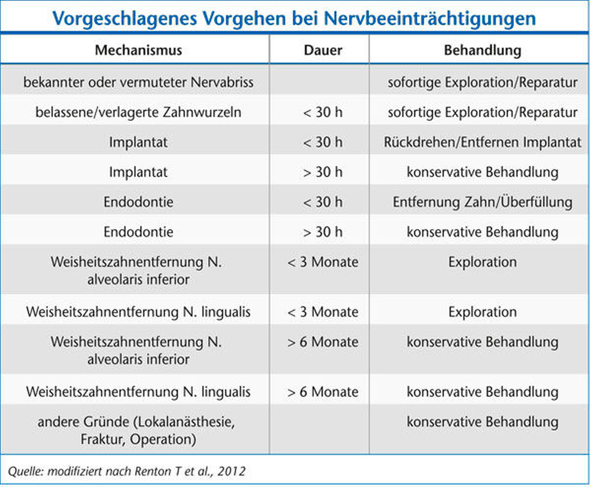 Kompressionen des Nervkanals, beispielsweise nach Weisheitszahnentfernung, durch zahnärztliche Implantate oder auch durch eine endodontische Behandlung stellen iatrogene Nervverletzungen dar, die innerhalb der ersten 24 bis 30 Stunden behoben werden sollten [Renton T, Yilmaz Z, 2012]. Ansonsten ist die Zeit bis zur chirurgischen Therapie ein kontrovers diskutiertes Thema mit unterschiedlichen Ergebnissen. Bei längerer Dauer ebenso wie bei Schädigungen durch die Applikation von Lokalanästhesie oder durch traumatische Kausa, ist die vorerst konservative Behandlung mit einer potenziell folgenden chirurgischen Therapie das Mittel der Wahl. Eine Übersicht der vorgeschlagenen Therapiemodalitäten findet sich in der Tabelle.