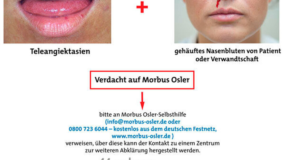 Wenn Sie Patienten mit Teleangiektasien im Mund- und Gesichtsbereich sehen, fragen Sie bitte, ob diese oder Verwandte häufig aus der Nase bluten. Bei Verdacht auf Morbus Osler bitten wir um Information der Patienten, dass eine Abklärung sinnvoll wäre. Der Kontakt zu Zentren kann über die Selbsthilfe hergestellt werden. Bitte denken Sie auch daran, dass beim Morbus Osler Lungengefäßmissbildungen vorliegen können. Solange diese nicht ausgeschlossen sind, ist eine Antibiotikaprophylaxe bei allen Eingriffen mit potenzieller Bakteriämie entsprechend den aktuellen Empfehlungen zur Prophylaxe der infektiösen Endokarditis empfehlenswert. Weitere Informationen finden Sie in der zm 12/2018, S. 88–90, oder können Sie bei der Selbsthilfe oder den Autoren erfragen.