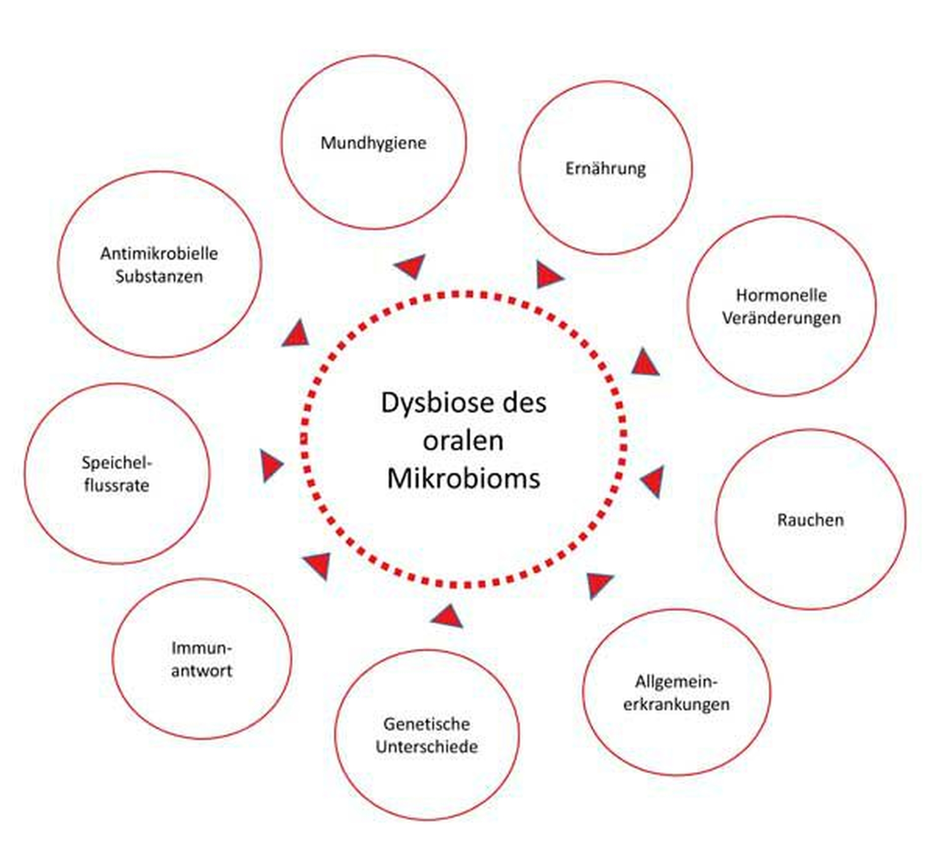 Das orale Mikrobiom (www.homd.org) in der Mundhöhle besiedelt eine Reihe ganz unterschiedlicher Habitate – zum Beispiel Zähne, Zunge, Wangen. Zähne sind die einzige nicht-abschilfernde Oberfläche im menschlichen Körper und bieten günstige Bedingungen für eine Biofilmbildung. Der Speichel und die gingivale Sulkusflüssigkeit bieten Nährstoffe für das Bakterienwachstum, enthalten aber auch antibakteriell wirksame Komponenten [Kilian et al., 2016]. Das komplexe Gleichgewicht zwischen den verschiedenen bakteriellen Spezies in der Mundhöhle ist verantwortlich für die Erhaltung eines gesunden Zustands – in Symbiose – oder für einen Zustand – in Dysbiose –, der mit Erkrankung assoziiert ist [Marsh & Zaura, 2017]. Eine ganze Reihe von Einflüssen können eine Störung des Ökosystems im Mund bewirken und eine Veränderung in Richtung zu einer Dysbiose verursachen (Abbildung 3) [Hajishengallis & Lamont, 2016]. Diese Vorstellung beruht auf der sogenannten „ökologischen Plaquehypothese“, die beinhaltet, dass veränderte lokale Umweltbedingungen die Vermehrung derjenigen Mikroorganismen begünstigen, die dieser Umwelt am besten angepasst sind (Abbildung 4) [Marsh, 2003].