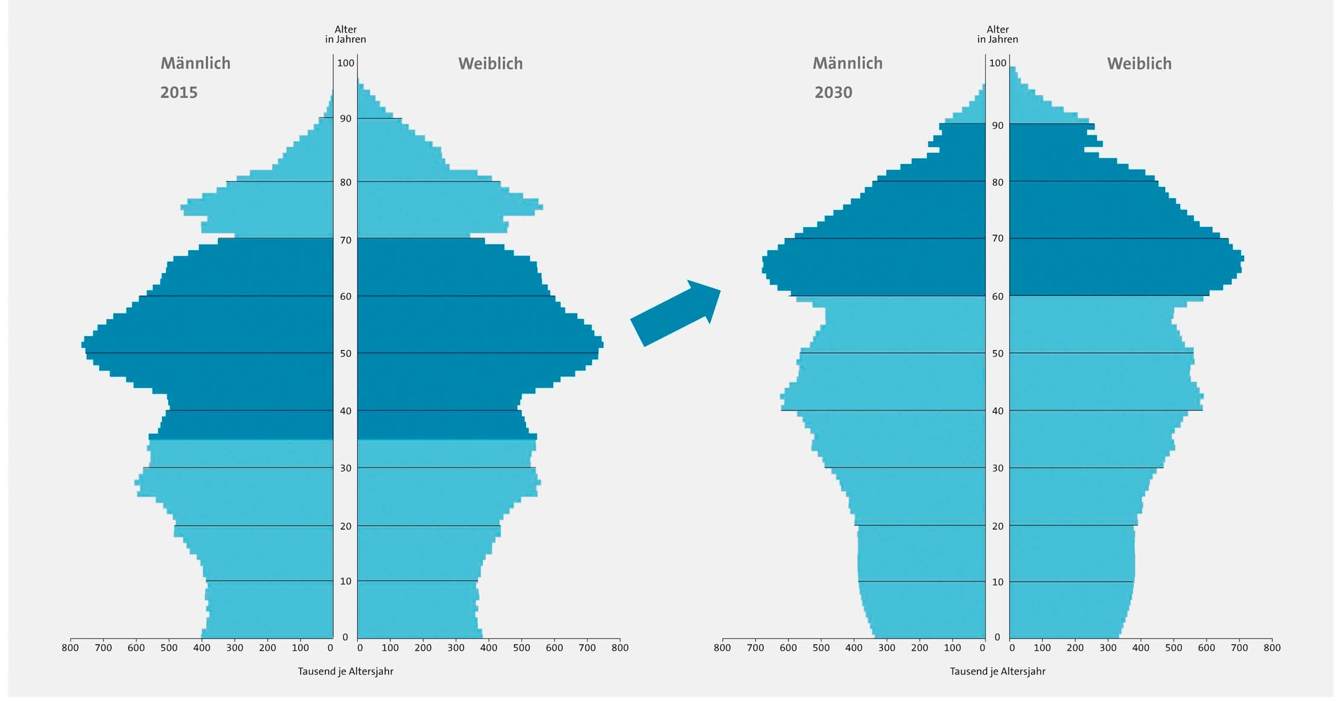 Ältere Patienten sind häufig an einer oder mehreren NCDs erkrankt. Zugleich steigt die Parodontitisprävalenz mit zunehmendem Lebensalter an [DMS V]. Aufgrund des zunehmenden Zahnerhalts bis ins höhere Lebensalter und des demografischen Wandels wird der parodontale Behandlungsbedarf in Deutschland noch steigen (Abbildung 6). Vor diesem Hintergrund sind die Zusammenhänge von Altern, Parodontitis und Immunstatus von Bedeutung.
