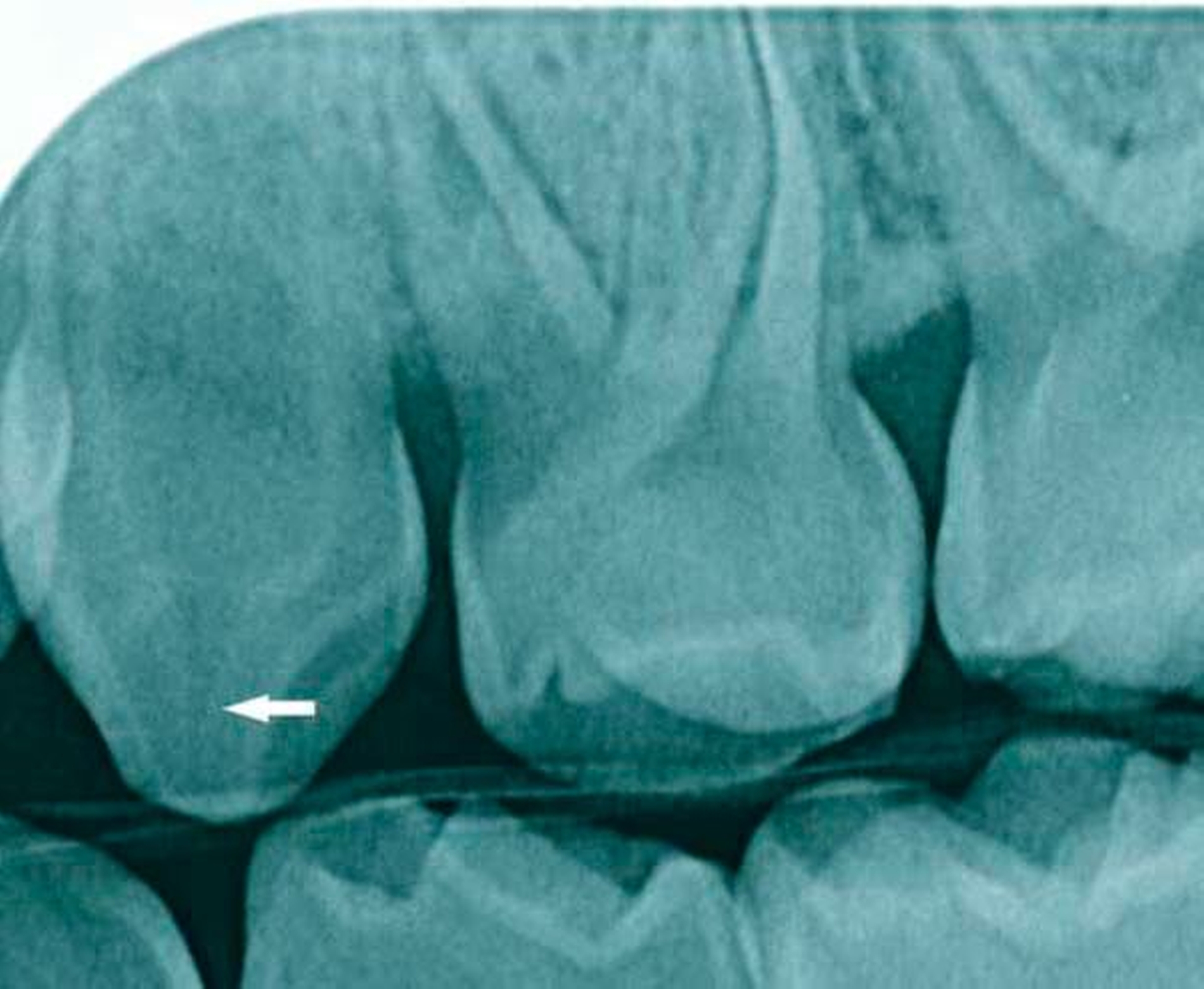 Ein dreijähriges Mädchen wird mit einem beginnenden Abszess der linken Fossa canina vorstellig. Klinisch zeigen die Zähne keinerlei kariöse Läsionen, die Ursache ist unklar. Radiologisch fällt ein ausgedehntes Pulpenhorn am Zahn 63 auf. Die Patientin ist insgesamt für ihr Alter eher kleinwüchsig. Allgemein anamnestisch liegt eine X-chromosomale Hypophosphatämie (Phosphatdiabetes) vor.