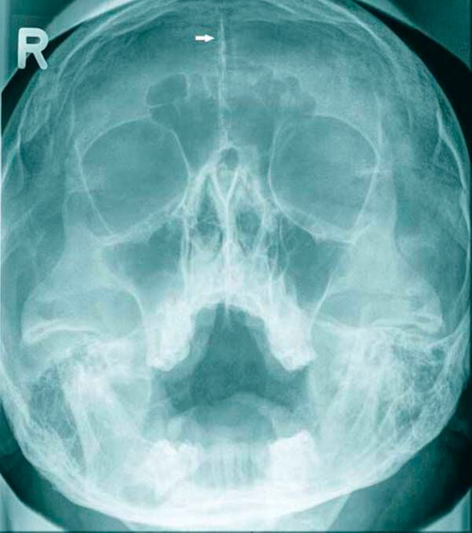 Zur weiteren Beurteilung der Ausdehnung des Befunds wurde eine Nasennebenhöhlenaufnahme veranlasst (Abbildung 2). Darin zeigte sich eine deutlich sichtbare Verkalkung der Falx cerebri, was den klinischen Verdacht eines Gorlin-Goltz-Syndroms nach den Evans-Kriterien (Tabelle 1) [Evans et al.] bestätigte. Ein weiteres auffälliges Merkmal: ein vergrößerter Augenabstand (Hypertelorismus). Weitere, angeborene Fehlbildungen lagen nicht vor, die Familienanamnese war negativ.