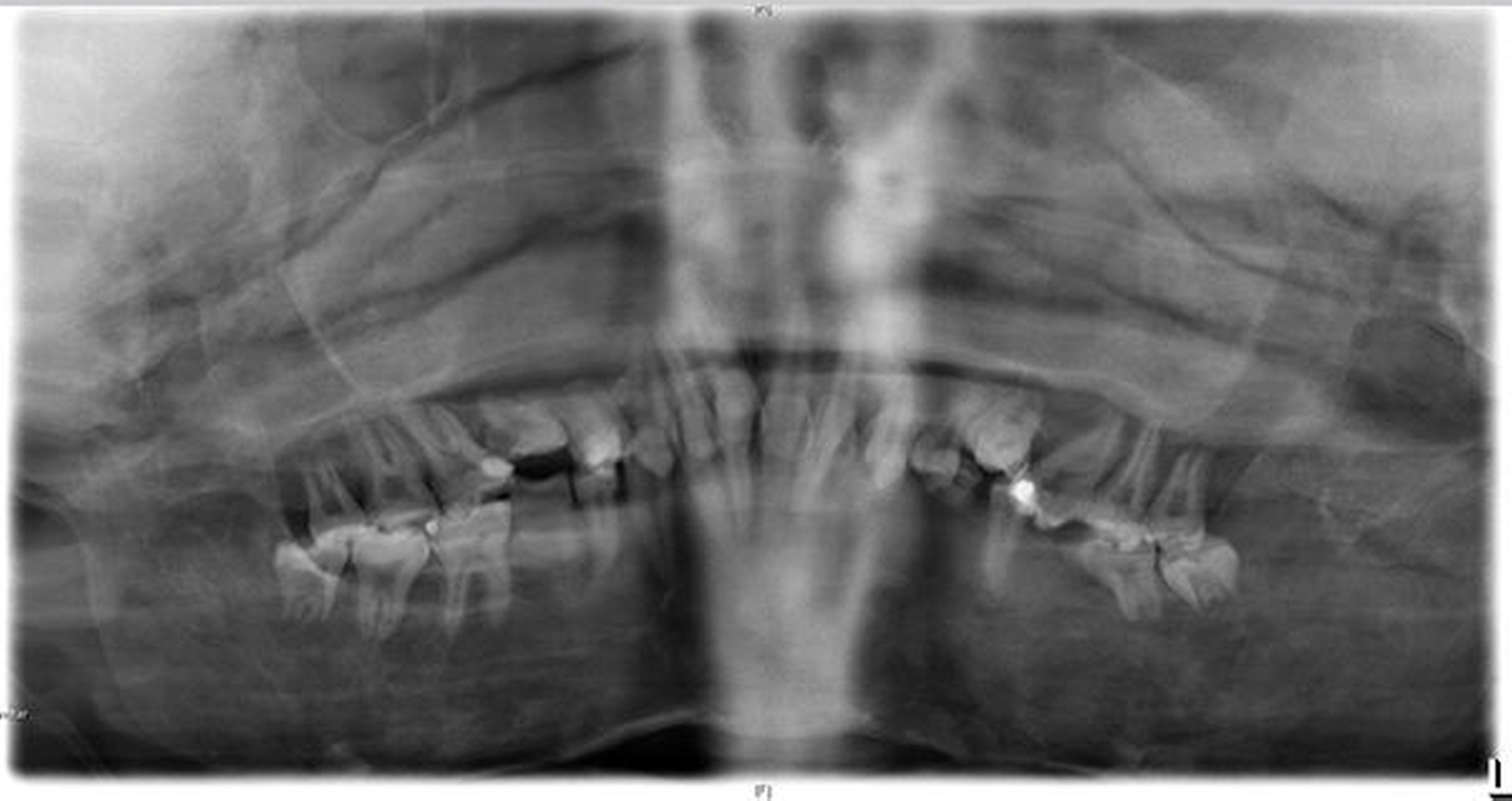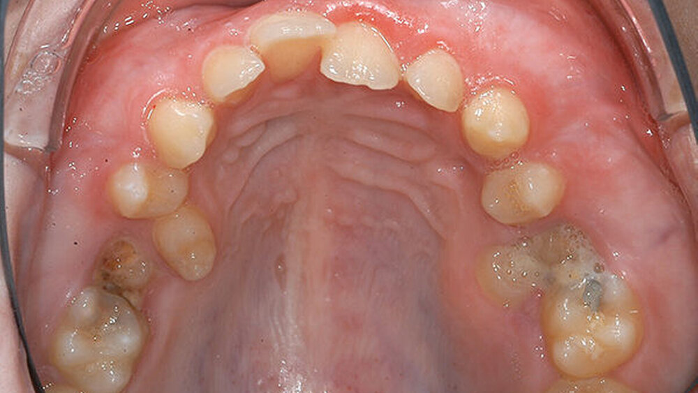 Eine 17-jährige Patientin wurde im Januar 2016 in der Spezialsprechstunde „Seltene Erkrankungen mit oraler Beteiligung“ in der Poliklinik der Klinik für Mund-, Kiefer- und Gesichtschirurgie am Universitätsklinikum Münster mit den noch persistierenden Milchzähnen 55 und 65 sowie einer kariösen Läsion mesial an 16 vorstellig. Die Prämolaren 15 und 25 waren nach palatinal durchgebrochen, im Bereich des persistierenden Milchzahns 65 trat Pus aus, der gesamte Oberkiefer erschien voluminös aufgetrieben (Abbildung 1).