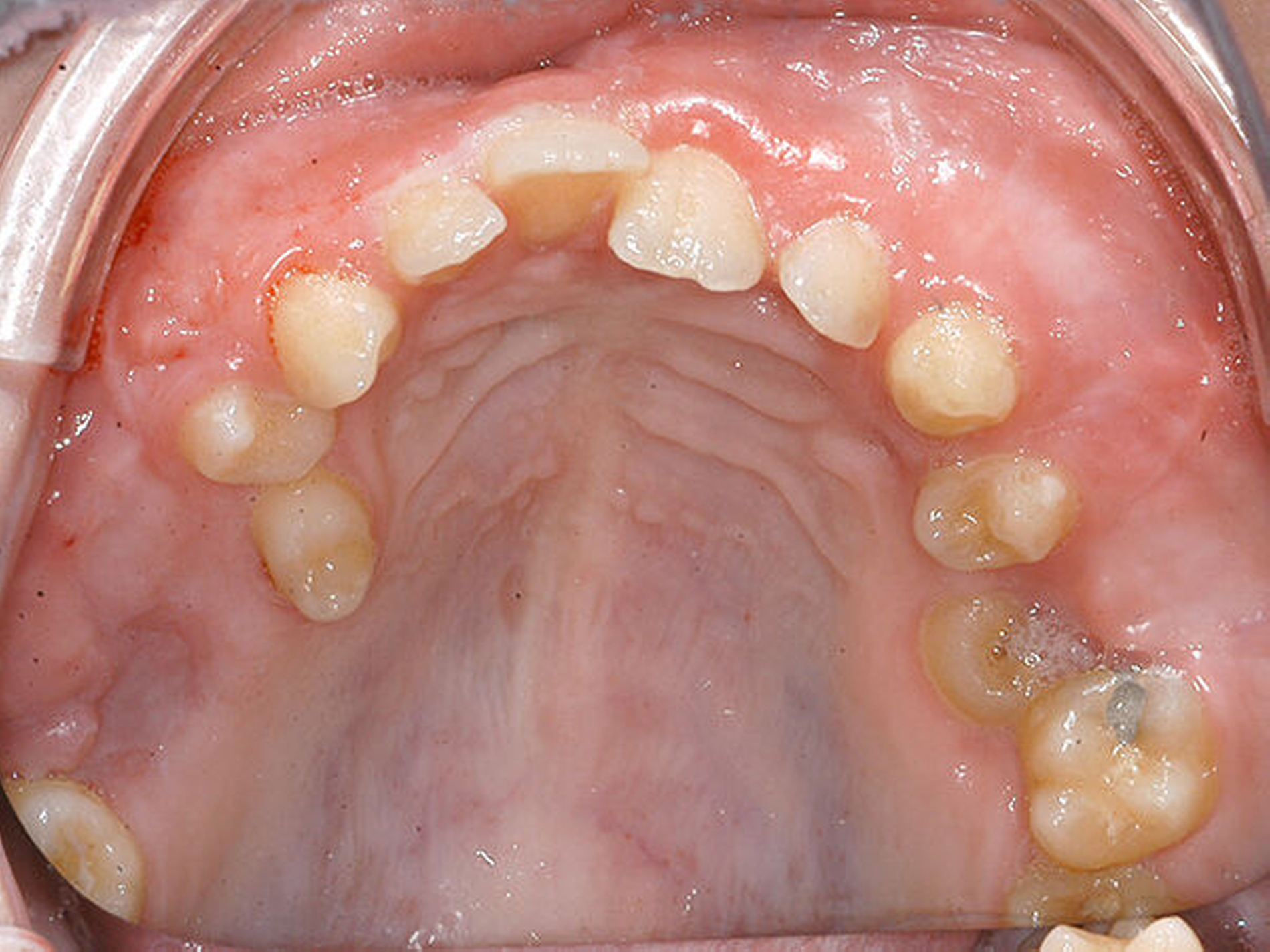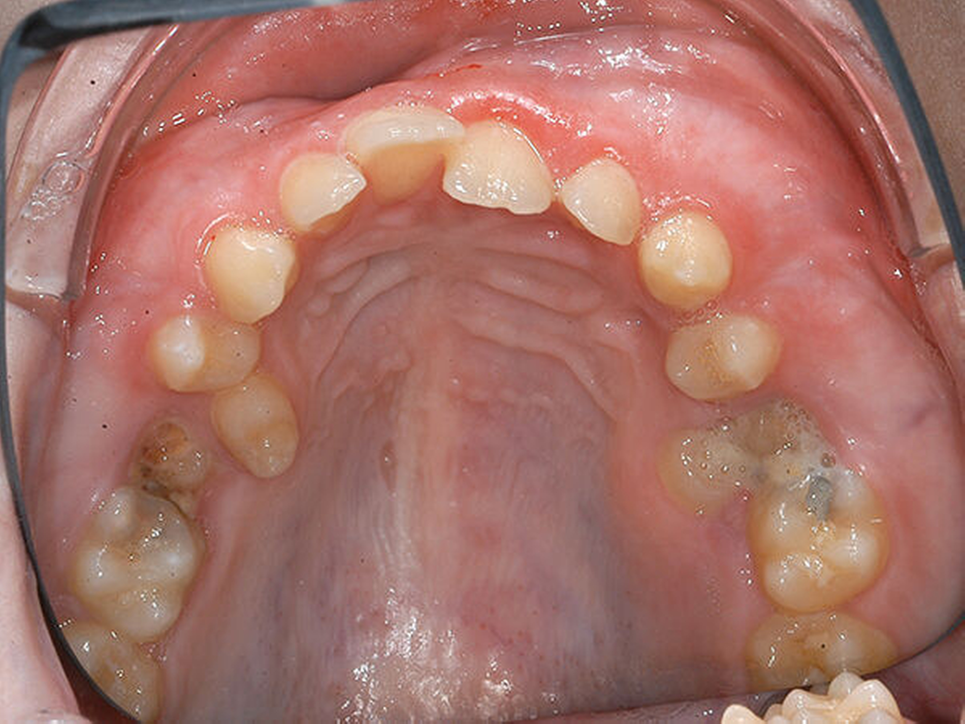 Aufgrund der Pus-Bildung in regio 65, des palatinalen Durchbruchs der Zähne 15 und 25 sowie der kariösen Schädigung des Zahns 16 und der zu erwartenden weiteren Schädigung an 26 erfolgte die Entscheidung, die Zähne 55 und 65 zu entfernen. Die subgingivale, kariöse Läsion an Zahn 16 konnte nicht mehr restauriert werden, so dass auch dieser Zahn als nicht erhaltungswürdig eingestuft wurde und ebenfalls entfernt werden sollte.