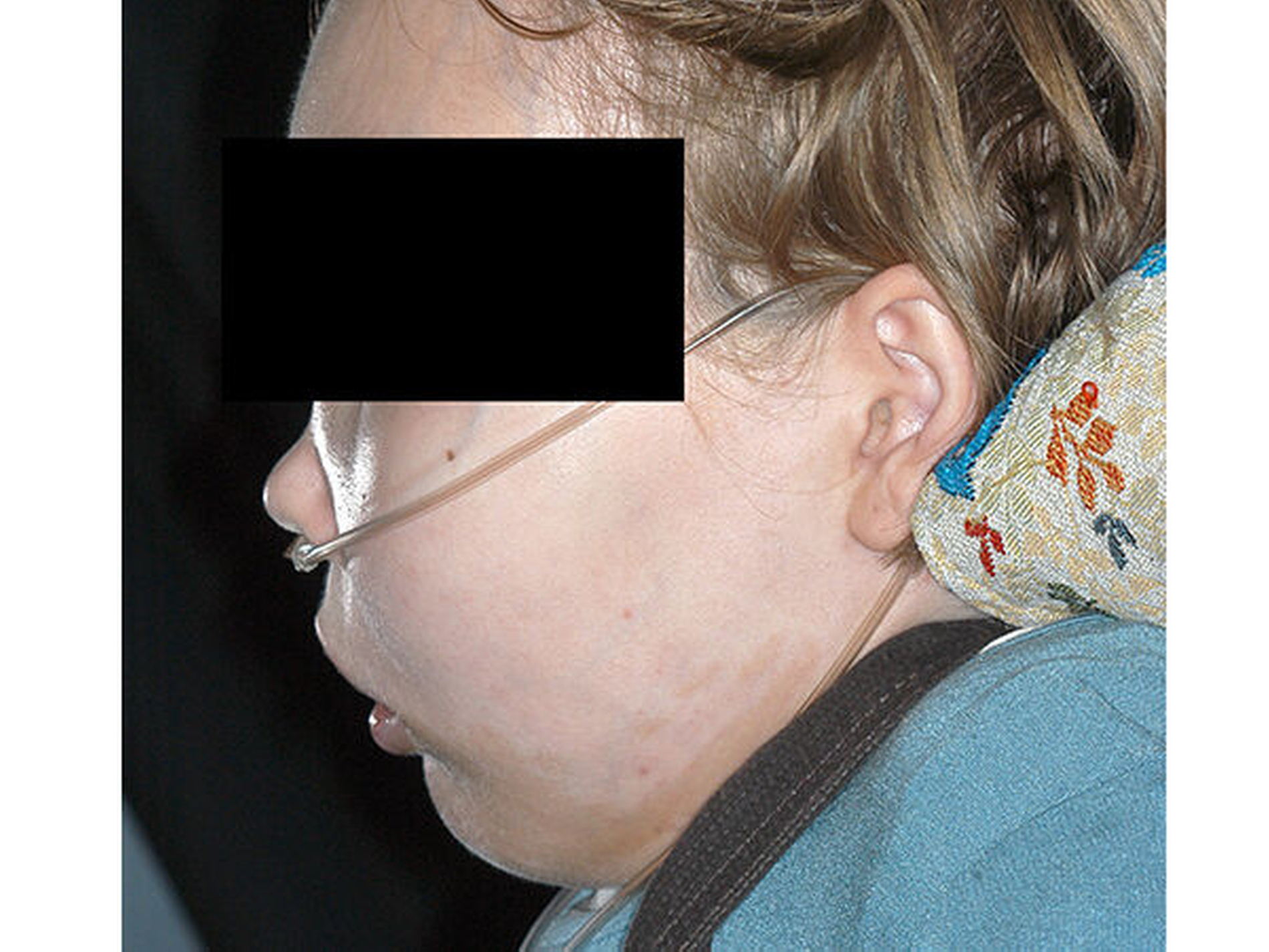 Als Grunderkrankung war bei der Frau das McCune-Albright-Syndrom mit polyostotischer fibröser Dysplasie bekannt, die charakteristischen Café-au-lait-Flecken stellten sich deutlich im Bereich des Kinns dar (Abbildung 2). Des Weiteren trug sie wegen der ausgeprägten lumbalen Hyperlordose und der thorakolumbalen, rechtskonvexen Skoliose ein Korsett.