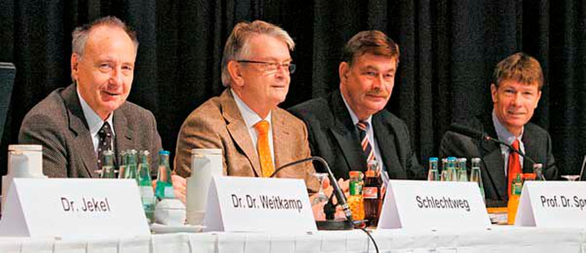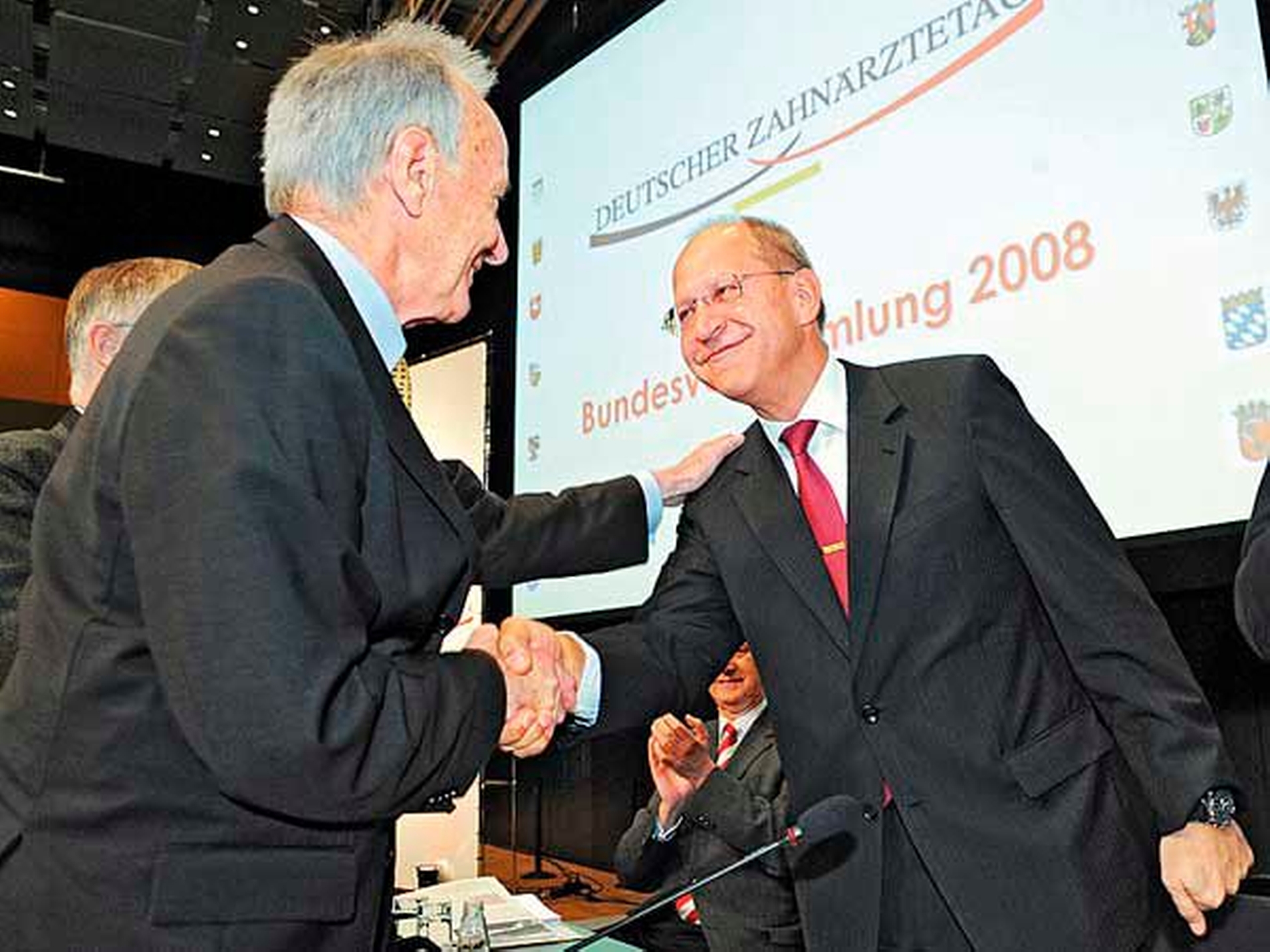 Als mit der Wahl von Dr. Peter Engel zu seinem Nachfolger 2008 in Stuttgart die Ära Weitkamp endet, dankt ihm die Zahnärzteschaft mit der Ernennung zum Ehrenpräsidenten und stehenden Ovationen.