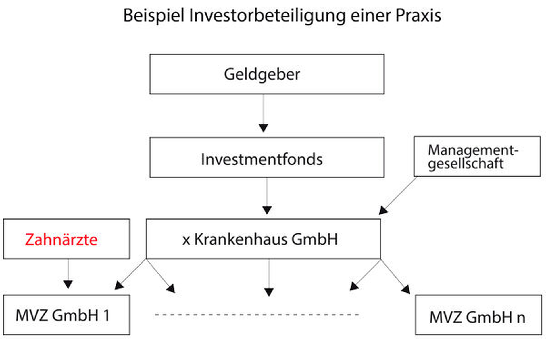 Die Managementgesellschaft erwirbt im Auftrag und mit dem Geld der Investoren ein Krankenhaus, das an der kassenärztlichen Versorgung teilnimmt. Dies darf sich gemäß § 95 SGB V auch an MVZ (medizinisch und zahnmedizinisch) beteiligen oder solche betreiben. An MVZ GmbHs mit Investoren sind oft auch Zahnärzte beteiligt, jedoch in aller Regel als Minderheitsgesellschafter und damit ohne beherrschenden Einfluss (Grafik 1).