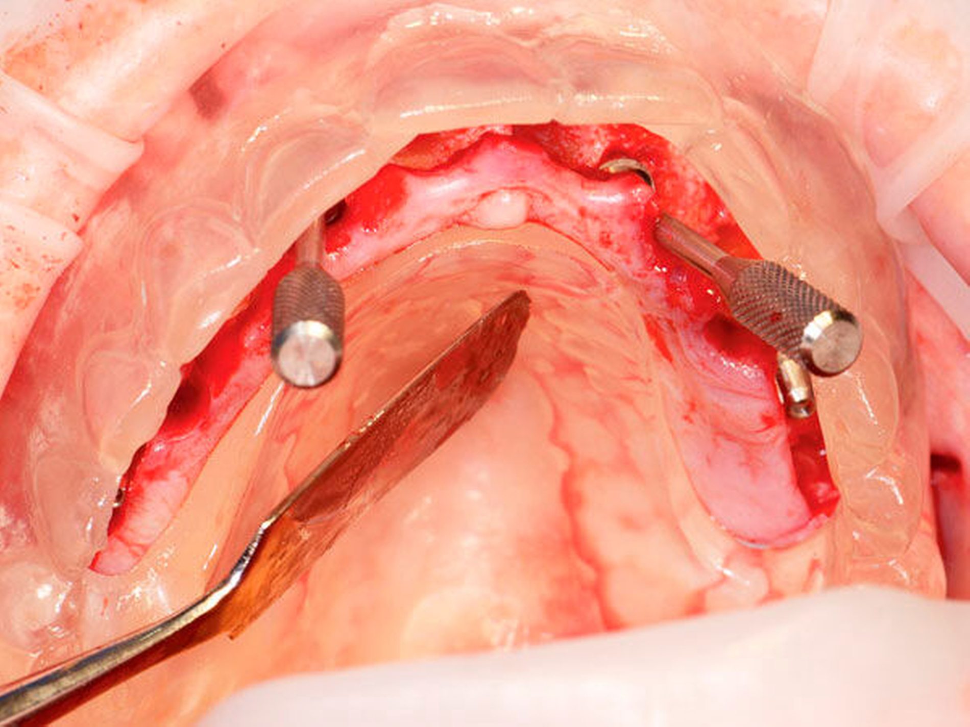 Nach der Darstellung des Kiefers wird im Unterkiefer das Foramen mentale beziehungsweise im Oberkiefer die mesiale Kieferhöhlenwand durch eine kleine Perforation dargestellt. Eine senkrecht zur Gesichtshorizontalen eingebrachte Orientierungsschablone (Abbildung 1) dient bei der Insertion der in einem Winkel von 30° bis 45° angulierten distalen Implantate sowie bei der Positionierung der Abutments als Hilfe. Die Orientierung der vorderen Implantate sowie die Auswahl der Abutments wird mithilfe der im Vorfeld hergestellten Schablone aus transparenten Kunststoff durchgeführt (Abbildung 2), die auch als Schablone für die Bissnahme dient. Die Abutments stehen in verschiedenen Winkelungen zur Verfügung und gleichen die Neigung der Implantate aus. Der durch die Nivellierung des Kiefers gewonnene Knochen kann an anderer Stelle als Aufbau genutzt werden, um eine Kieferform zu erreichen die als Basis für eine hygienefähige festsitzende Versorgung dienen kann. Die Implantation selbst wird jedoch grundsätzlich im ortsständigen Knochen durchgeführt.