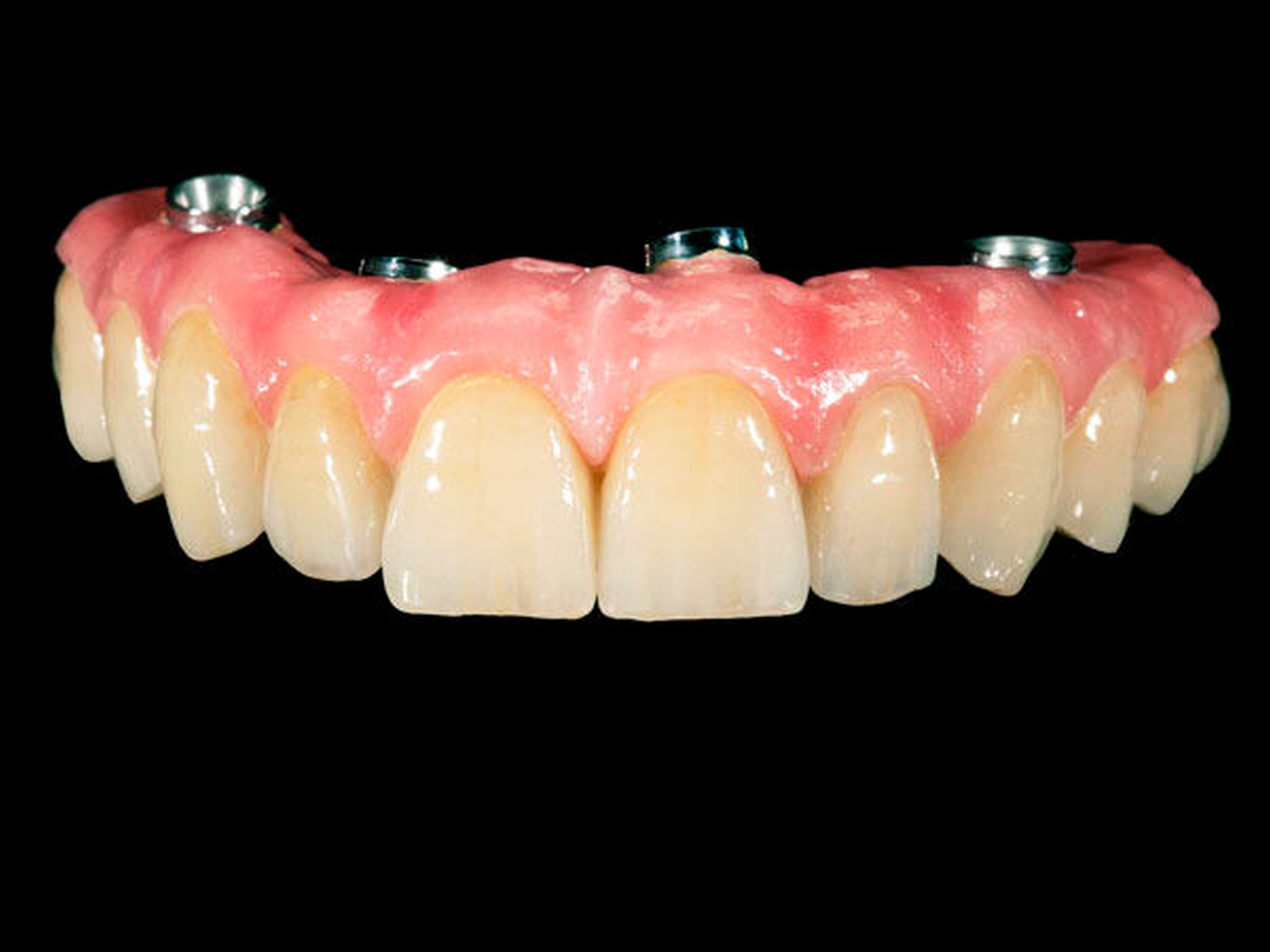 2. Phase: Gemäß unserem Protokoll wird nach frühestens sechs Monaten eine definitive Versorgung hergestellt, die mit einem im CAD/CAM-Verfahren hergestellten Titangerüst verstärkt ist und durch beidseitige Freienden typischerweise zwölf Zähne ersetzt. Hier gibt es die Möglichkeit zur Herstellung einer Brücke mit aufgestellten Kunststoffzähnen (Abbildung 3) oder individuell hergestellten, keramischen Einzelkronen (Abbildung 4).