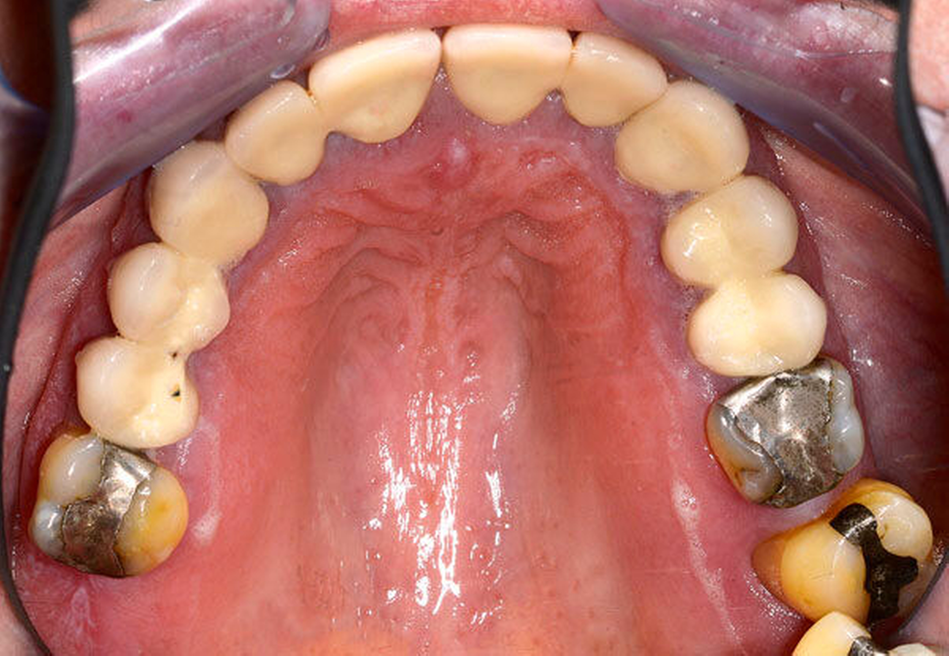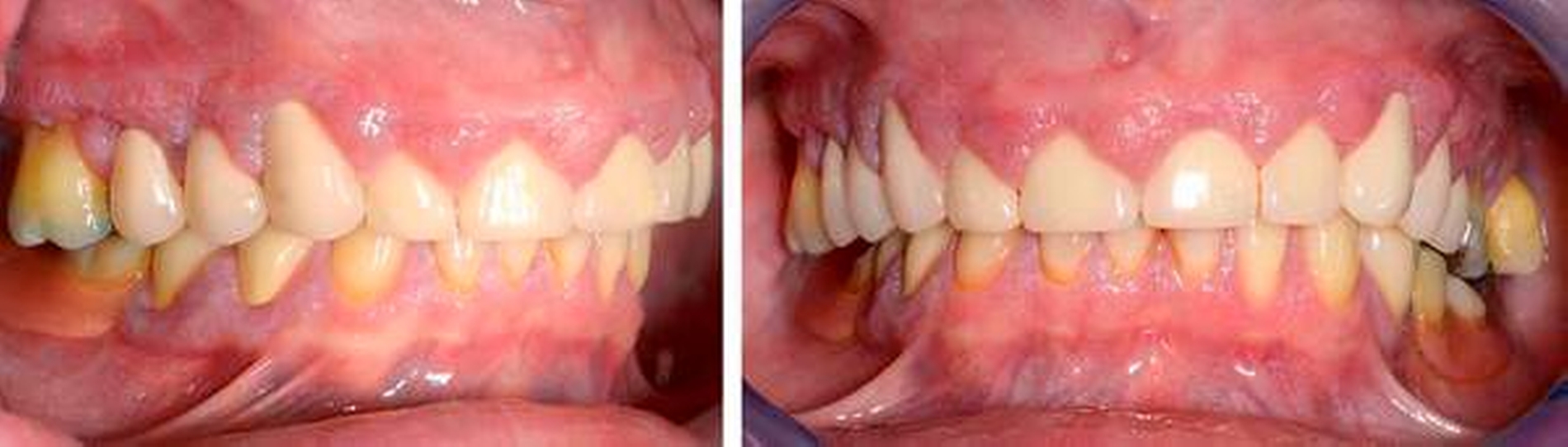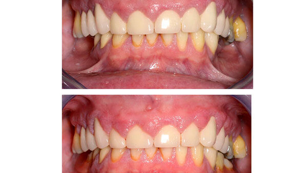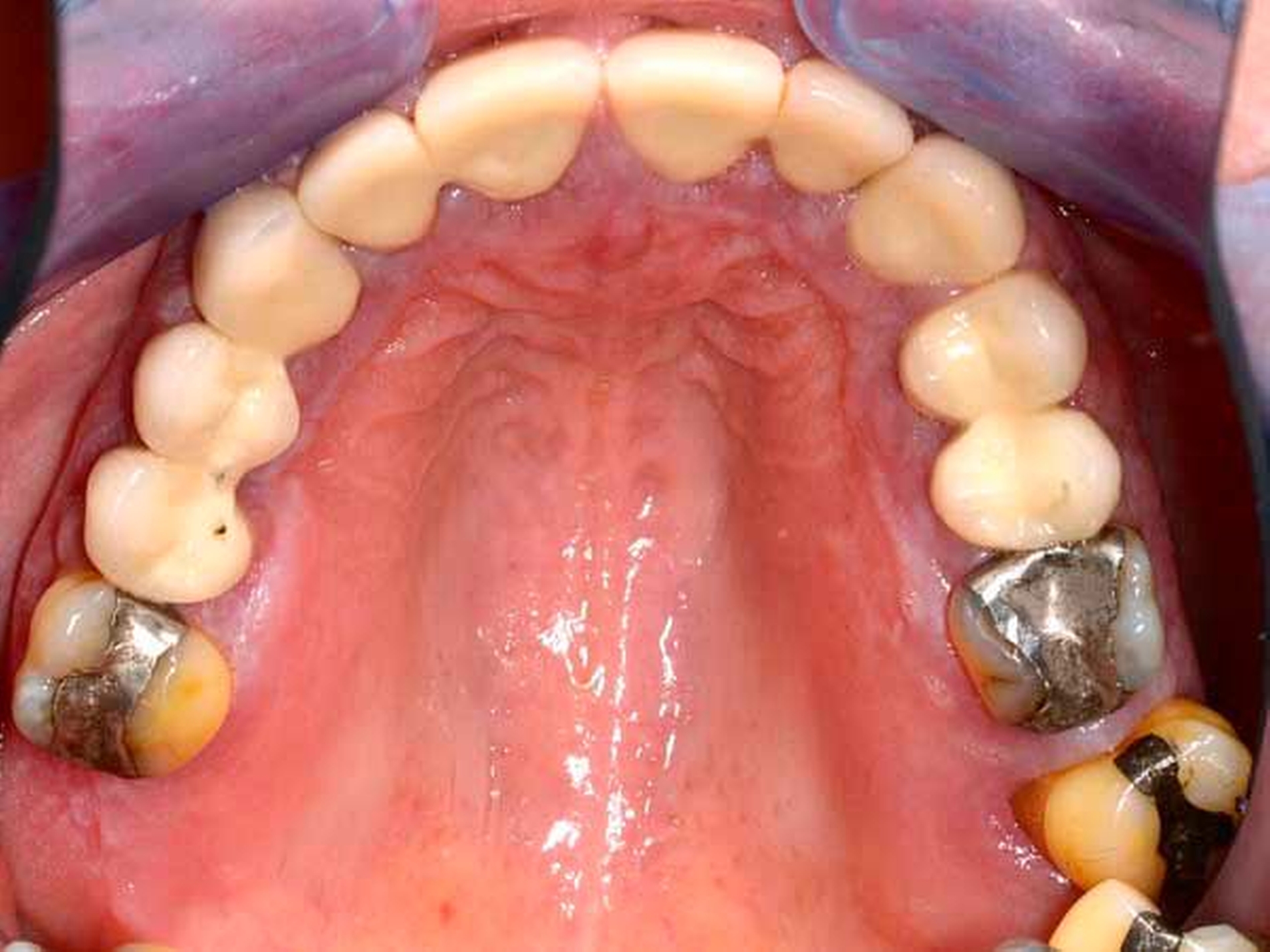 Nach Rücksprache mit dem behandelnden Hausarzt erfolgte die Substitution des Amlodipins durch ein Medikament aus einer anderen Wirkstoffgruppe. Parallel wurden in kurzen Intervallen weitere professionelle Zahnreinigungen durchgeführt. In der ersten Reevaluation sechs Wochen nach Medikamentenumstellung waren die Gingivavergrößerungen und Sondierungstiefen bereits deutlich reduziert. Die persistierenden Sondierungstiefen von 4 mm bis 7 mm belegten trotzdem einen weiteren parodontalen Behandlungsbedarf. Die häusliche Mundhygiene war verbessert (PCR 36 Prozent, GBI 38 Prozent). Der Rückgang der Gingivawucherungen und die damit verbundene Zugänglichkeit der Interdentalräume erforderten nunmehr die Umstellung von Superfloss auf Interdentalraumbürstchen. Die Anwendung von Chlorhexidingel wurde beendet.