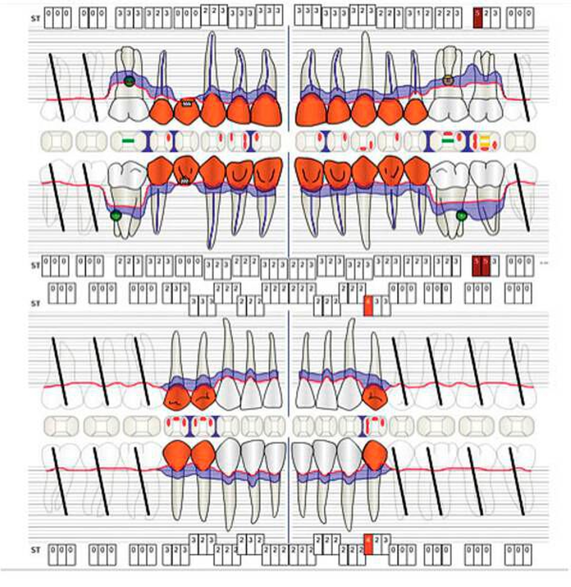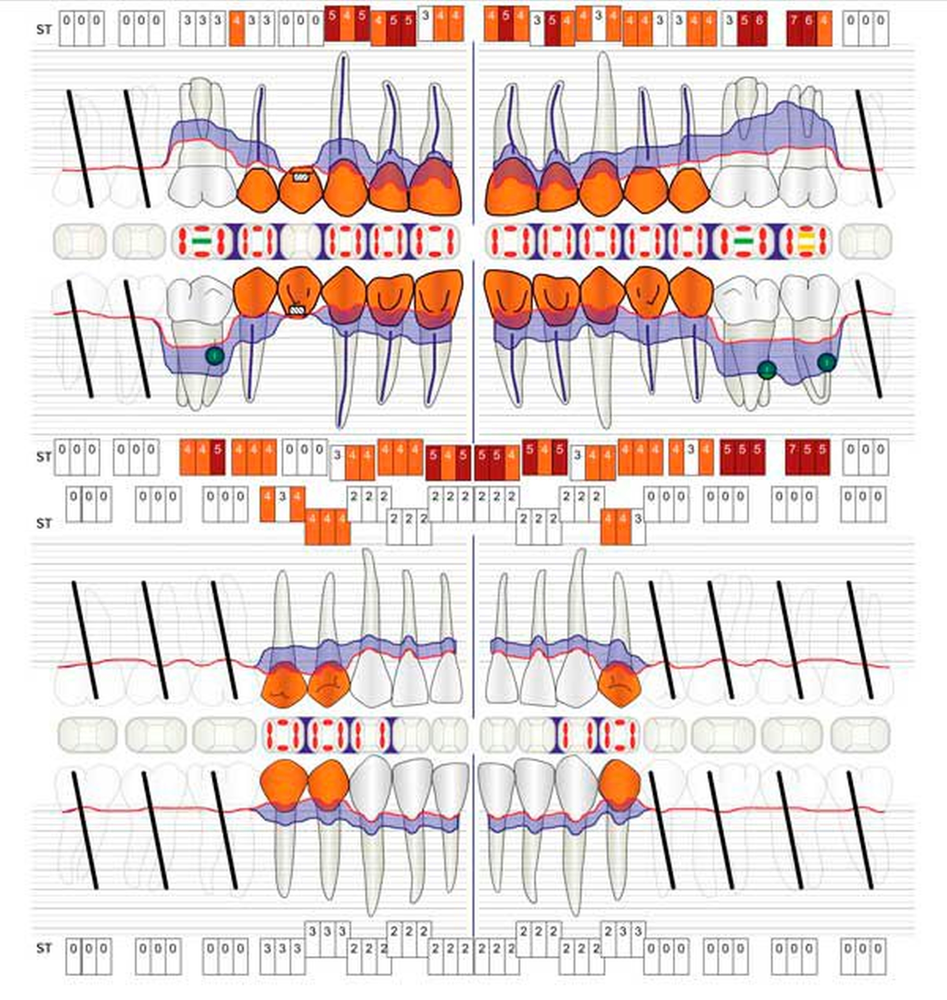 Befund: Bei der klinischen Untersuchung zeigten sich vestibulär und oral im Bereich der Papillen und der befestigten Gingiva generalisierte Gingivawucherungen im Oberkiefer (OK) und im Unterkiefer (UK). Die Interdentalräume waren aufgrund der Gingivawucherungen nicht für Hygienehilfsmittel durchgängig. Der Parodontale Screeningindex (PSI) wies im OK die Codes 3/3/4, im UK die Codes 3/1/3 auf. Der daraufhin erhobene Parodontalstatus (Abbildung 2) zeigte im OK Sondierungstiefen bis 7 mm mit Furkationsbeteiligungen Grad I (Zähne 16, 26, 27). Im UK betrugen die Sondierungstiefen bis zu 4 mm. Die Zahnbeweglichkeit an den Zähnen 16, 26 (Grad I) und 27 (Grad II) war erhöht.