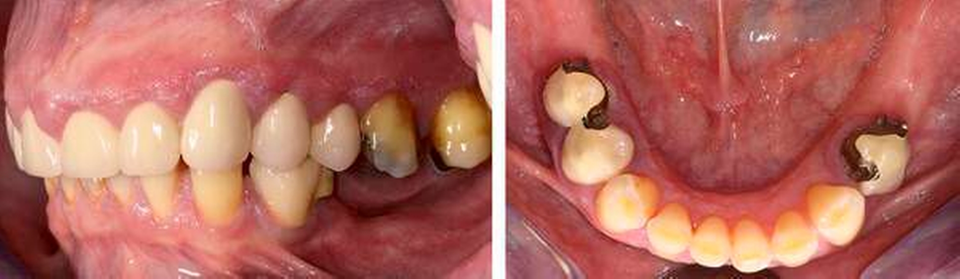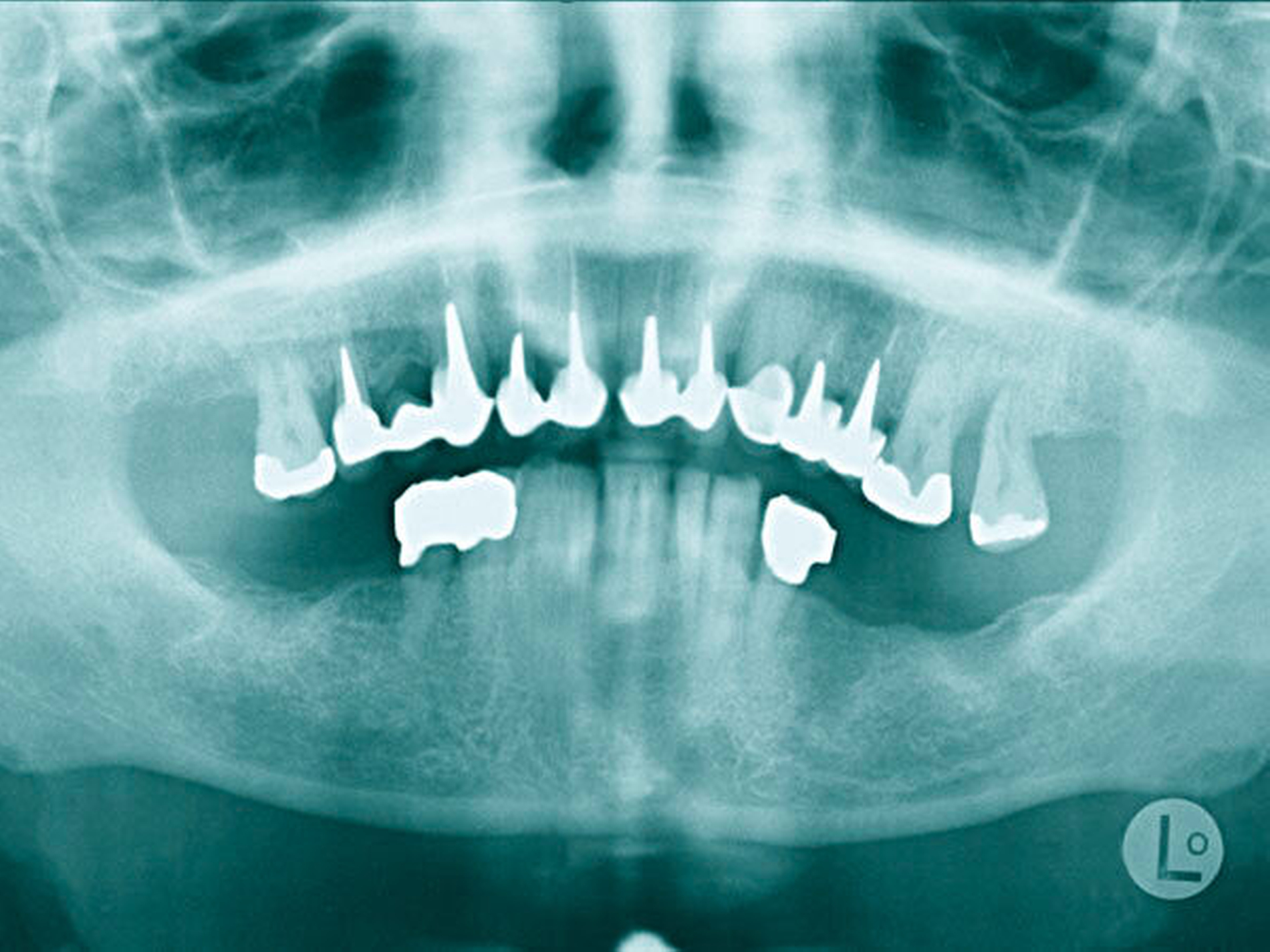 Der Plaqueindex PCR betrug 72 Prozent [O`Leary TJ et al., 1972] und der gingivale Blutungsindex GBI 75 Prozent [Ainamo J et al., 1975]. Das alio loco angefertigte Orthopantomogramm (Abbildung 3) zeigte horizontalen Knochenabbau bis zu einem Drittel der Wurzellänge in beiden Kiefern. Die Zähne 16 und 26 wiesen einen Knochenabbau > 2/3 der Wurzellänge auf. Am Zahn 27 mesial erreichte der Knochenabbau die Wurzelspitze; zudem war der Zahn elongiert und wies eine Kippung nach distal auf. In einer ersten Einzelzahnprognose wurden alle Zähne mit Ausnahme von Zahn 27 als sicher eingestuft. Prothetisch war die Patientin im OK mit einer Brücke (13 bis 15), Kronenblöcken (21/11, 21/22, 24/25) und Amalgamfüllungen an den Zähnen 16 und 26 sowie im UK mit einer geschiebeverankerten Modellgussprothese versorgt.