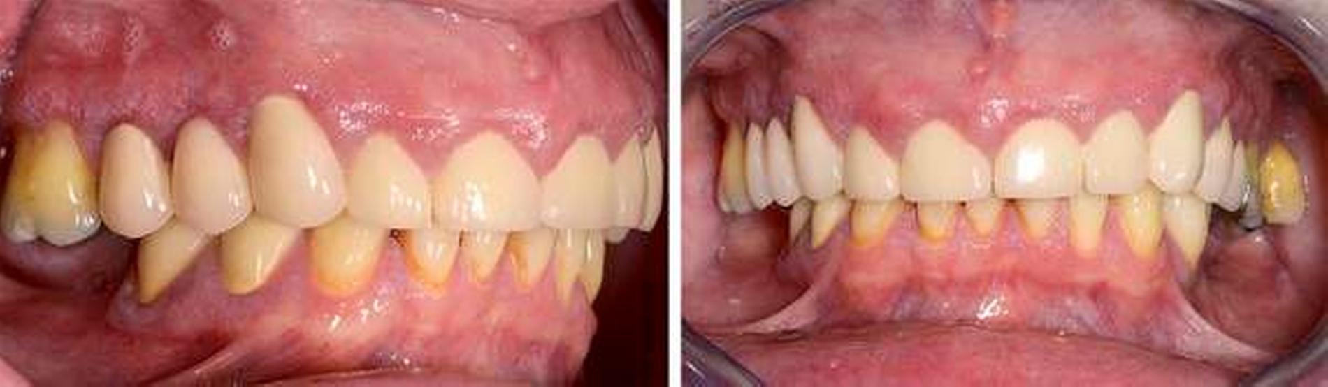 Neben der Medikamentensubstitution gilt die Plaque- und Entzündungskontrolle als vorrangig therapeutisch beeinflussbar [Lederman D et al., 1984; Seymour RA et al., 2000, Seymour RA, 2006; Thomas DW et al., 2000]. Hierzu zählen Plaque- und Zahnsteinentfernung sowie die Korrektur von Plaqueretentionsstellen. Diese Maßnahmen wurden im dargestellten Fall intensiv durchgeführt. Durch die multiplen Überkronungen lagen zahlreiche subgingival gestaltete und überkonturierte Kronenränder sowie Kronenverblockungen als begünstigende Plaqueretentionsstellen vor. Diese waren jedoch nicht mit einem vertretbaren Aufwand korrigierbar. Adjunktiv zur mechanischen Therapie wurde Chlorhexidingel zur chemischen Belagskontrolle eingesetzt. Auf die kontrovers diskutierte Gabe von Antibiotika wurde verzichtet [Thomas DW et al., 2006].