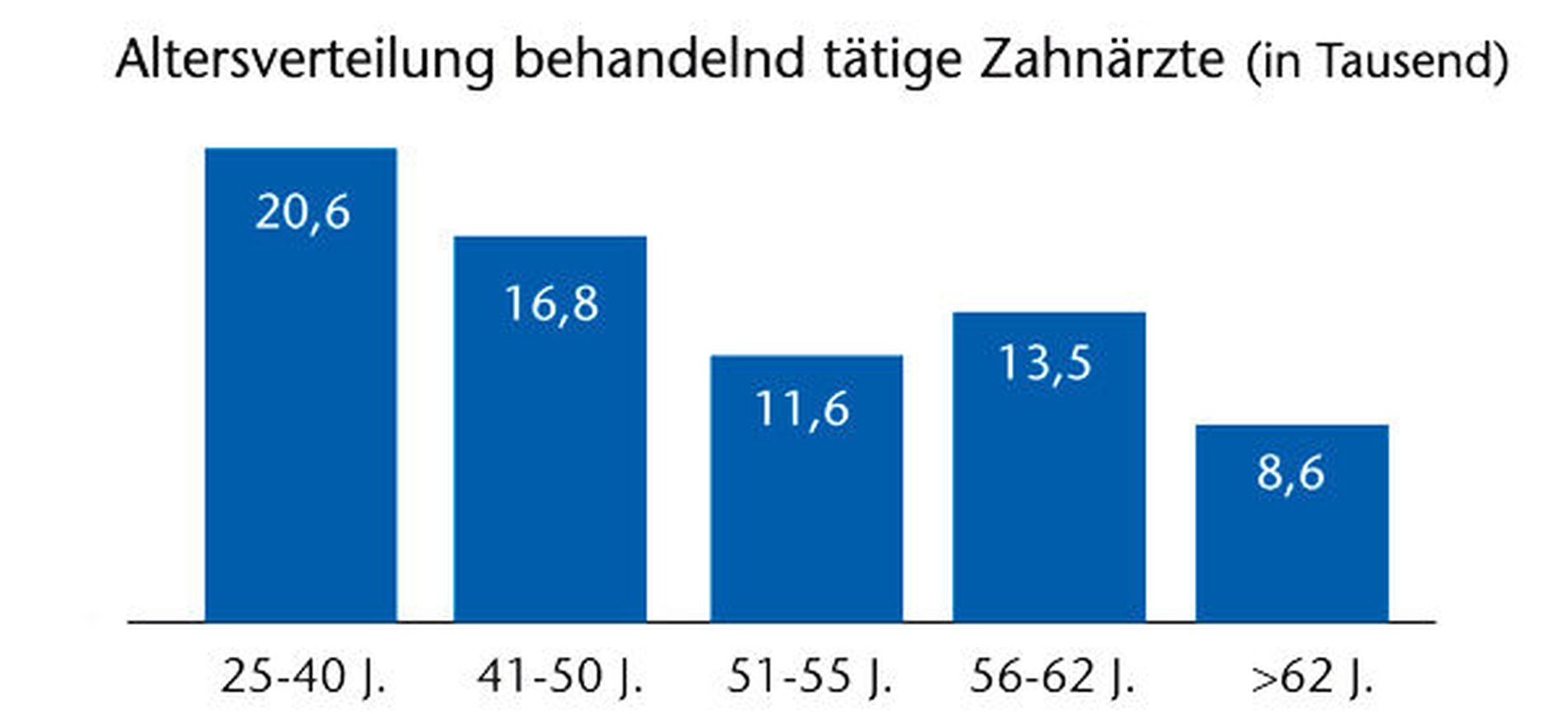 Während die Zahl der behandelnd tätigen Zahnärzte konstant steigt, geht die Anzahl der Praxen konstant zurück. Aufgrund des Angestelltenwunsches des Nachwuchses und der Tatsache, dass derzeit rund die Hälfte aller niedergelassenen Zahnärzte über 50 Jahre alt ist, zeichnet sich ein klares Nachfolgeproblem ab. Über 23.000 niedergelassene Zahnärzte (80 % Einzelpraxen) werden in den kommenden Jahren ihre Praxis an eine Generation abgeben „müssen“, für die die Selbstständigkeit keine Selbstverständlichkeit ist. Prognosen unter anderem der Bundeszahnärztekammer zeigen, dass das Verhältnis der niedergelassenen zu den angestellten Zahnärzten entsprechend von 72:28 Prozent (2016) binnen eines Jahrzehnts auf 58:42 Prozent (2026) sinken wird.
