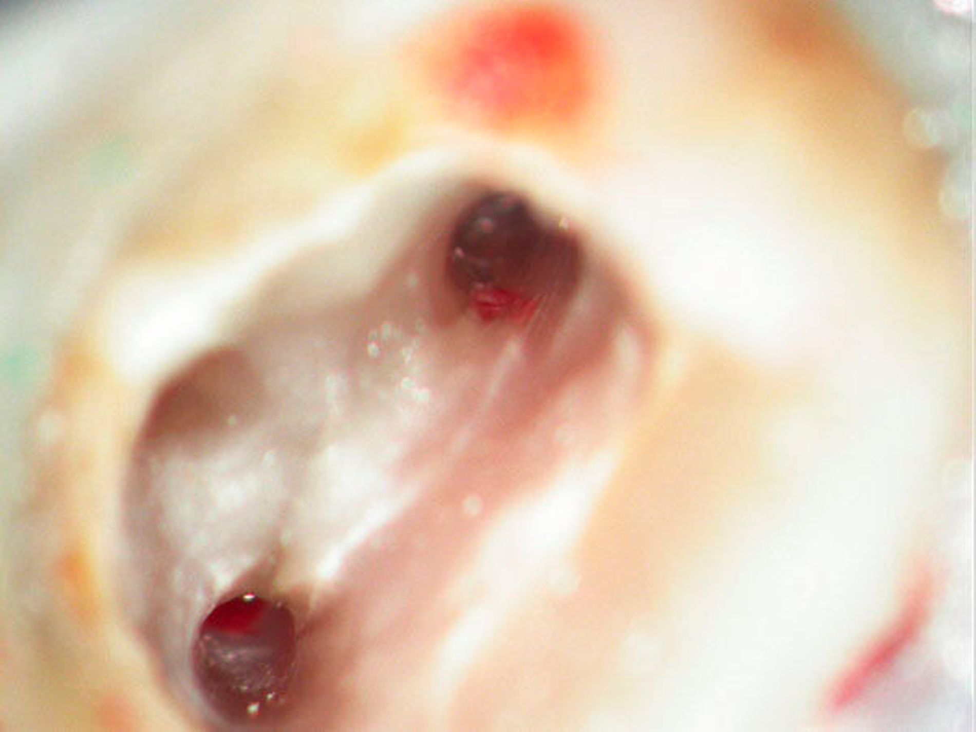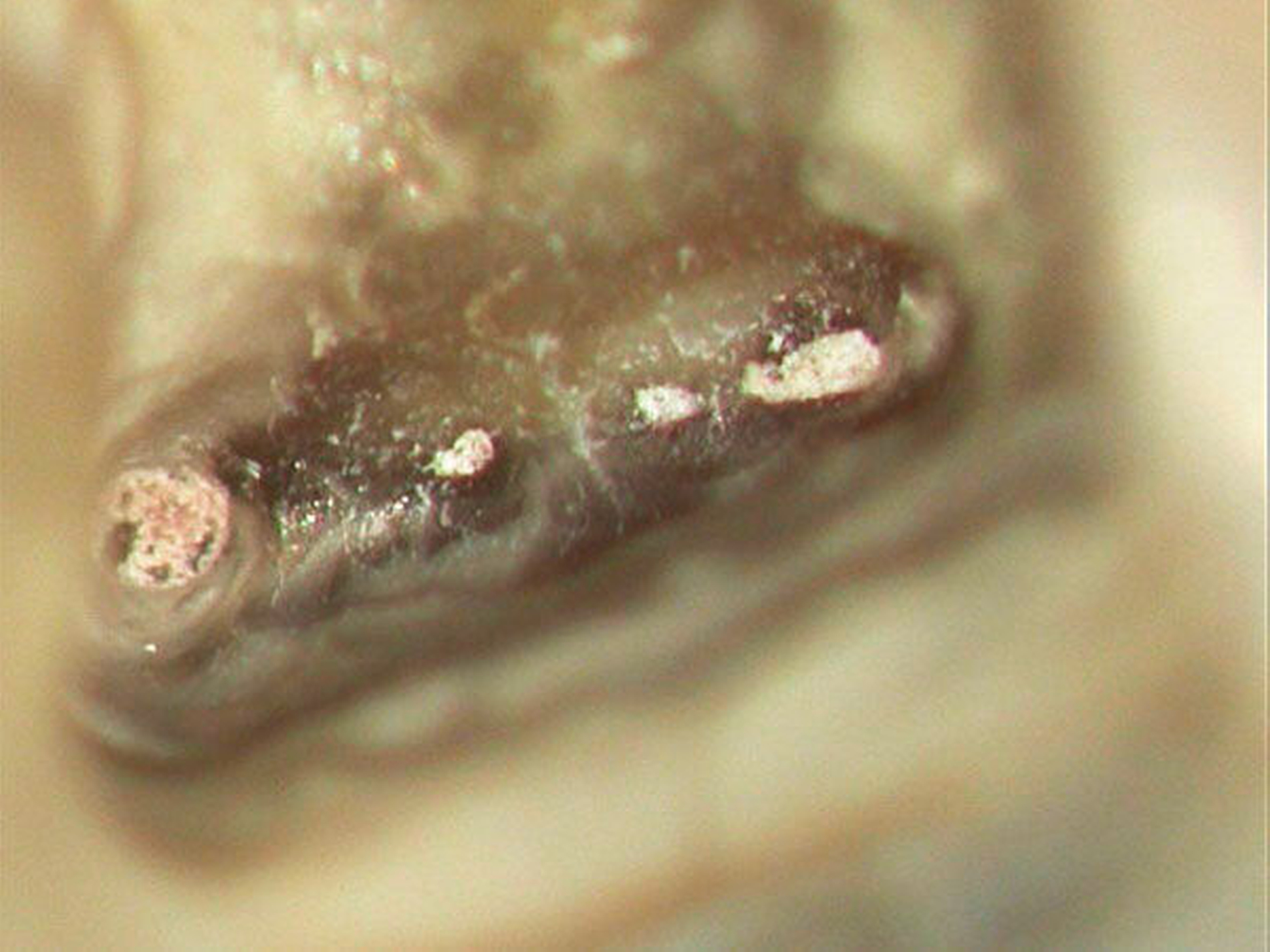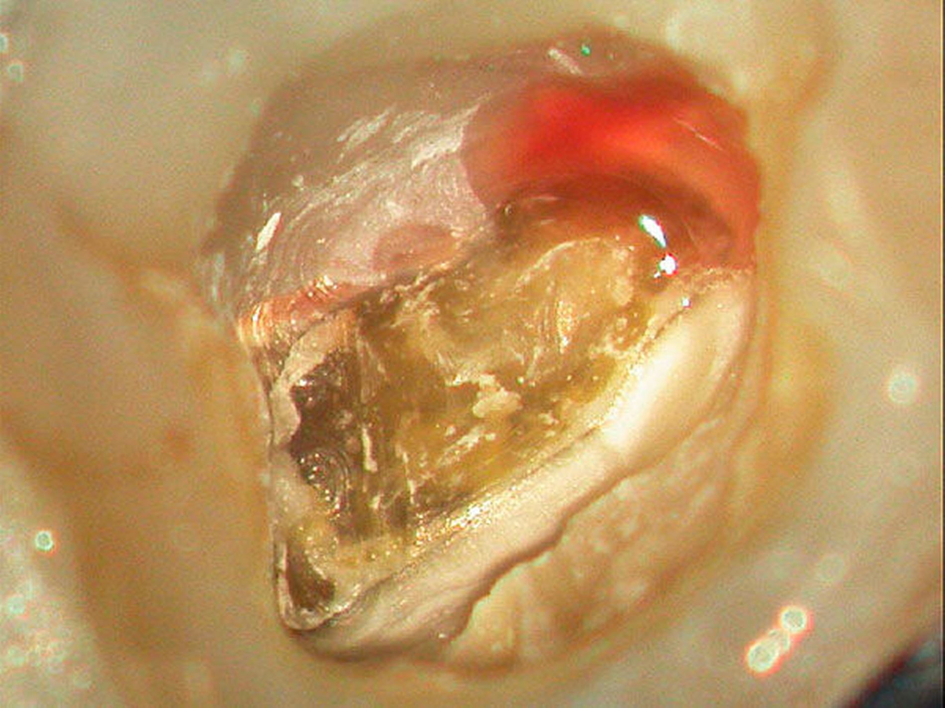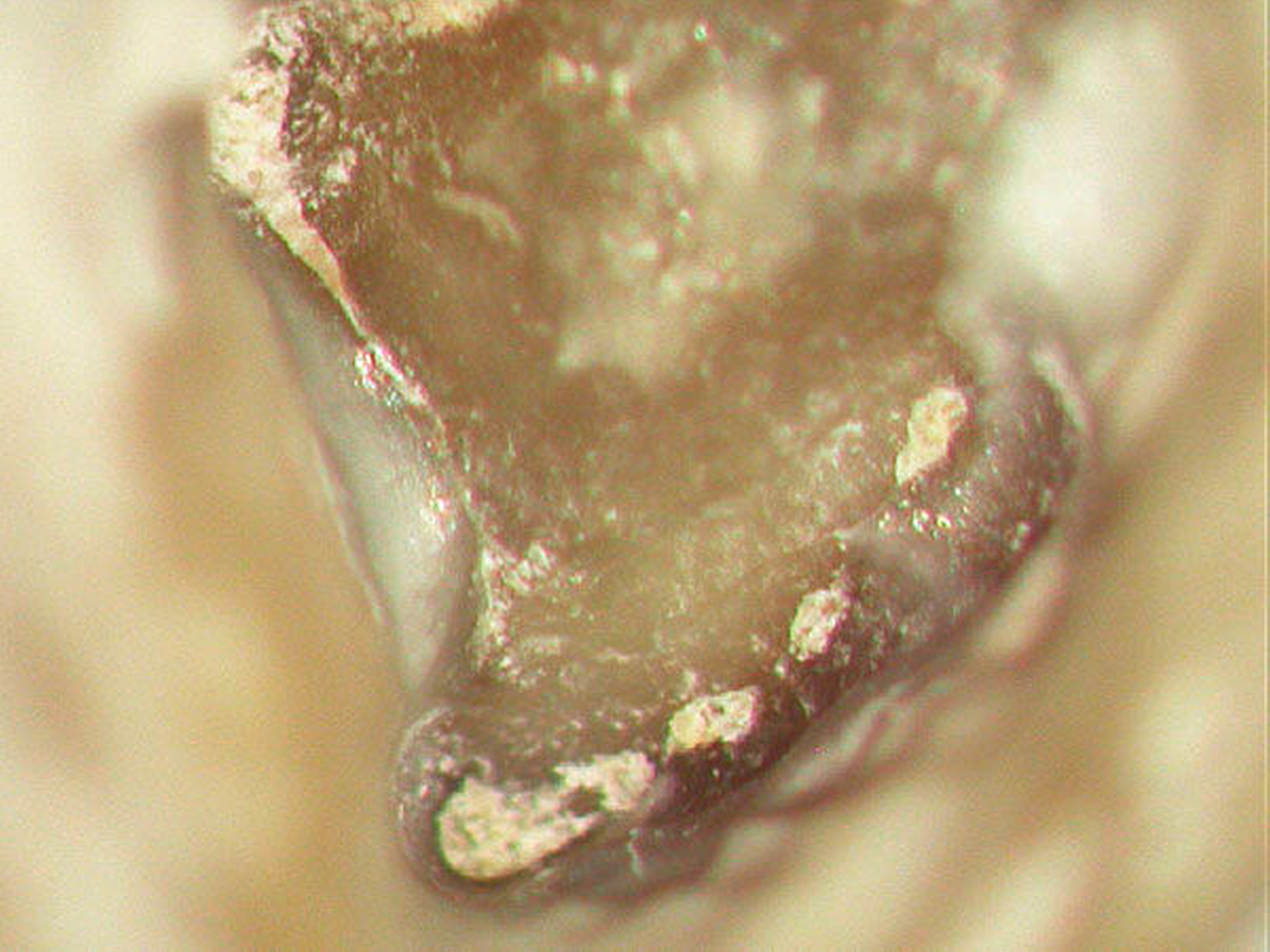 Eine besondere Schwierigkeit ist das Auftreten x-förmiger Wurzelkanäle (Typ VI nach Vertucci) in der mesiobukkalen Wurzel oberer erster Molaren [Arnold & Paqué, 2010]. Die Konfluenz der beiden mesiobukkalen Wurzelkanäle MB1 und MB2 im mittleren Wurzeldrittel ist häufig ein Hinweis auf eine erneute Aufteilung im apikalen Wurzeldrittel. Das Erschließen des erneuten Abzweigs gelingt nach einer minimalinvasiven sonoabrasiven Präparation vom MB1 unter Nutzung eines Dentalmikroskops (Abbildungen 12 und 13). Seltener sind diese Aufteilungen an distobukkalen Wurzelkanälen zu beobachten (Abbildung 14).