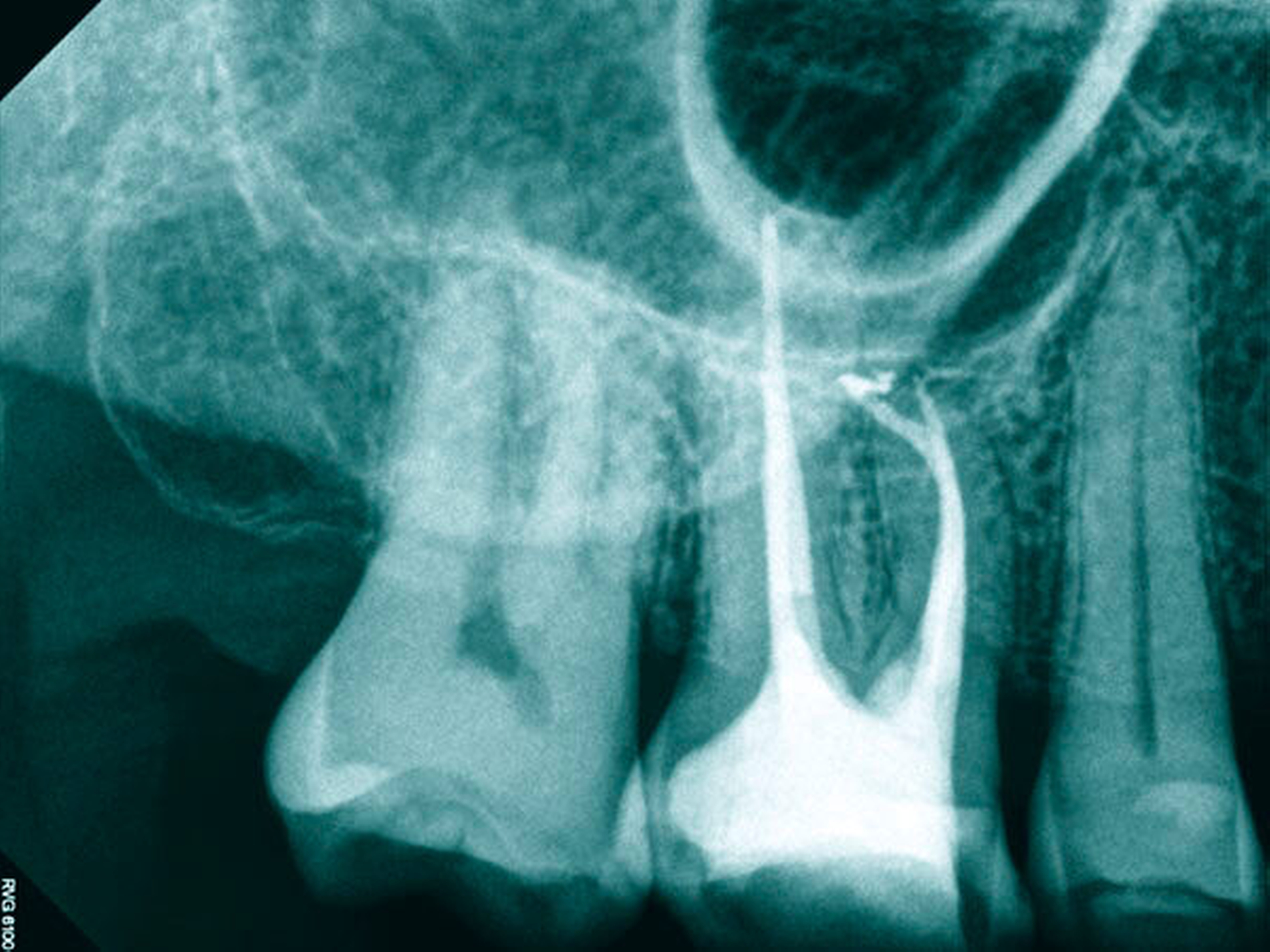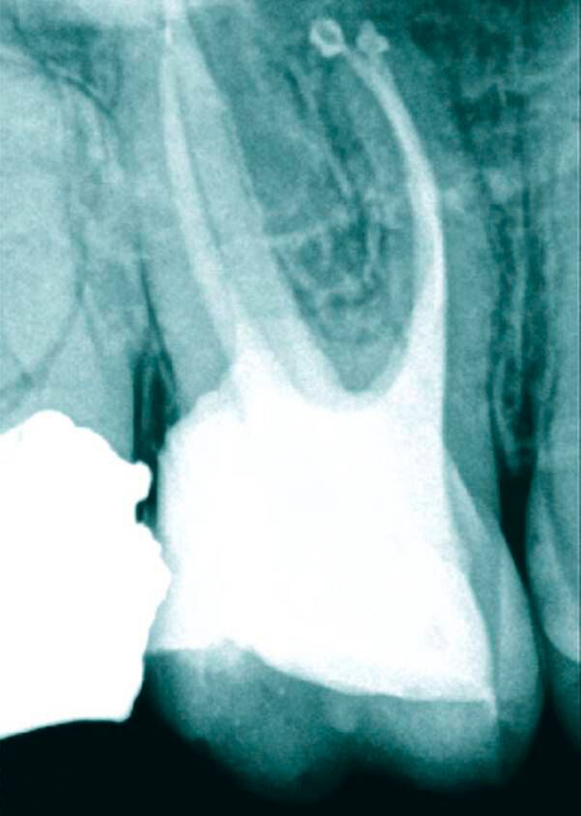 Schließlich werden mit der mechanischen Erweiterung und konischen Ausformung der Wurzelkanäle die Voraussetzungen für einen dichten Verschluss des Wurzelkanalsystems geschaffen, damit eine Rekolonisierung von endodontischen Hohlräumen vermieden werden kann (Abbildung 7) [Klimm, 2003; Hülsmann & Schäfer, 2005]. Im Ergebnis einer vollständigen antimikrobiellen Therapie bilden sich ausgedehnte periapikale Aufhellungen und pathologische Prozesse der Kieferhöhle vollständig zurück und erfordern keinen weiteren chirurgischen Eingriff (Abbildung 8).