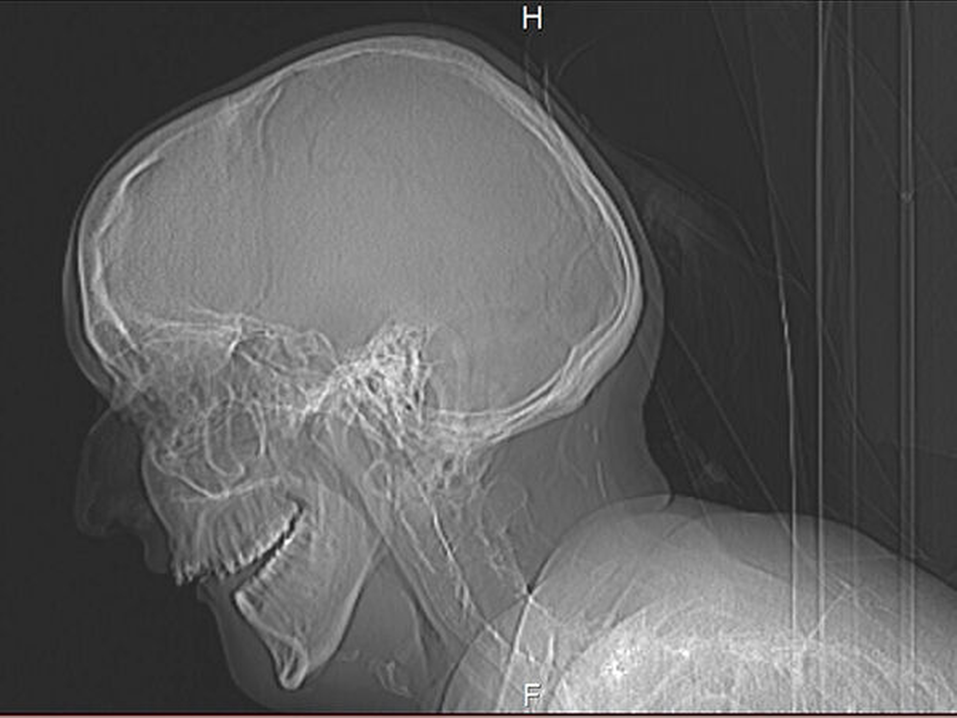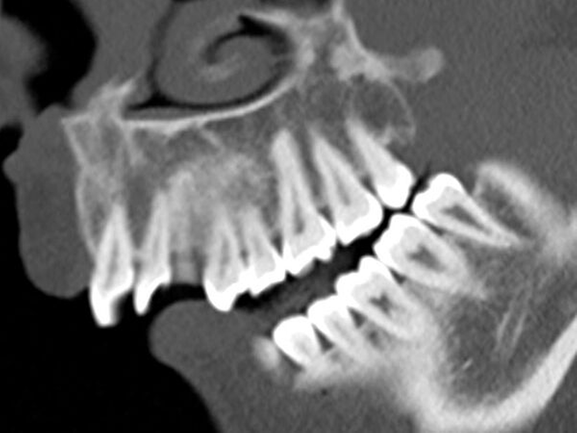 Ein klinischer Hinweis auf eine mögliche Dentitio difficilis in regio 038, die die Patientin vermutet hatte, konnte nicht gefunden werden. Zur weiteren Diagnostik wurde ein Kopf-CT angefertigt, das eindrücklich die massiv eingeschränkte interokklusale Distanz im Molarenbereich demonstriert (Abbildung 2).
