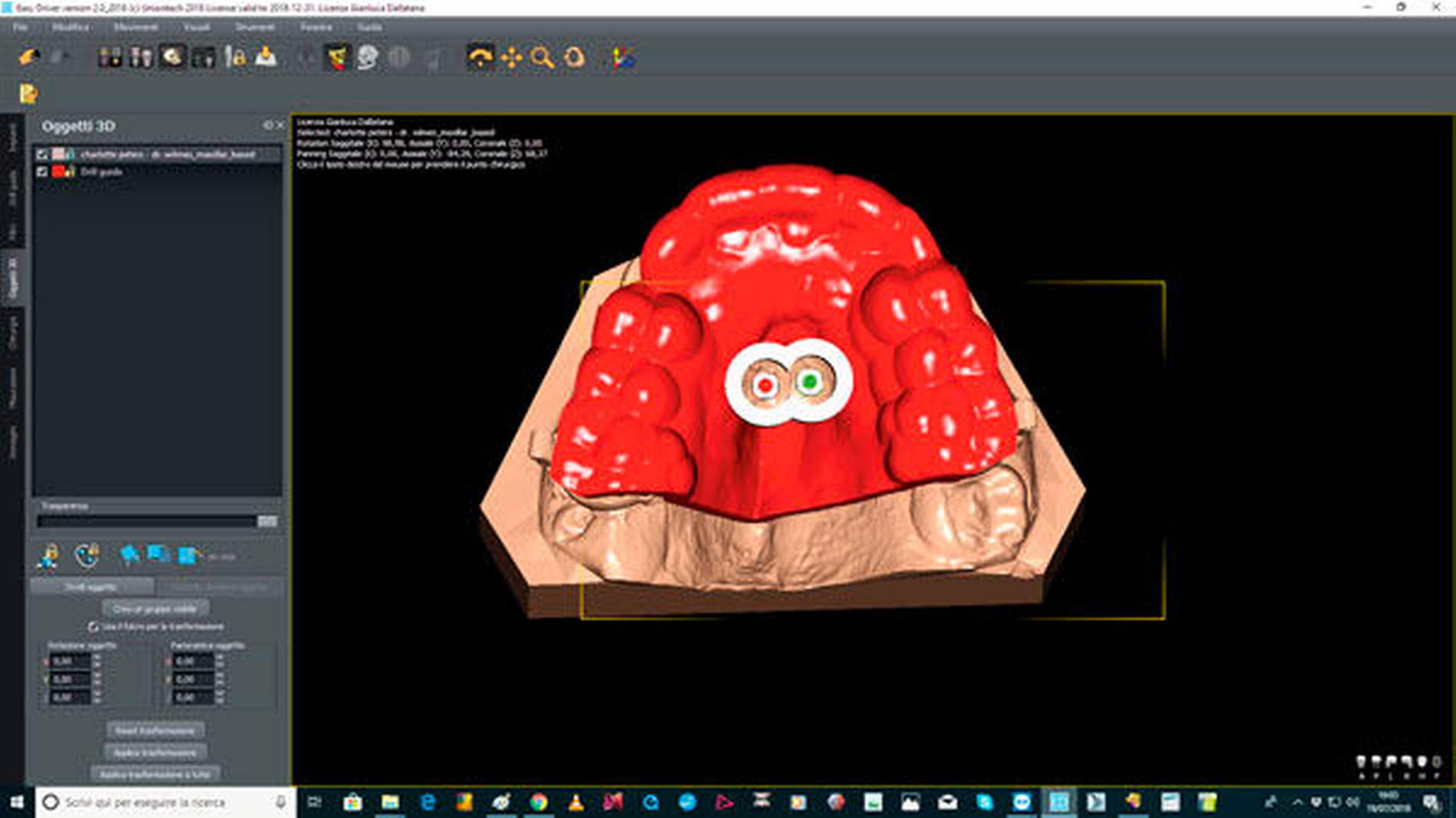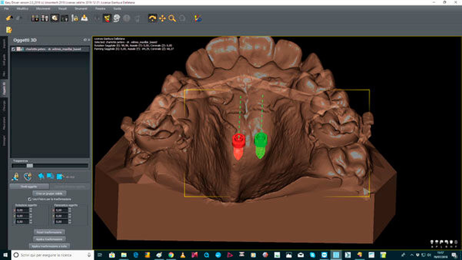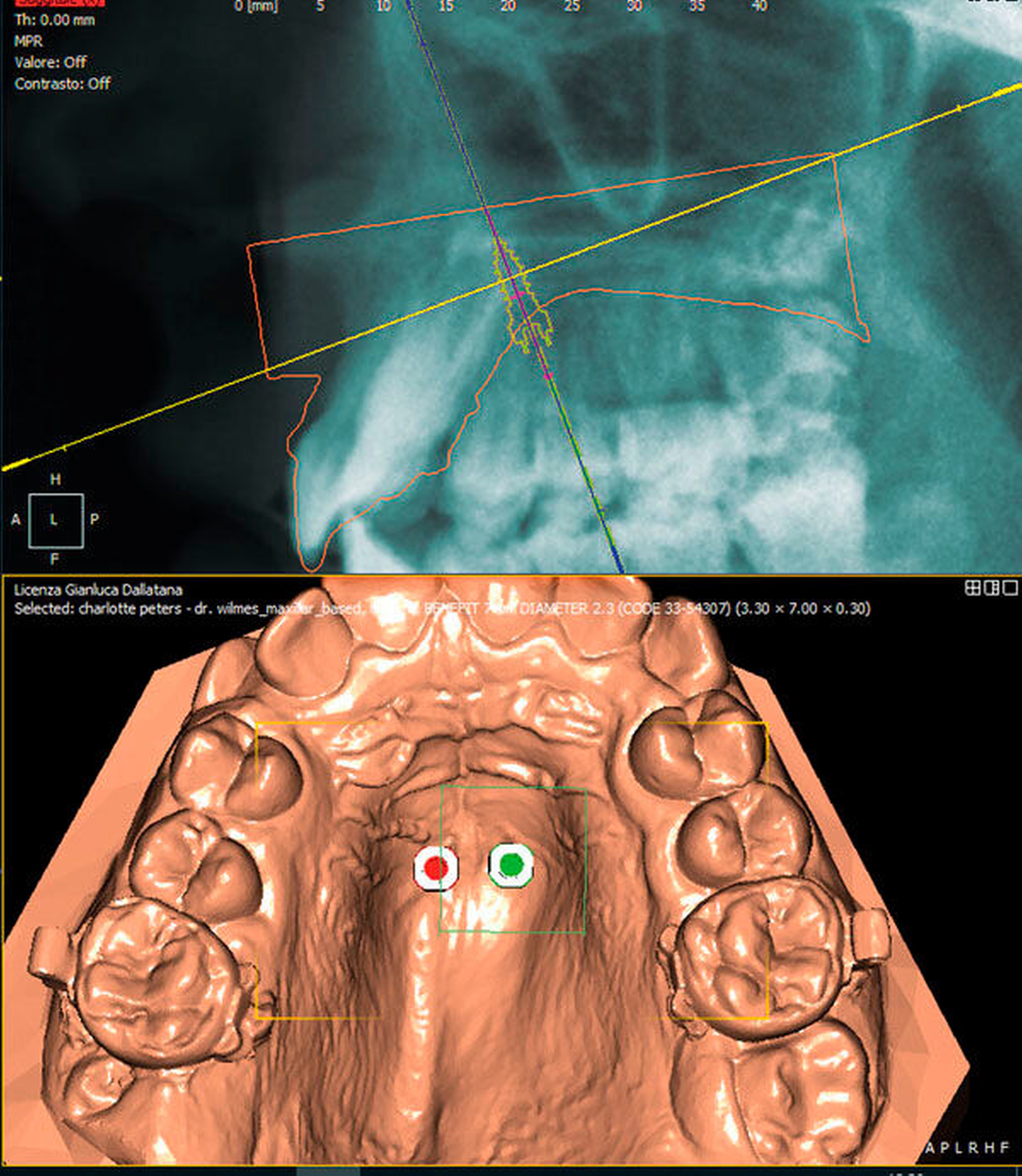 Wie beim Einbringen von Zahnimplantaten schaffen die computergestützte Planung und die Verwendung von Schablonen auch bei der Insertion von Mini-Implantaten mehr Sicherheit für den Behandlungserfolg. Für die zunächst virtuelle Insertion werden ein Abdruck oder ein Scan sowie ein Röntgenbild (FRS oder DVT) überlagert [De Gabriele, 2017] (Abbildungen 1 und 2, Easy Driver Software, Labor Uniontech, Parma/IT). Während in einem normalen Fall das FRS ausreicht, ist bei schwierigen Situationen (zum Beispiel LKG-Spalte, palatinal verlagerte Eckzähne) sicherlich die Anfertigung eines DVTs empfehlenswert. Basierend auf der computergestützten Planung wird eine Insertionsschablone per Rapid-Prototyping-Verfahren (RKS Labor, Rastede/D, Abbildung 3) zusammen mit dem gewünschten kieferorthopädischen Gerät im zahntechnischen Labor hergestellt.