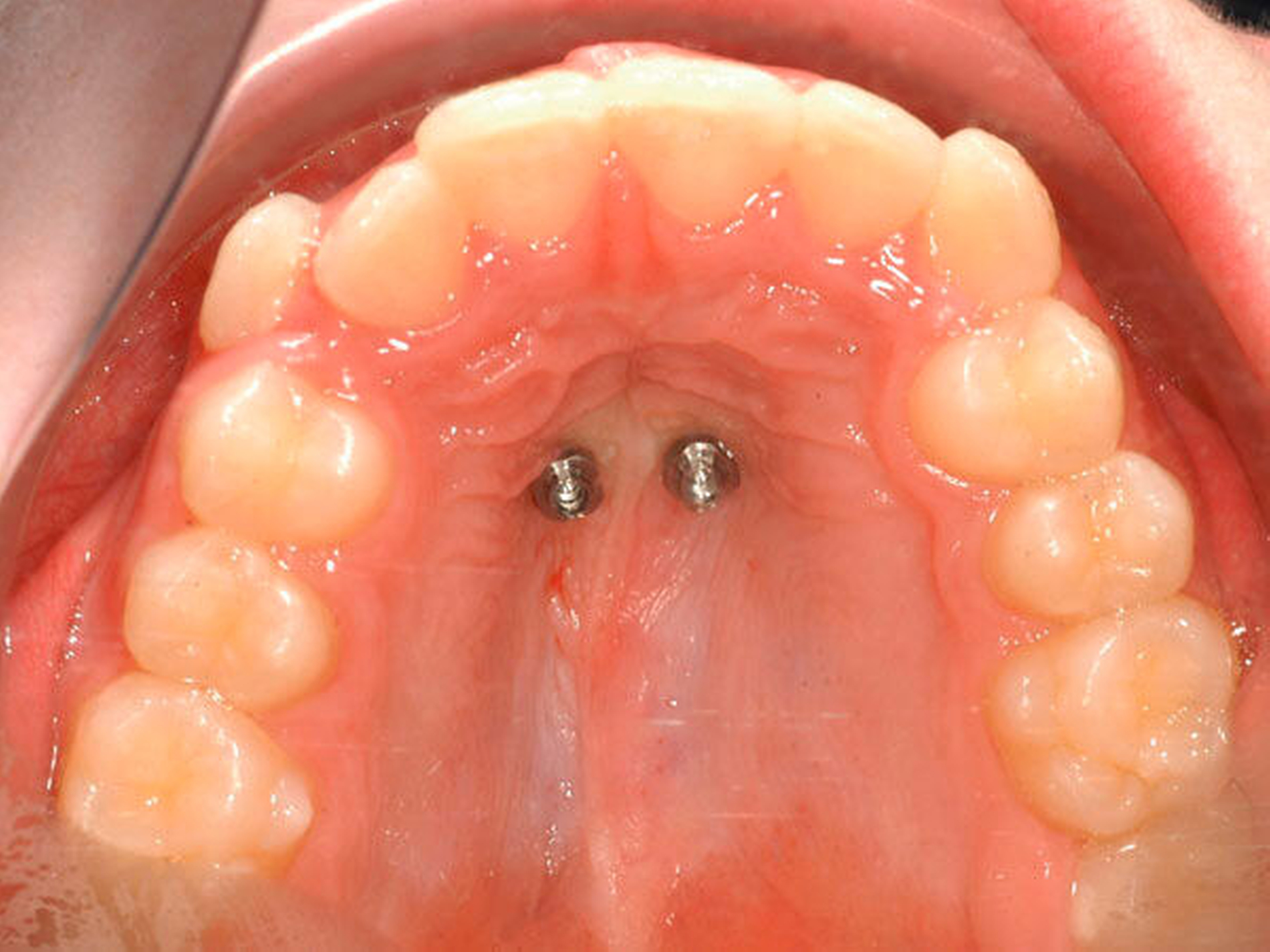 Herkömmliche Geräte zur Distalisierung von Oberkiefermolaren sind in ihrer Effektivität oft begrenzt und teilweise von der Mitarbeit des Patienten abhängig [Feldmann, 2006, Guray, 1997]. Des Weiteren wird bei vielen Non-Compliance Geräten (wie zum Beispiel bei der Pendulum Apparatur) ein Verankerungsverlust von teilweise über 50 Prozent im Sinne einer unerwünschten Mesialwanderung der Prämolaren beobachtet [Bussick, 2000; Ghosh, 1996]. Die skelettale Verankerung erweist sich in vielen Fällen als vorteilhaft und hat nicht zuletzt wegen der Vermeidung von dentalen Nebenwirkungen und der Unabhängigkeit von der Patientencompliance das Behandlungsspektrum enorm erweitert [Costa, 1998; Freudenthaler, 2001; Kanomi, 1997; Melsen, 2000; Wilmes, 2006]. Insbesondere die Mini-Implantate haben sich dabei aufgrund ihrer geringen Invasivität etabliert. Werden sie im Alveolarfortsatz zwischen den Zahnwurzeln inseriert, lassen sich die benachbarten Zähne maximal 1 bis 1,5 mm bewegen, da es dann zum Kontakt von Mini-Implantat zur Wurzeloberfläche kommt und die weitere Bewegung somit verhindert wird. Ist eine orthodontische Zahnbewegung in mesialer oder distaler Richtung geplant, erweist sich die interradikuläre Insertion damit als ungeeignet. Für viele Behandlungsaufgaben im Oberkiefer (Distalisierung, Mesialisierung, Verankerung, Intrusion von Molaren) bietet sich im Gaumen insbesondere die sogenannte T-Zone posterior der Gaumenfalten an [Ludwig, 2011; Wehrbein, 1996; Wilmes, 2016]. Als Vorteile müssen hier das gute Knochenangebot gepaart mit einer befestigten und dünnen Mukosa genannt werden. Des Weiteren ist das Risiko einer Interaktion mit den Zahnwurzeln – insbesondere bei einer medianen Insertion äußerst gering. Median und paramedian inserierte Mini-Implantate weisen eine vergleichbare langfristige Stabilität auf [Nienkemper, 2015]. Um eine stabile Kopplung beziehungsweise eine Kraftapplikation mit der Dentition zu erreichen, sind orthodontische (Mini-) Implantate mit Abutments empfehlenswert.