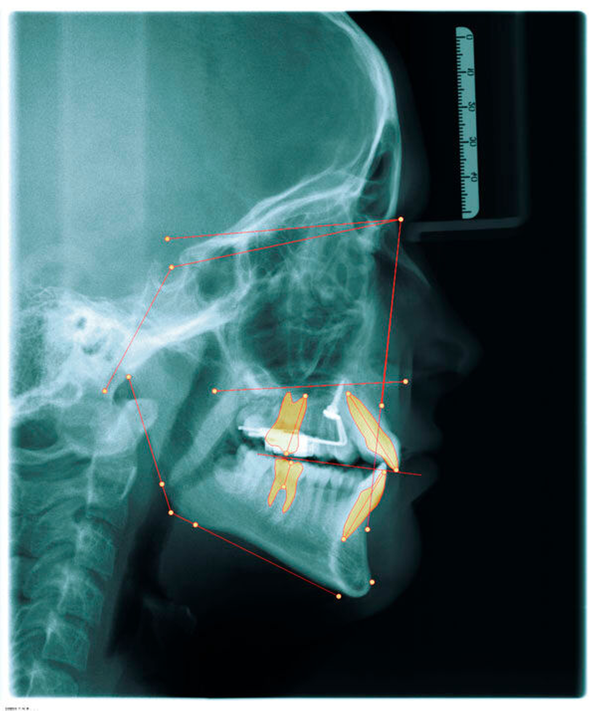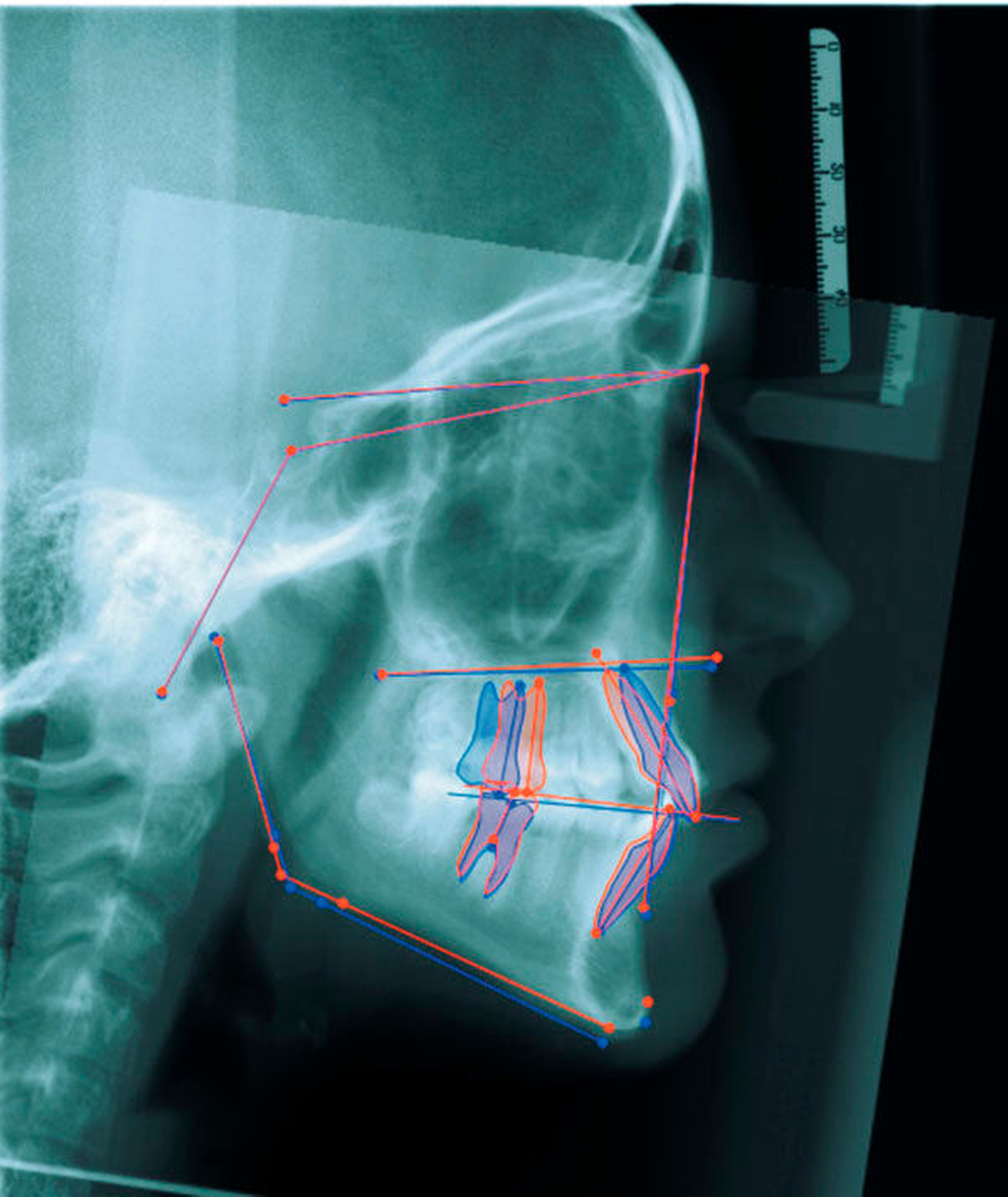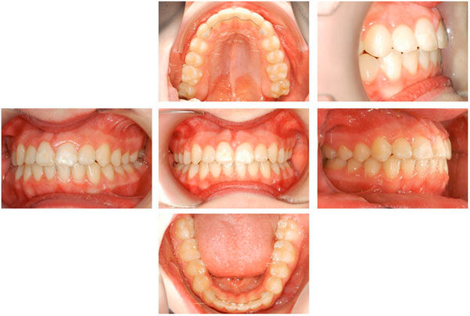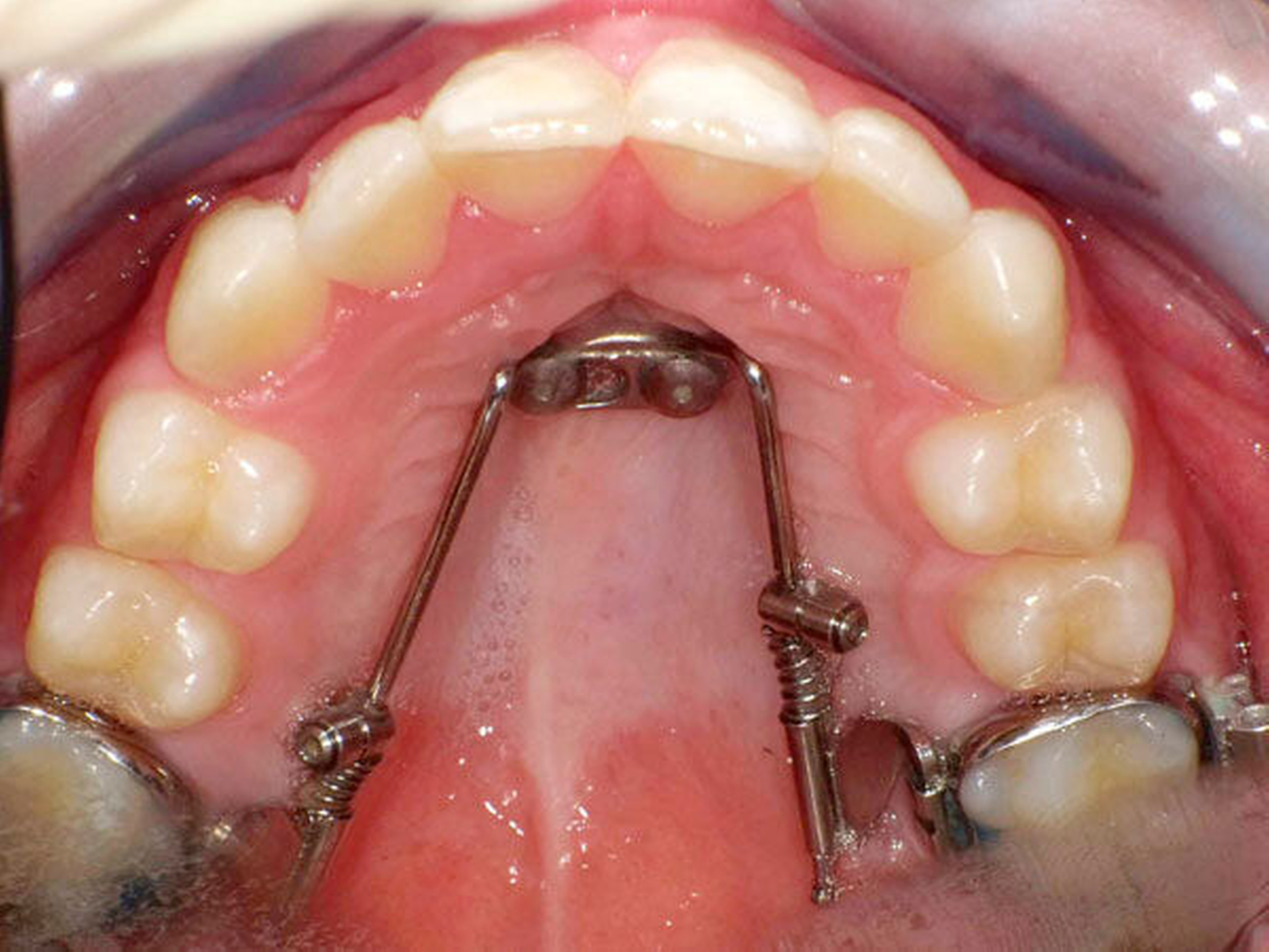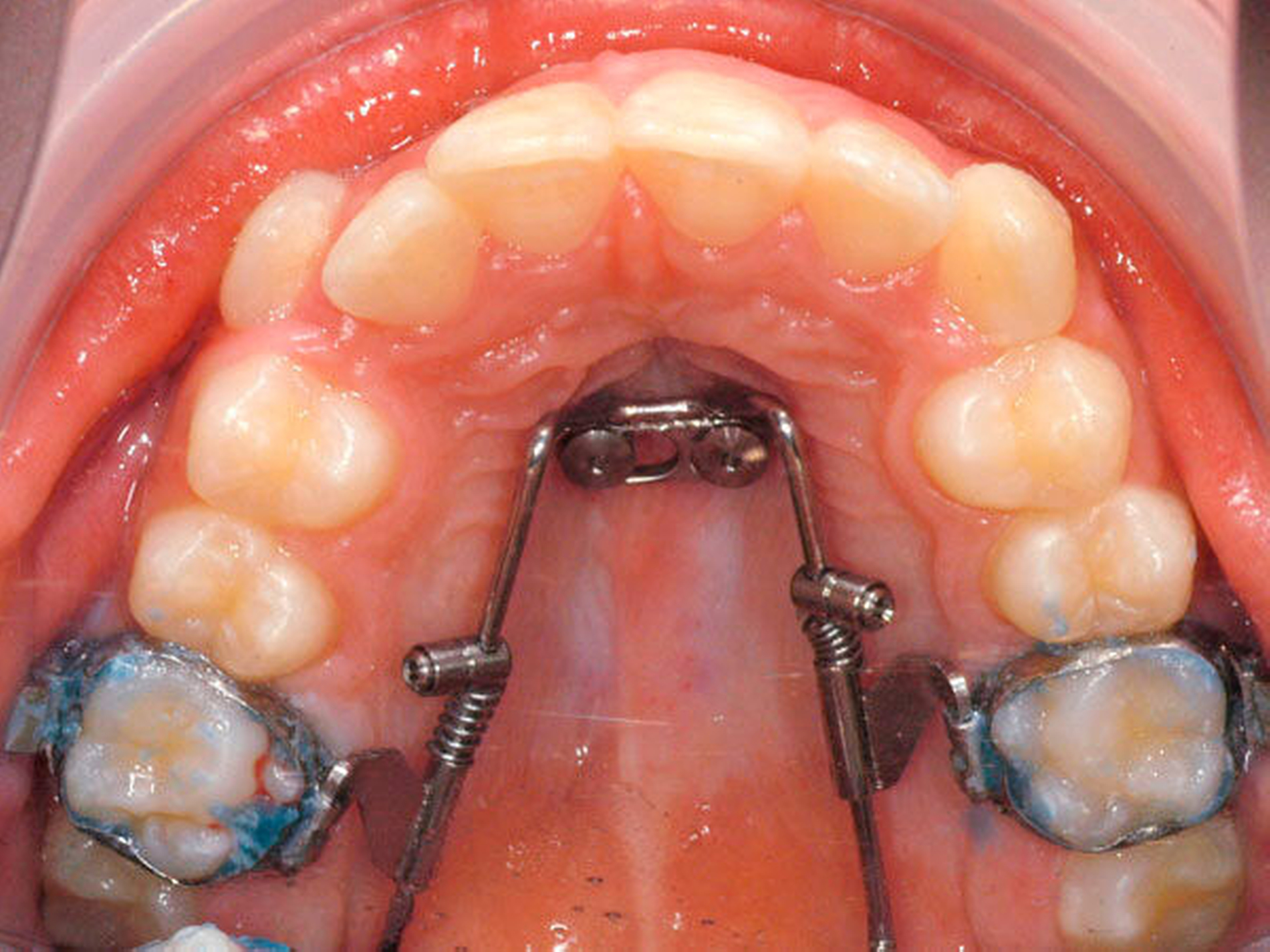 Das Prinzip einer CAD/CAM-gesteuerten Insertion wird anhand einer zehnjährigen Patientin mit einem Platzmangel für die oberen Eckzähne dargestellt (Abbildungen 4a, 4b). Die Behandlung begann mit dem Anpassen von Molarenbändern und einem Silikon-Abdruck des Oberkiefers, der mit dem FRS an das zahntechnische Labor gesendet wurde und dort mit dem FRS der Patientin überlagert wurde. So konnten geeignete Insertionsstellen virtuell geplant werden (Abbildungen 1, 2a, 2b). Nach Rücksprache mit dem Behandler bezüglich der Mini-Implantatpositionen erfolgte die Herstellung der Insertionsschablone (Abbildung 3). Parallel dazu wurde auch der Beneslider [Wilmes, 2010] hergestellt, der zusammen mit der Insertionsschablone geliefert wurde (Abbildung 5). Mithilfe der Insertionsschablone konnten die Mini-Implantate und der Beneslider im selben Termin eingesetzt werden (Abbildungen 6, 7a, 7b). Nach 10 Monaten Distalisierung waren die Molaren in der Zielposition und es war ausreichend Platz für die Eckzähne vorhanden (Abbildungen 8a, 8b), so dass Brackets für die zweite Phase der Behandlung eingesetzt werden konnten. Die Multibracket-Apparatur (Abbildung 9) konnte nach 12 Monaten entfernt werden (Abbildungen 10, 11).