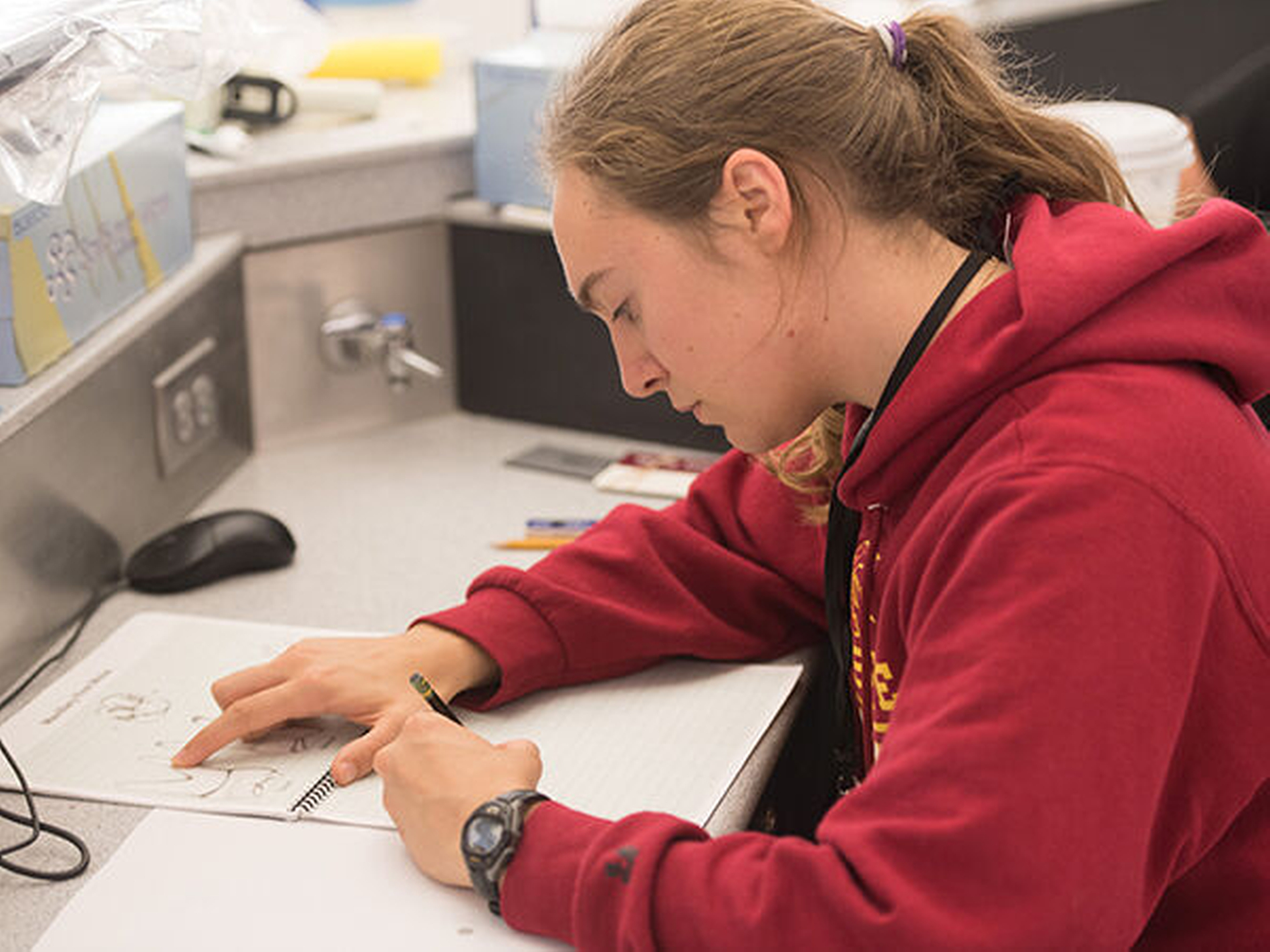 Emma Miller, Erstsemester aus Cedar Rapids, Iowa, hatte „keine Ahnung, dass Zähne so komplex sind. Mir ist einfach nicht aufgefallen, dass sie so viele Rillen und Zacken und Erhöhungen haben“, sagt sie, über ihrer Zeichnung hockend. „Ich bin alles andere als eine Künstlerin, also war ich zuerst nervös, aber ich habe das Gefühl, dass ich die Form des Zahns besser erfasse, wenn ich ihn vorher zeichne.“