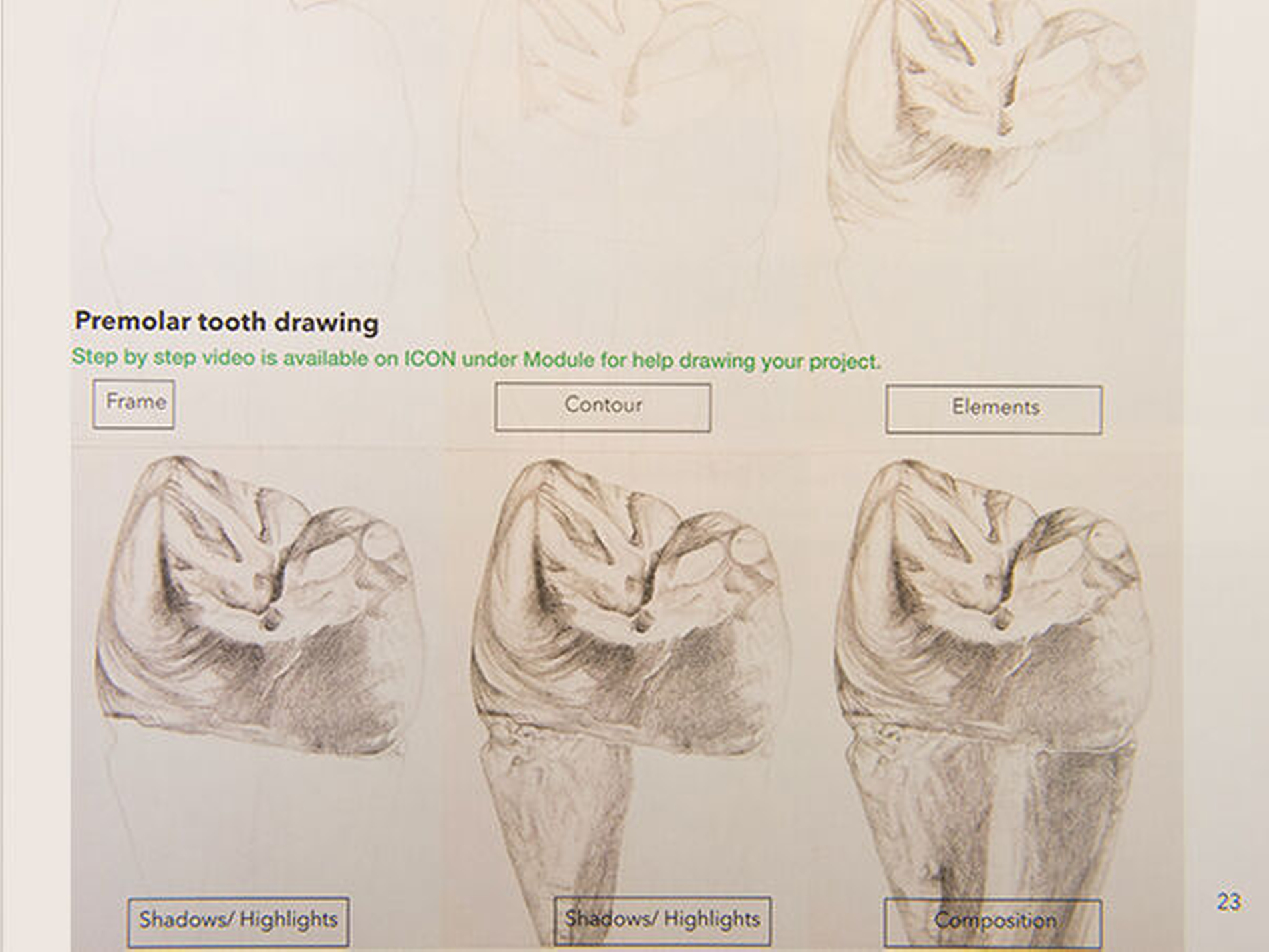 „Die Zeichnungen waren eine großartige Möglichkeit, um die Linien- und Spitzenwinkel der Zähne zu nachzuvollziehen“, bestätigt Cody Glass, Student im zweiten Jahr aus Lancaster, Wisconsin, der 2017 ebenfalls Elgendys Kurs belegte. „Das Zeichnen war lustig und eine stressfreie Art zu lernen.“