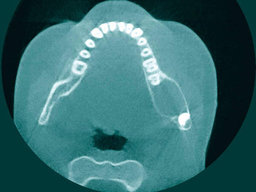 Eine 13-jährige Patientin kam in Begleitung ihrer Mutter mit einer seit drei Tagen progredienten Schwellung des linken Unterkiefers in unsere Klinik. Zuvor war durch den niedergelassenen Zahnarzt nach initialer Bildgebung bei Verdacht auf Vorliegen einer infizierten follikulären Zyste (Abbildung 1) eine enorale Inzision mit Einlage einer Drainage zur Entlastung durchgeführt worden.