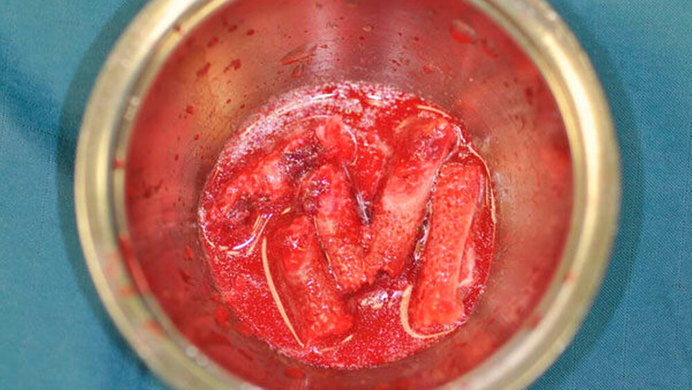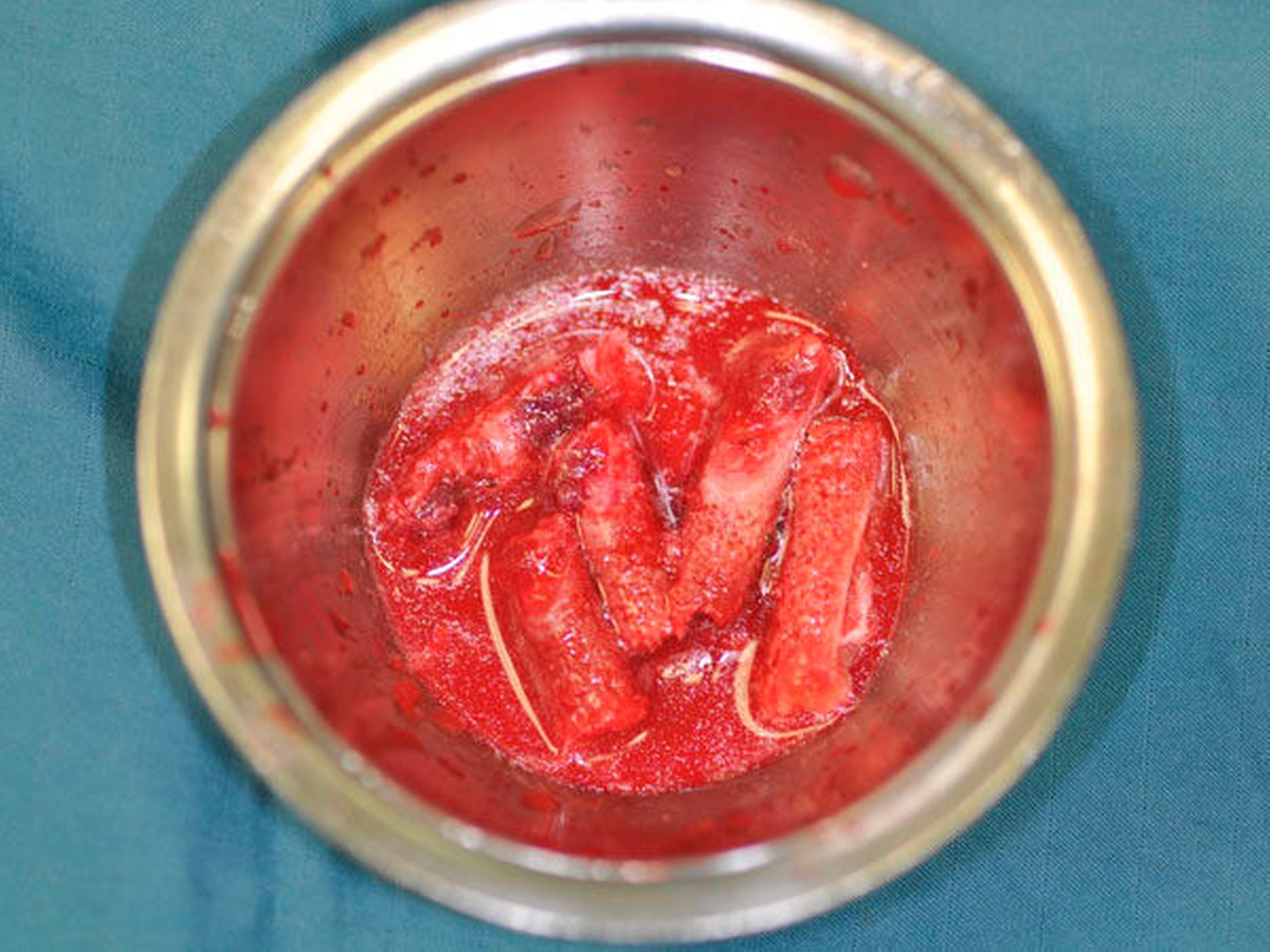 Somit erfolgte die Indikationsstellung zur Zystektomie. Hier wurde die Raumforderung komplett in Einzelteilen aus der Knochenkavität gelöst, wobei sich am Boden des Defekts der retinierte und verlagerte Zahn 38 darstellte (Abbildung 5). Der nach Enukleation des Zystenbalgs kurzstreckig freiliegende Nervus alveolaris inferior wurde nicht touchiert und nach inspektorischer Kontrolle und Spülung der Wundhöhle durch Einlage einer Kollagenmembran geschützt. Die anschließende Augmentation der Kavität erfolgte mittels der gewonnenen Beckenkammspongiosa (Abbildung 6). Über den eingelegten Schmerzkatheter am Becken wurde intraoperativ die erste Dosis 0,5-prozentiges Bupivacain verabreicht.