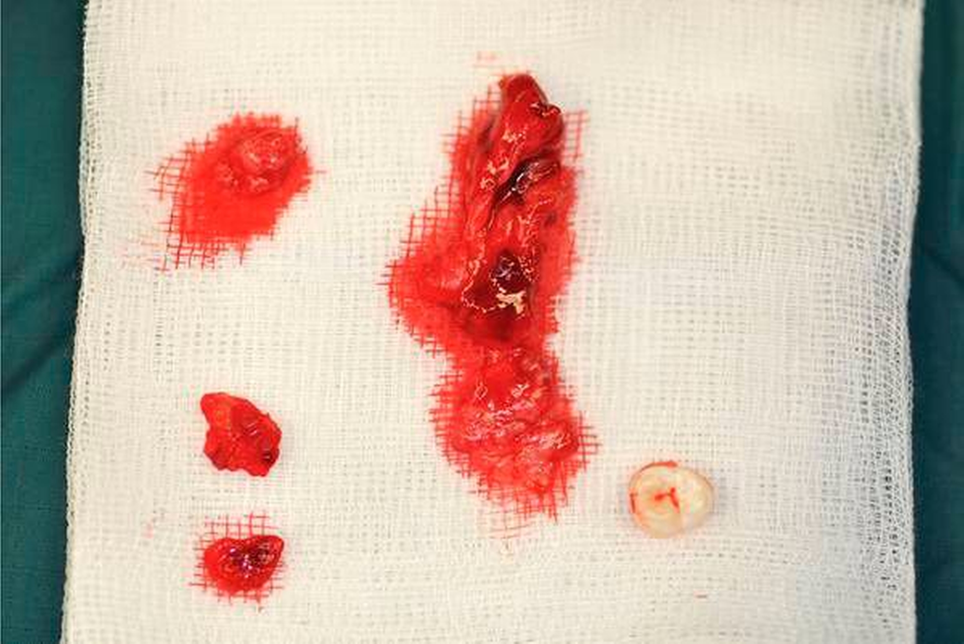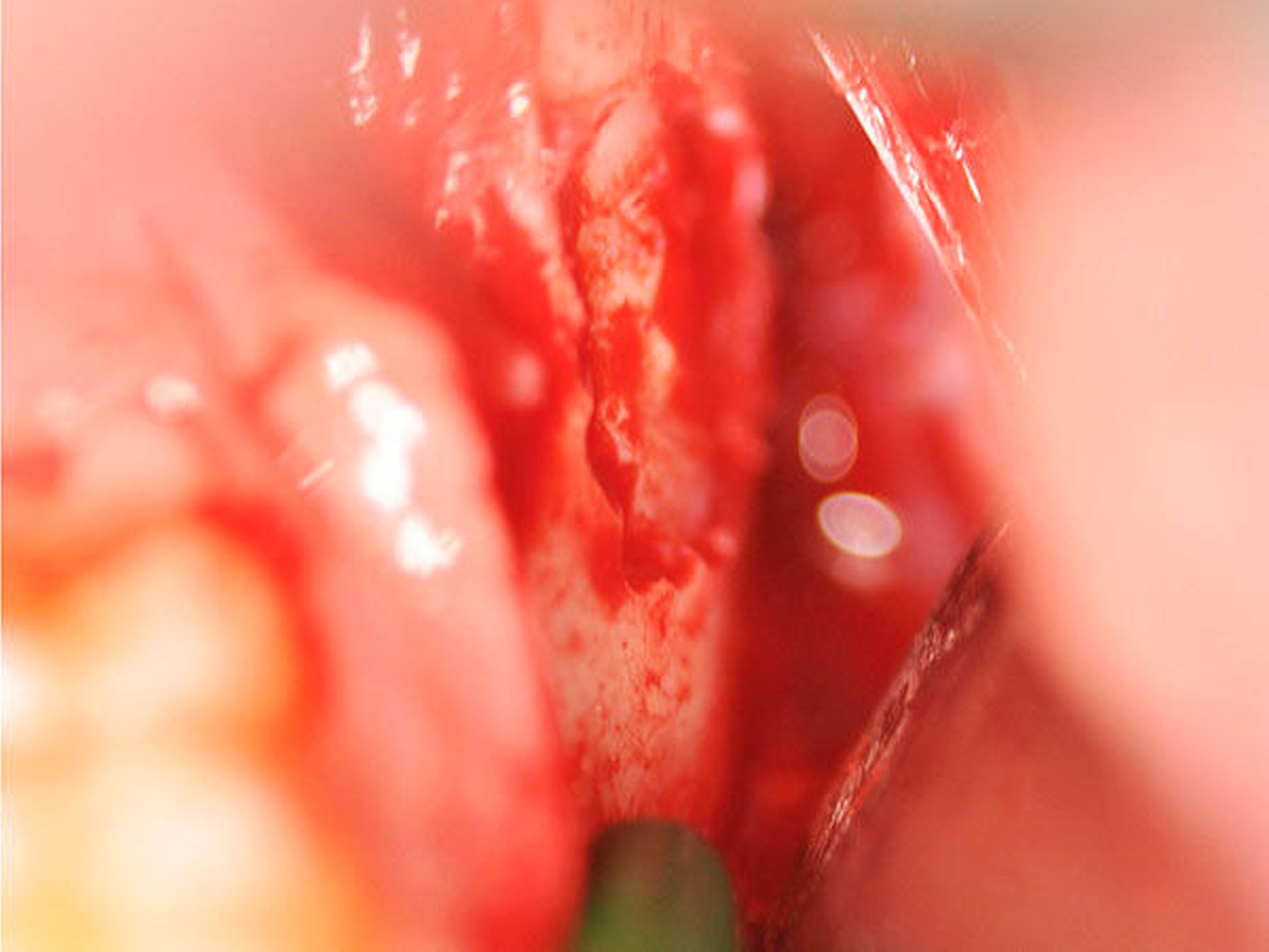 Das Knochenfenster der regio 37/38 konnte ohne Beschädigung der Zystenwand abgehoben werden (Abbildung 4). Nach der Biopsie-Entnahme entleerte sich ein grießiges Material aus der Zyste. Es erfolgte eine ausgiebige Spülung, dann die Einlage einer neuen Drainage sowie eine postoperative i.v.-antibiotische Therapie mittels Ampicillin/Sulbactam (Unacid®).
