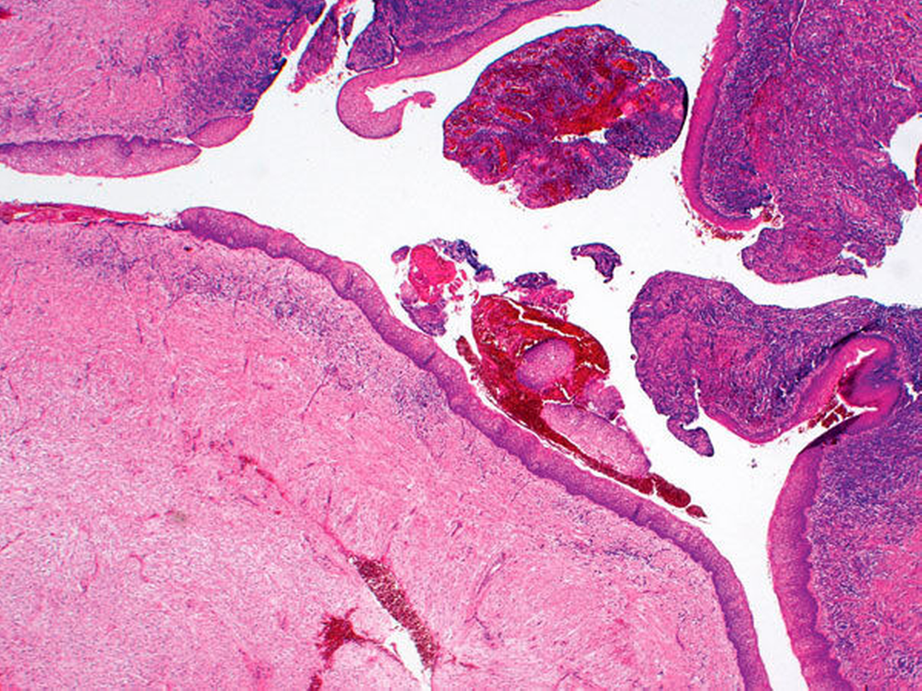 Die histopathologische Begutachtung des Resektionsmaterials zeigte eine plattenepithelial ausgekleidete Zyste mit herdförmiger chronischer Entzündung des Unterkiefers regio 36 bis 38 (Abbildungen 7 und 8).