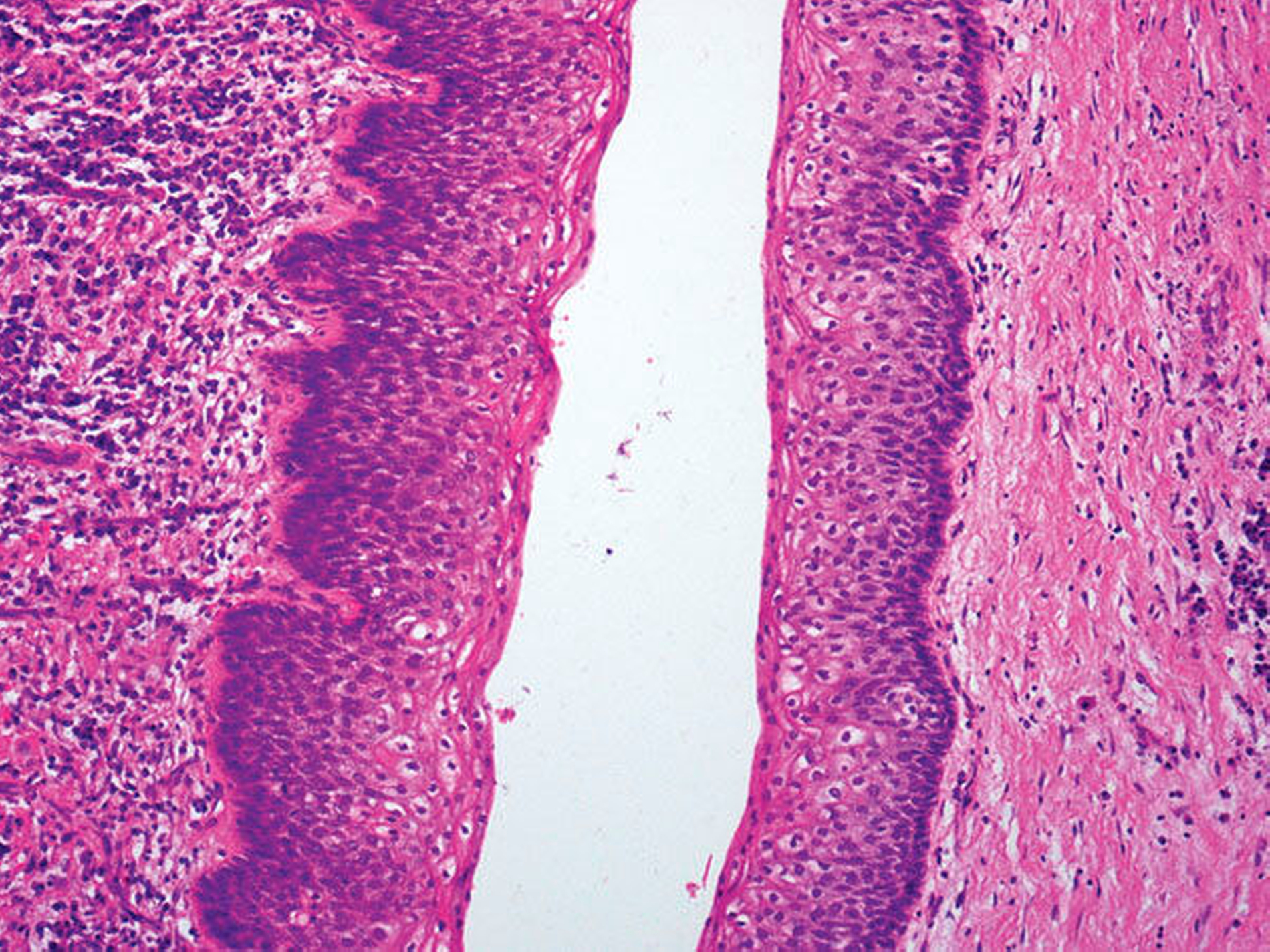 Der weitere Verlauf gestaltete sich komplikationslos, so dass die Patientin nach einem dreitägigen stationären Aufenthalt in die ambulante Weiterbetreuung entlassen werden konnte. Die histologische Begutachtung der entnommenen Probe ergab in den überwiegenden Anteilen ein subepithelial gemischtes Entzündungsinfiltrat. Das dortige Plattenepithel zeigte sich mit ausgezogenen Retezapfen, intraepithelialen Entzündungszellen und einer Spongiosa deutlich entzündlich verändert. In anderen Abschnitten ließ sich ein flach strukturiertes Plattenepithel ohne Abfaltungen der Epitheltapete oder Tochterzysten erkennen. Wenige Bereiche imponierten mukoid mit einem proteoglycanreichen Stroma ohne Epitheltapete. Histopathologisch war dieser Befund mit einer durch eine Entzündung kaschierten follikulären Zyste vereinbar, wobei differenzialdiagnostisch eine orthokeratinisierte odontogene Zyste [Goedecke et al., 2017] nicht auszuschließen war.