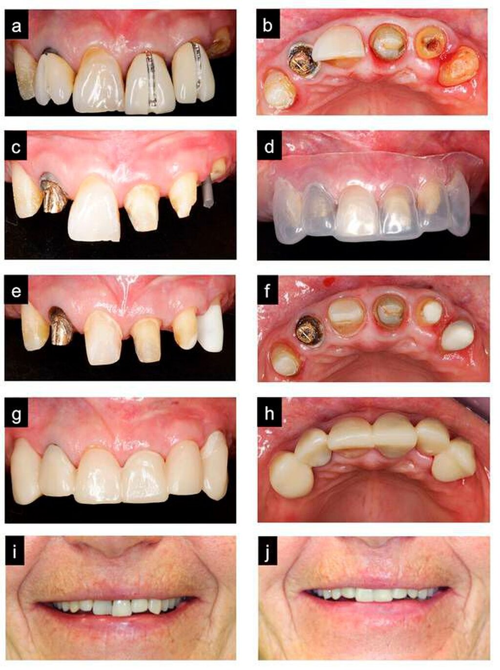 Die Abbildungen 5a bis 5j zeigen den detaillierten Ablauf des folgenden Behandlungsabschnitts, nämlich die Entfernung der Frontkronen, den direkten plastischen Stiftaufbau an Zahn 23 mit einem Titanstift (ER-System, Komet, Deutschland) und einem dualhärtenden Komposit für Stumpfaufbauten (Luxacore Z, DMG, Deutschland), die Vorpräparation an allen Zähnen und die provisorische Versorgung. Eine minimalinvasive, weitestmöglich schmelz-begrenzte Präparation erfolgte an Zahn 11 für die spätere Aufnahme eines Full Veneers.