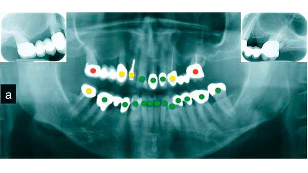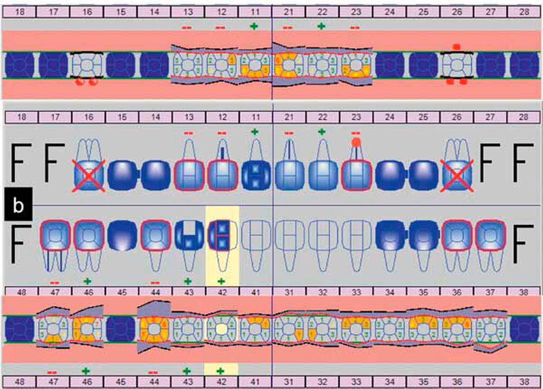 In der Erstuntersuchung ergab sich ein unauffälliger extraoraler Befund. Die Untersuchung der Lippen, der Zunge und der Mundschleimhaut zeigte keine pathologischen Veränderungen. Die dentale und parodontale Untersuchung ergab multiple insuffiziente Kronen, moderat bis teilweise stark erhöhte Sondierungswerte an mehreren Zähnen und unter anderem eine apikale Aufhellung am endodontisch insuffizient versorgten Zahn 23, der zudem noch bis auf Gingivaniveau kariös war. Der Zahn 12 war im zervikalen Bereich stark verfärbt (Rezession) und laut Röntgenanalyse mit einem Stiftaufbau versorgt. Beide Oberkiefermolaren wiesen einen hohen Attachmentverlust und einen Furkationsgrad von II-III auf. Insgesamt war der Zahnersatz ungefähr 15 Jahre alt.