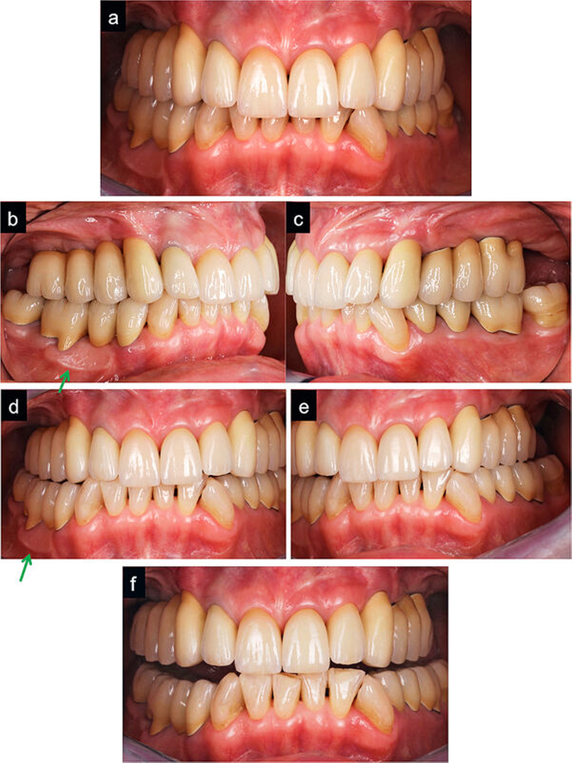 In der ästhetischen Zone der Oberkieferfront wurden an Zahn 11 ein individuell verblendetes Full Veneer auf Basis eines Lithiumdisilikatkeramikgerüsts und an den übrigen Zähnen in regio 13–23 vollkeramische, vollverblendete Kronen auf Basis eines Zirkoniumdioxidgerüsts angefertigt. Bei den Versorgungen im Seitenzahnbereich wurden vollverblendete, metallkeramische Versorgungen mit feinem Metallrand verwendet, lediglich an 37 wurde eine monolithische Teilkrone aus Lithiumdisilikatkeramik angefertigt. Die Implantatbrücken wurden aufgrund von ungünstigen Implantatangulationen, die keine okklusale Verschraubung ermöglichten, zementiert. Aufgrund der geringen Lachhöhe im Oberkiefer-Seitenzahnbereich konnten hier die Präparationsränder der Abutments epigingival gelegt werden und waren somit gut von Zementüberschüssen zu reinigen. Es wurde auf eine reinigbare Konstruktion des Zahnersatzes geachtet. Als Okklusionskonzept wurde eine Front-Eckzahn-geschützte Okklusion realisiert (Abbildungen 8a bis 8f).