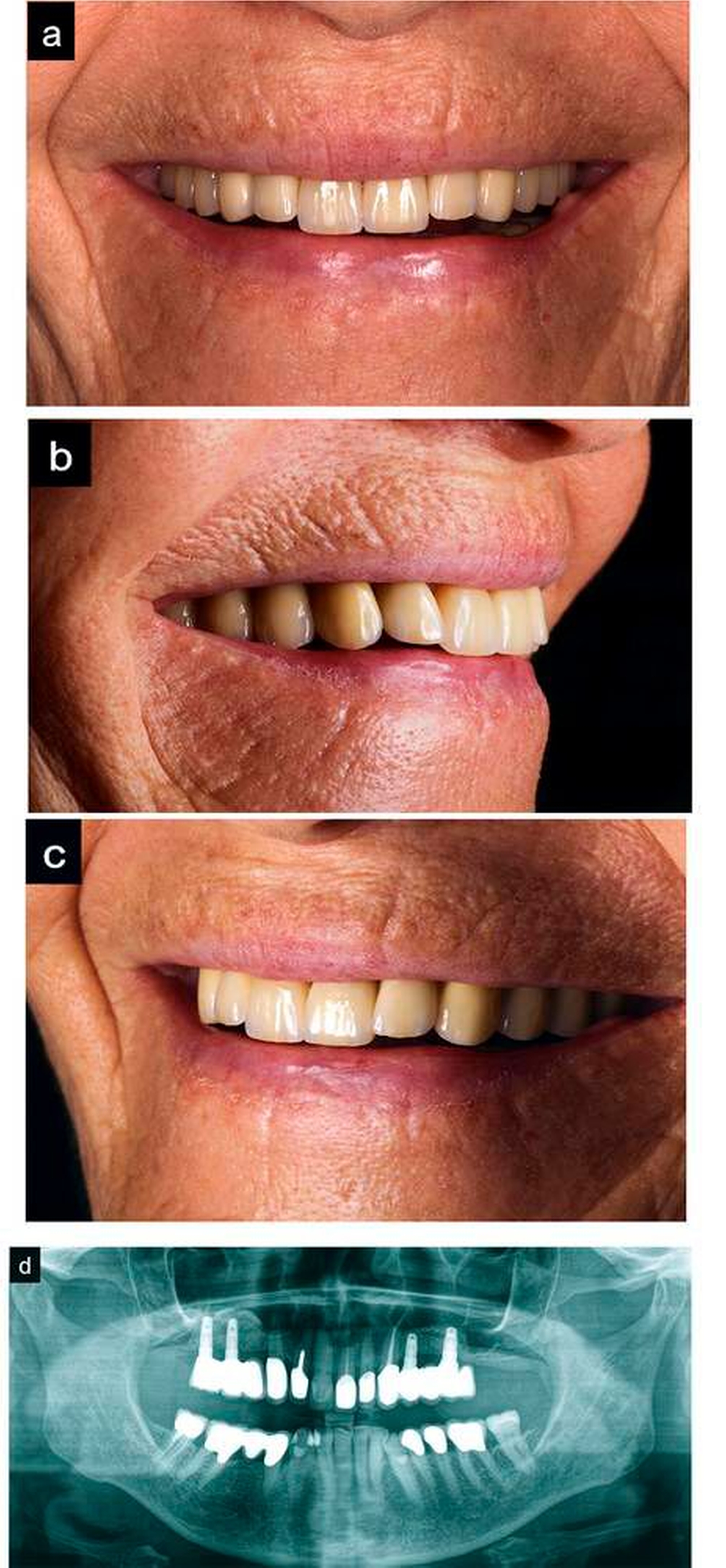 Bei einem Kontrolltermin zwei Wochen nach Eingliederung zeigte sich die Patientin mit dem Zahnersatz sehr zufrieden (Abbildungen 9a bis 9c). In einem aktuellen Recalltermin 2,5 Jahre nach Eingliederung ergab der parodontale Befund physiologische Sondierungswerte. Auch die Panoramaschichtaufnahme offenbart eine stabile Situation.