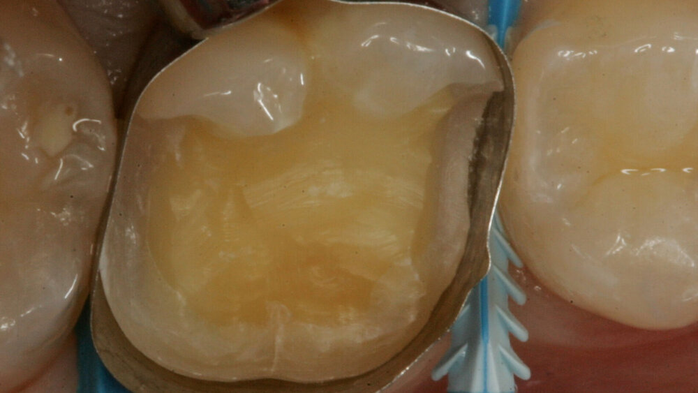 Da somit Sekundärkaries und eine Infraktion als Ursache der Beschwerden ausgeschlossen werden konnten, blieb als Ursache der Heiß-/Kalt-Beschwerden im Prinzip die fehlende Zementunterfüllung unter der großflächig auf dem Dentin aufsitzenden Metallrestauration, welche sämtliche Temperaturspitzen ungepuffert auf das Dentin weiterleitete.