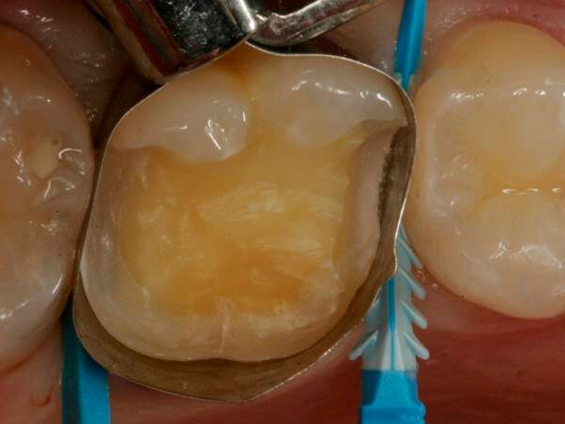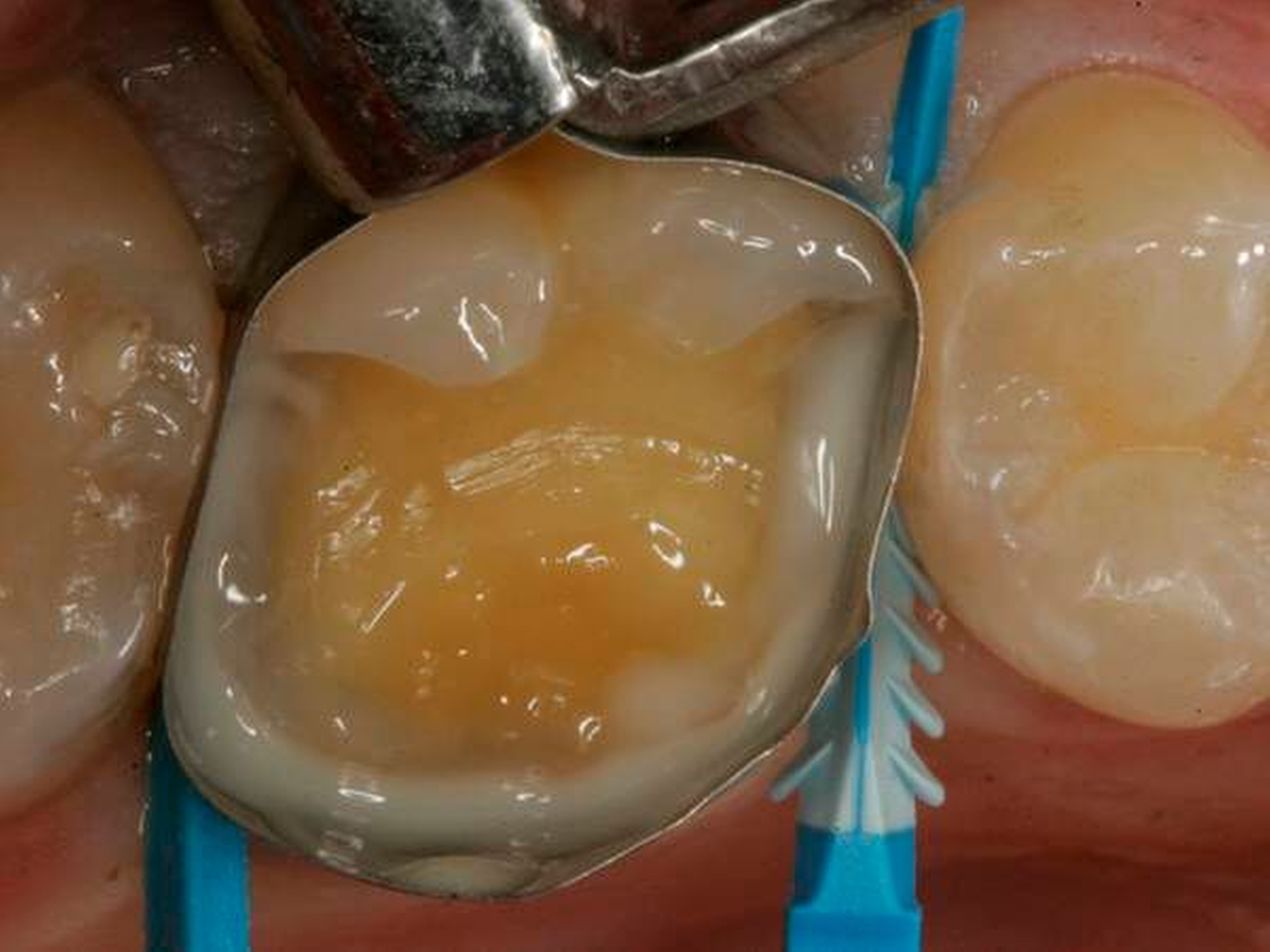Die Abbildung 2 zeigt die nachpräparierte und mit einem zirkulären, anatomischen Tofflemire-Band (Kerr) isolierte Kavität. Die approximale Abdichtung und Separation erfolgten mithilfe eines Compositight Fusion Wedges (Garrison) mesial und eines G-Wedges (Garrison) distal.