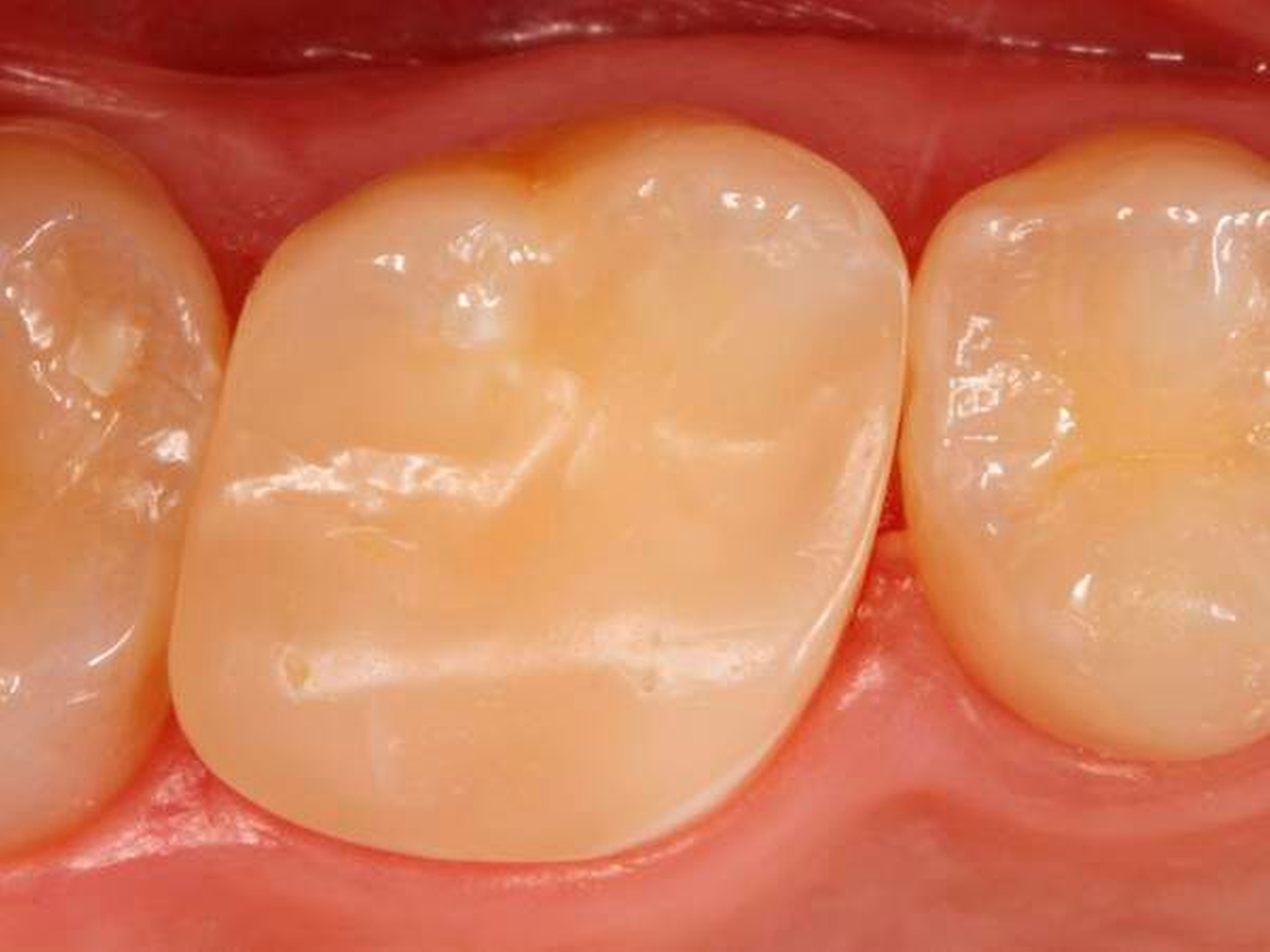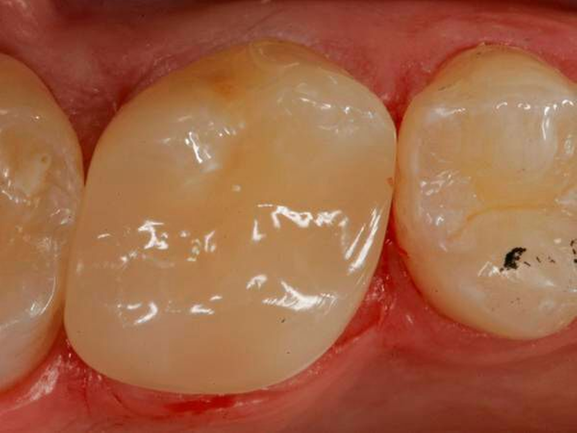 Abbildung 4 zeigt die fertig ausgearbeitete und polierte Restauration unmittelbar nach Behandlungsabschluss, Abbildung 5 bei einer weiteren Kontrolle nach einem Jahr: Der Zahn war inzwischen komplett beschwerdefrei, zeigte im Sensibilitätstest vergleichbare Reaktionen wie die Nachbarzähne. Die Oberfläche erschien allerdings etwas matt, was aber durch eine kurze Nachpolitur (Sof-Lex Polierrad „sehr fein“, 3M) wieder in eine hochglänzende Oberfläche verwandelt werden konnte (Abb. 6). Die Restauration integrierte sich ästhetisch und funktionell optimal in die umgebende Zahnhartsubstanz.