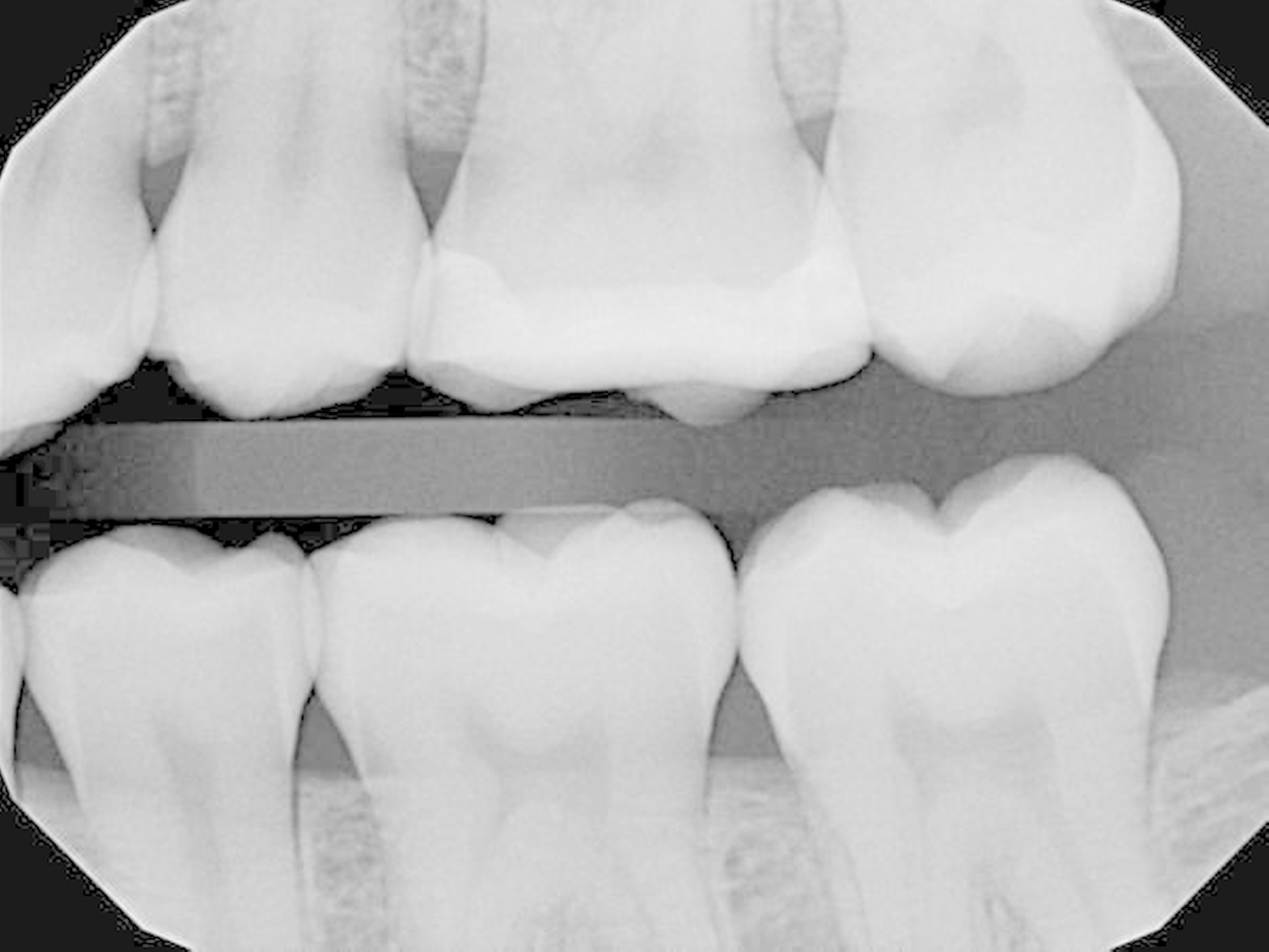 Abbildung 7 zeigt die in der Recall-Sitzung angefertigte Routine-Bissflügelaufnahme, aus der die geringe vertikale Dimensionierung der Versorgung gut erkennbar ist. Die Patientin war mit dieser Neuversorgungsvariante hochzufrieden. Eine Neuversorgung mit einer indirekten Restauration erscheint somit zunächst nicht erforderlich. Auf diese Weise konnte der Zahn mit (im Vergleich zu den angedachten indirekten Restaurationsvarianten) vergleichbar geringem Aufwand zahnhartsubstanzschonend neu versorgt werden.