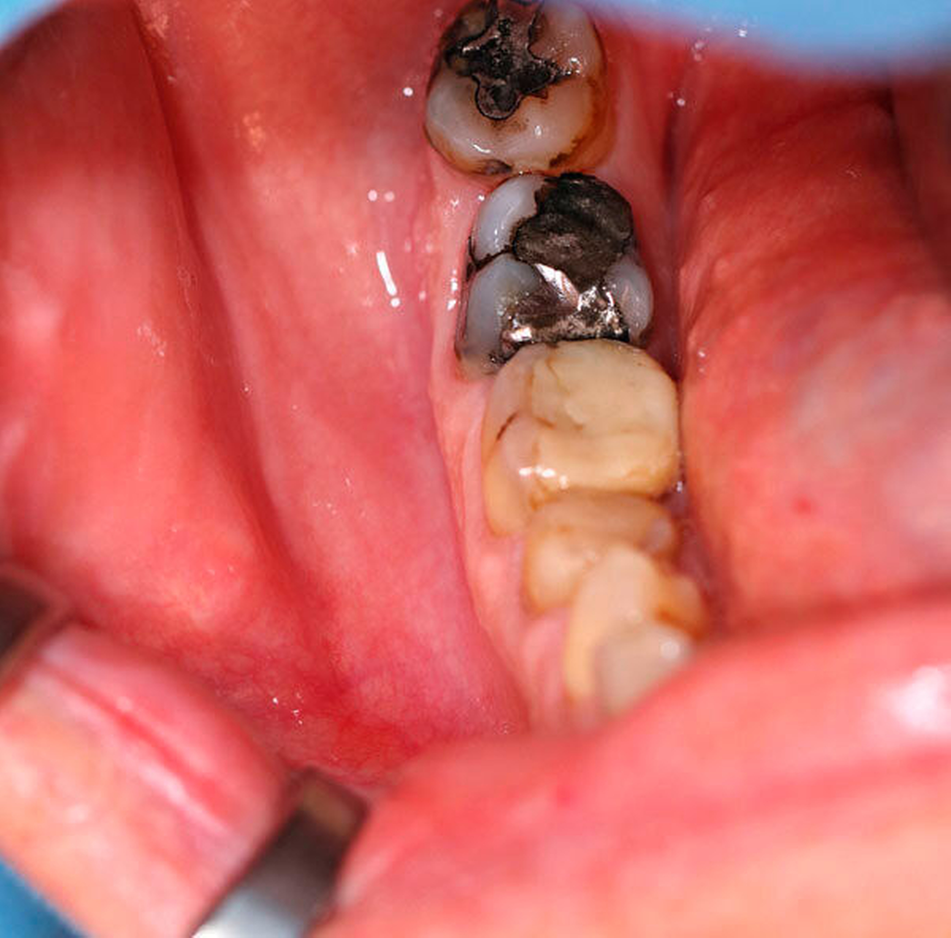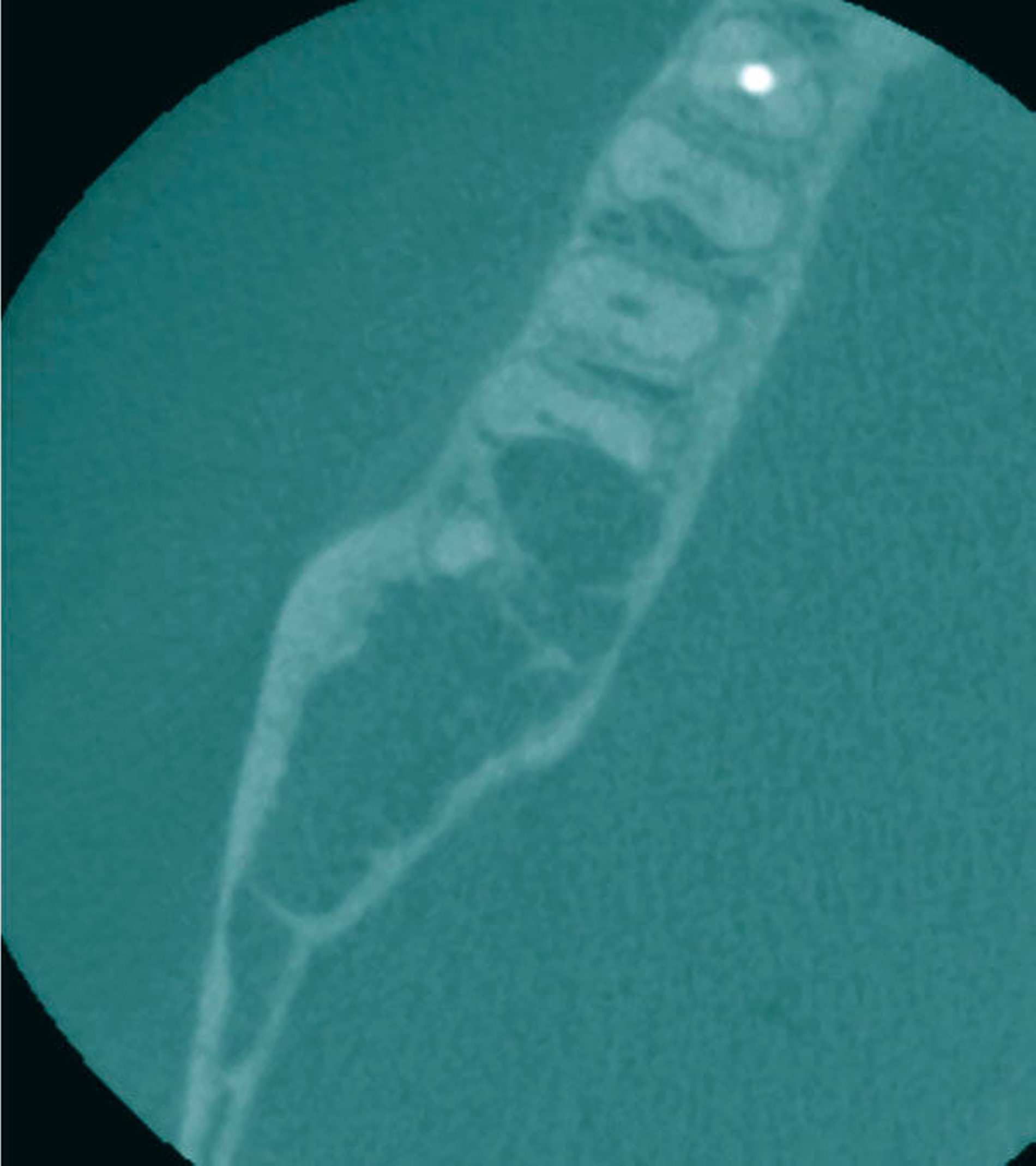 Auf der alio loco durchgeführten Panoramaschichtaufnahme (Abbildung 1) war eine ausgeprägte, zystische Raumforderung mit einer Ausdehnung von Regio 46 bis Regio 48 zu erkennen. Klinisch zeigten sich keine Sensibilitätsstörungen im Bereich des Nervus alveolaris inferior. Die Vitalitätsprüfung der Zähne 46 bis 48 fiel positiv aus, es bestand auch keine Perkussionsempfindlichkeit (Abbildung 2). Zahn 48 fiel durch eine drittgradige Lockerung auf. Auf Palpation entleerte sich kein Pus. Die anschließend durchgeführte Digitale Volumentomografie (Abbildung 3) zeigte einen invasiv wachsenden, teils honigwabenähnlichen, zystischen Befund des rechten Unterkiefers mit einer Ausdehnung in den Canalis mandibulae sowie in Teile des aufsteigenden Unterkieferasts. Darüber hinaus ließen sich Wurzelresorptionen der Zähne 47 und 48 eruieren.