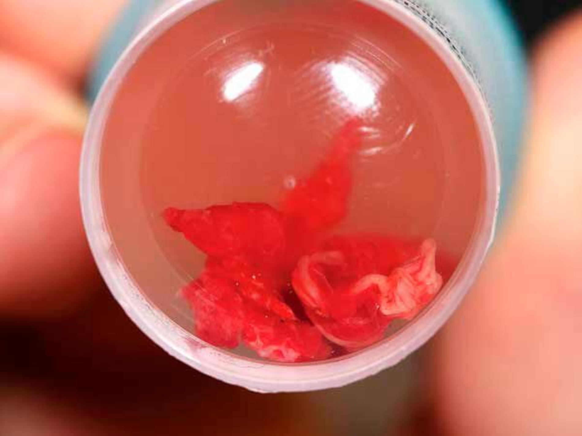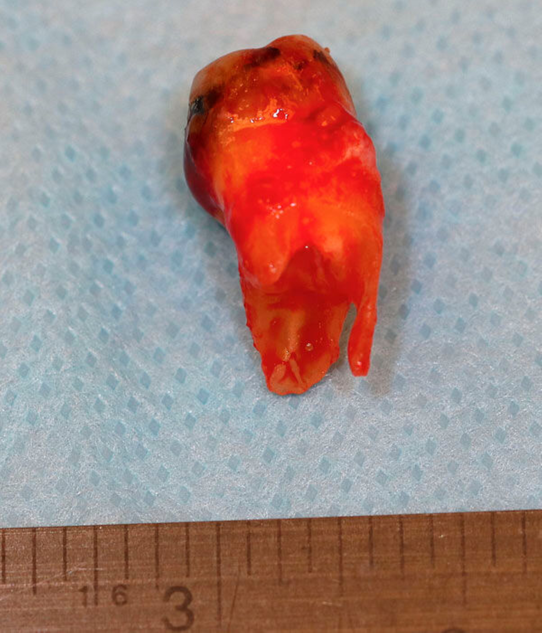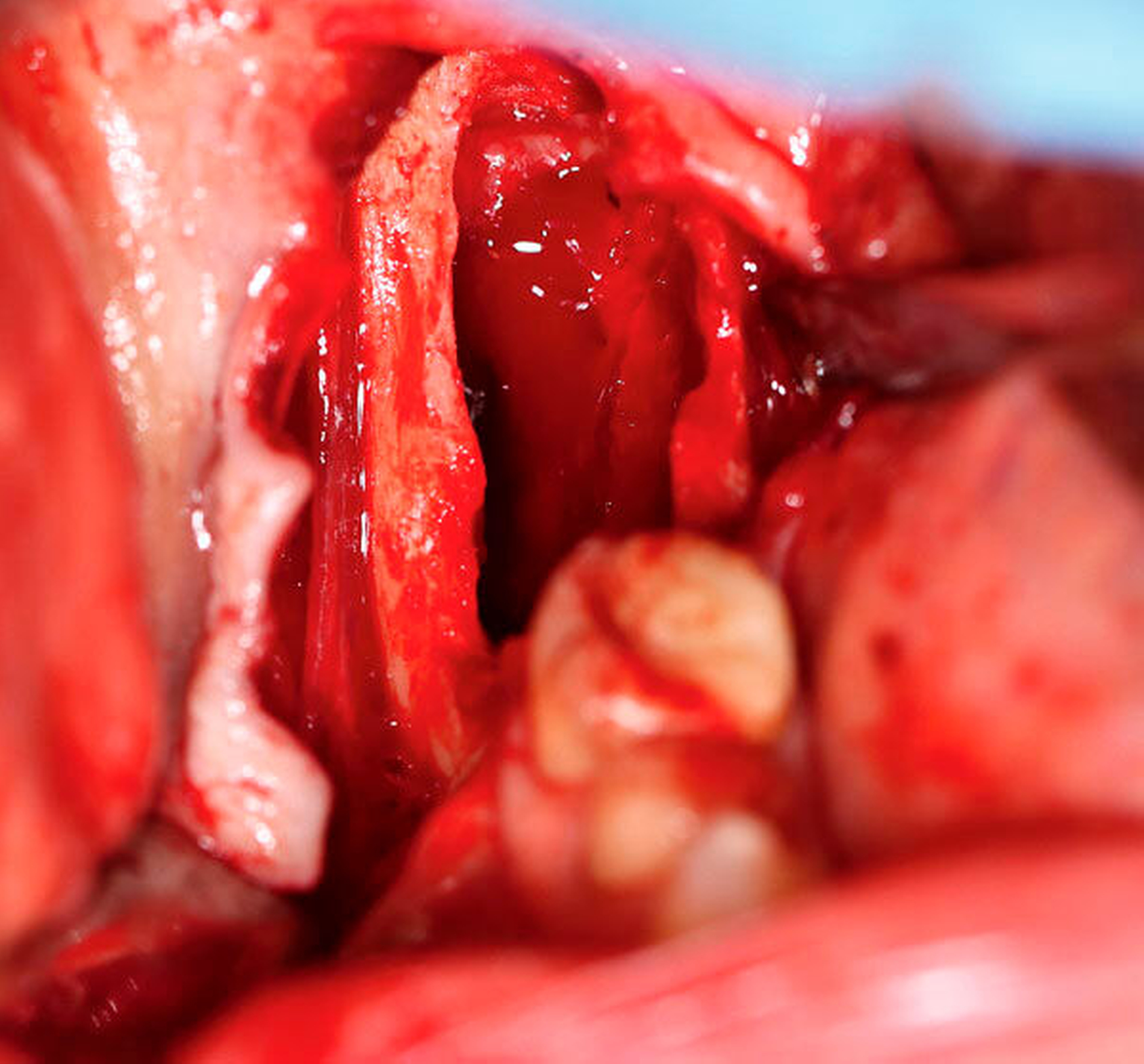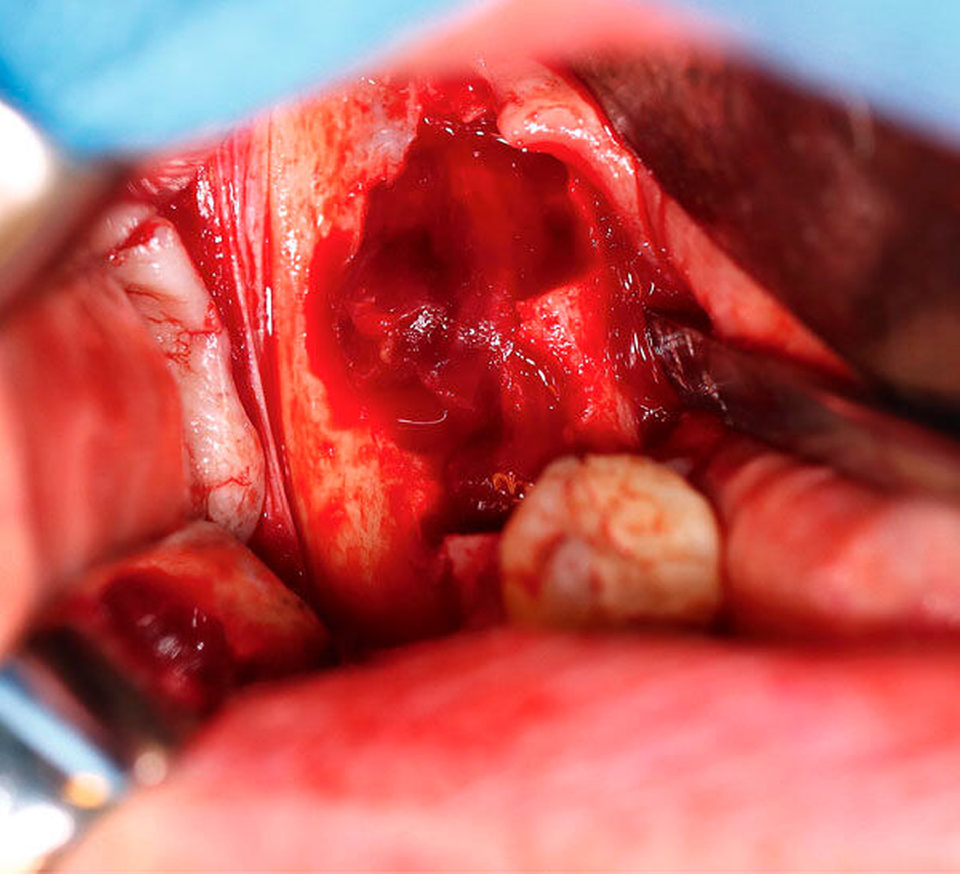 In Zusammenschau der klinischen und der radiologischen Befunde wurde die Verdachtsdiagnose eines Ameloblastoms beziehungsweise einer Keratozyste gestellt. Nach ausführlicher Beratung über mögliche Differenzialdiagnosen und Therapieoptionen entschied sich die Patientin zur Entfernung der Raumforderung in Intubationsnarkose. Hierbei erfolgte zunächst die Extraktion der teils stark gelockerten Zähne 47 und 48. In beiden Fällen konnte die vorher radiologisch auffällige Wurzelresorption ausgemacht werden (Abbildung 4). Nach der Extraktion breitete sich über die Extraktionsalveolen Zysteninhalt in die Mundhöhle aus (Abbildung 5). Im Anschluss wurde die Raumforderung unter Schonung des kaudal der Zyste verlaufenden Nervus alveolaris inferior exkaviert. Hierbei kam es im dorsalen Anteil der Kavität zu einer arteriellen Blutung, die nach elektrischer Kauterisation und Einbringen von Knochenwachs zum Stillstand gebracht werden konnte (Abbildung 6). Nach vorsichtiger modellierender Osteotomie folgten die Einlage eines Kollagenvlies und der mehrschichtige Wundverschluss.