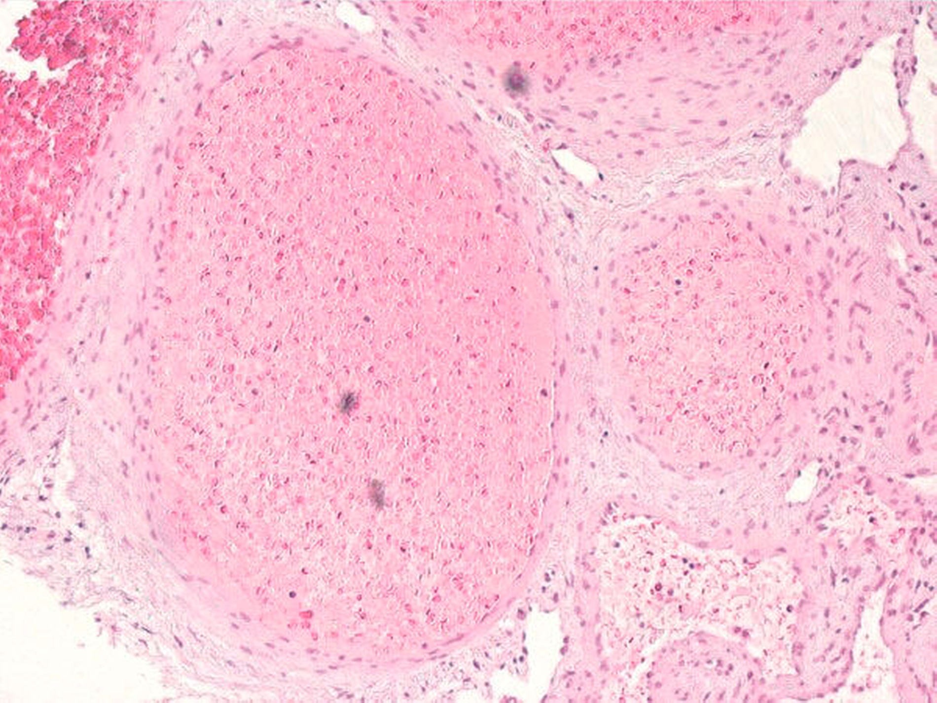Die histopathologische Aufbereitung des Präparats (Abbildung 7) erbrachte den Nachweis eines kavernösen Hämangioms ohne den Anhalt auf Gewebetransformation (Abbildung 8). Der postoperative Verlauf gestaltete sich bis auf eine kurzfristig bestehende Wunddehiszenz mit sekundärer Granulation unauffällig. Sensibilitätsdefizite bestanden zu keiner Zeit.