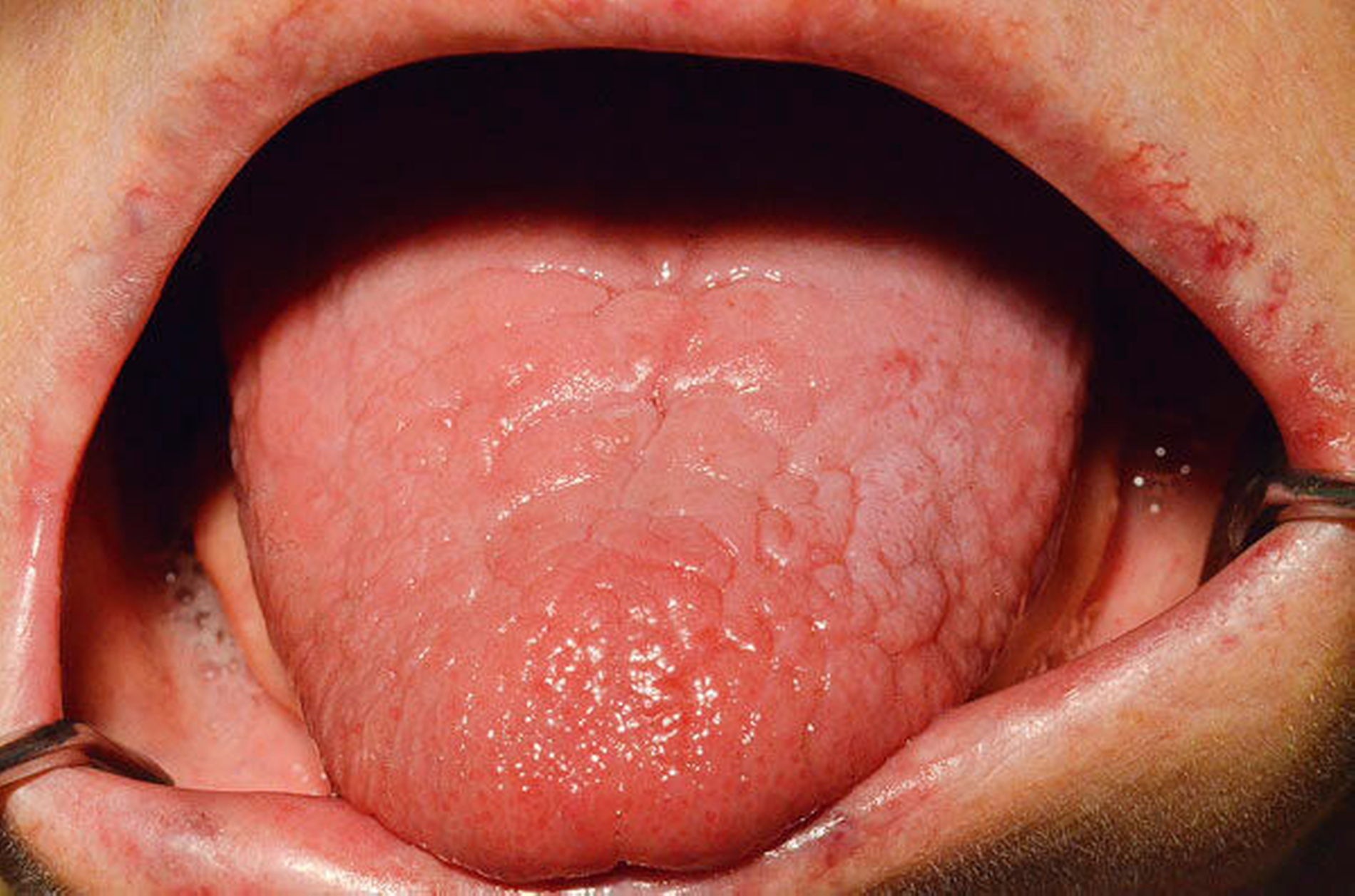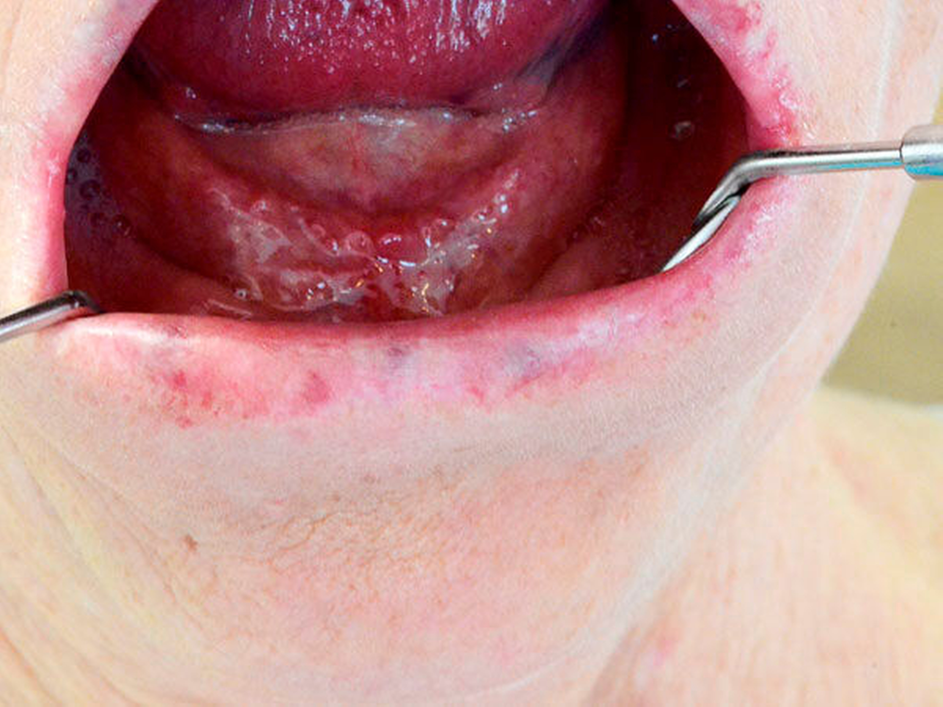 Bei der klinischen Untersuchung zeigten sich neben den nicht erhaltungswürdigen Zähnen eine Lingua plicata (Abbildung 2), aber auch multiple fleckige Veränderungen auf der Mundschleimhaut (Abbildung 3). Bei diesen Veränderungen handelte es sich allein um farbliche, das heißt rötlich-bläuliche, Alterationen, die nicht über das Niveau der Schleimhäute erhaben waren. Hier lag der Verdacht auf das Vorliegen eines Morbus Osler nahe, der von der Patientin auch so bestätigt wurde. Abgeklärt worden war dies in einer hämatoonkologischen Praxis.