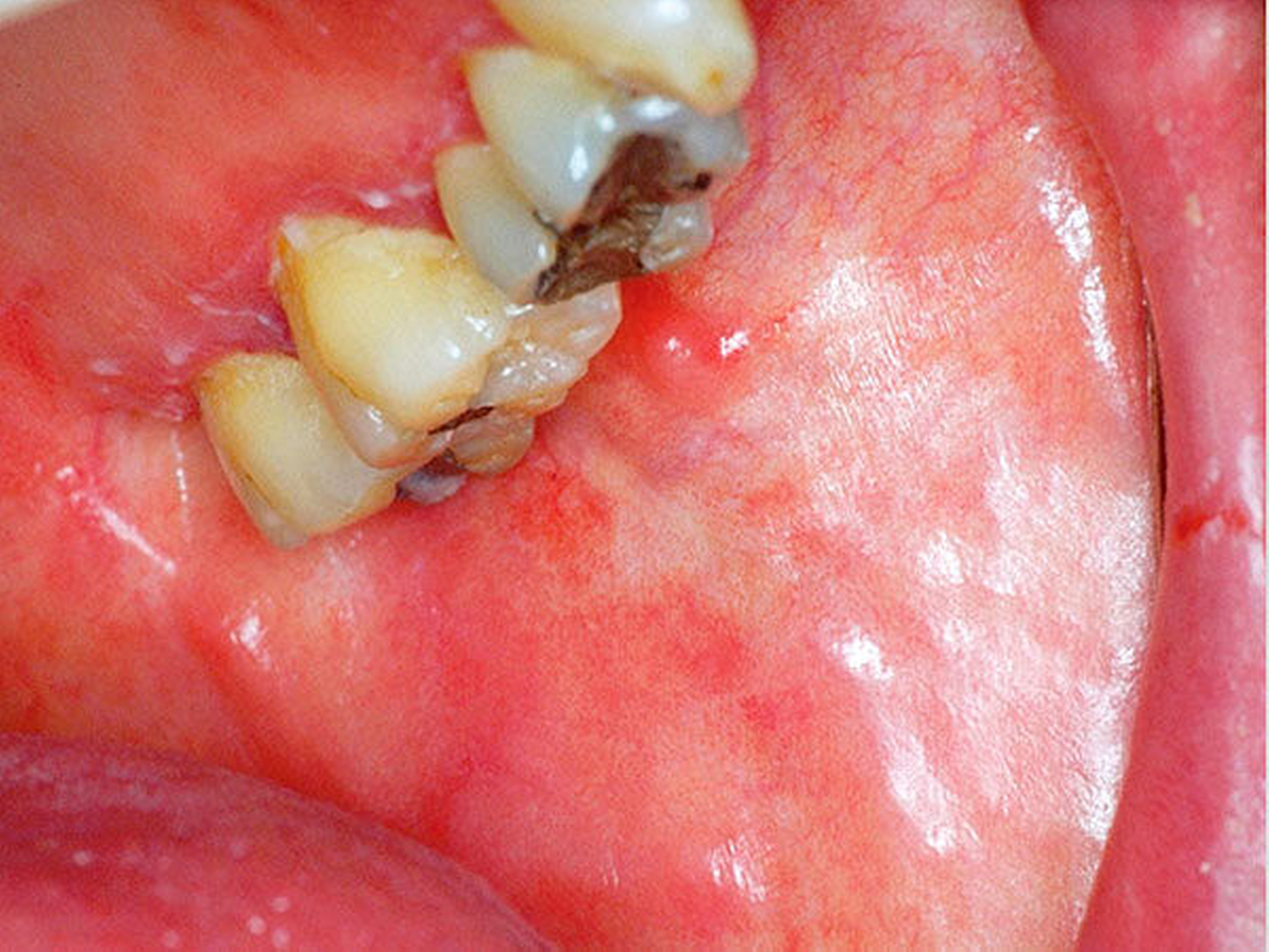 Die Prävention und Therapie der oralen Mukositis ist komplex, wobei der Prävention insgesamt bei fehlenden kausalen Ansätzen der größte Stellenwert zugesprochen wird. In der Literatur werden über 40 Optionen zur Prävention und Therapie beschrieben, wobei viele nur in einer der fünf beschriebenen Phasen der oralen Mukositis wirken [Keiner, 2010]. Hinsichtlich der Prävention nehmen Zahnpflege, Optimierung der Mundhygiene, Schleimhautpflege und der engmaschige zahnärztliche Recall eine besondere Rolle ein. Neben den bekannten Maßnahmen, die im Zuge einer geplanten Bestrahlung im Kopf-Hals-Bereich durchzuführen sind, wie zum Beispiel der Fluoridierung mittels Fluoridierungsschiene zur Prophylaxe der Strahlenkaries als Folge der Xerostomie (Abbildung 6) und der Anfertigung eines Weichgeweberetraktors/Strahlenschutzschiene (3 bis 5 mm dicke PMMA-Folien) als Abstandhalter zwischen metallischen Restaurationen und den Schleimhäuten und somit zur Dosisreduktion der Strahlung an den Schleimhäuten, gilt besonders die prätherapeutische Zahnsanierung als eine der effizientesten Maßnahmen, die sowohl der Prophylaxe einer infizierten Osteoradionekrose (Abbildung 3) als auch einer oralen Mukositis (Abbildungen 4 und 5) zugute kommen. In diesem Zusammenhang sollten sowohl zur Prophylaxe der infizierten Osteoradionekrose als auch der Mukositis alle konservierenden und prothetischen Maßnahmen abgeschlossen, laufende Parodontalbehandlungen beendet und entzündlich beherdete oder nicht erhaltungswürdige Zähne vor Therapiebeginn entfernt sein. Sollten während einer laufenden Radio- und/oder Chemotherapie und einer möglicherweise auftretenden oralen Mukositis zahnärztliche und/oder zahnärztliche-chirurgische Behandlungen erforderlich sein, sollten diese nach Möglichkeit und kritischer Prüfung der Indikation in Anlehnung an die aktuelle S2k-Leitlinie zur Infizierten Osteoradionekrose nach Abschluss der Akuttoxizität, also etwa sechs bis acht Wochen nach Abschluss der Radio- und/oder Chemotherapie, durchgeführt werden [Krüger et al., 2018].