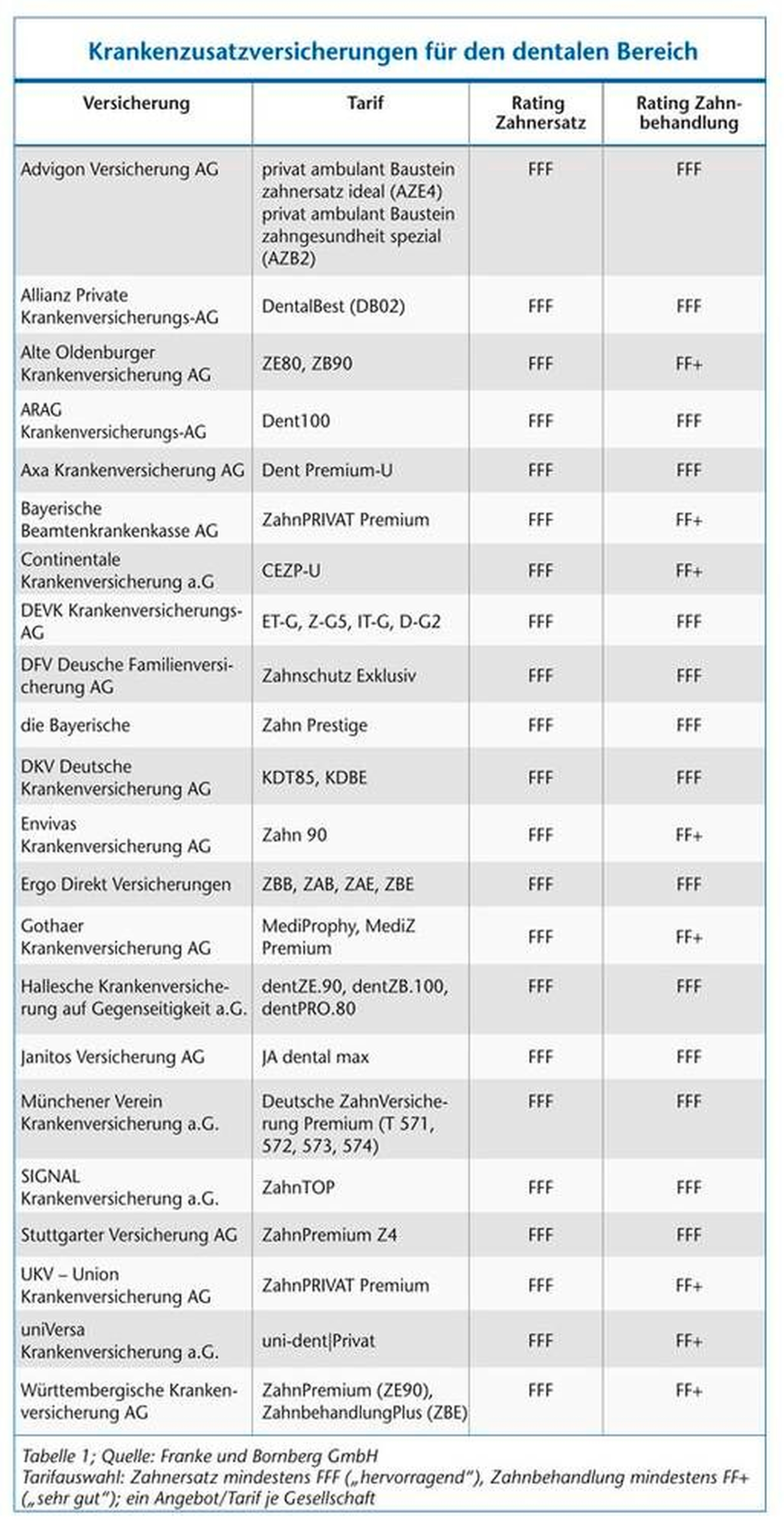 Für die zm haben Franke und Bornberg beispielhaft die Tarife ausgewählt, die bei Zahnersatz mindestens ein FFF für „hervorragend“ und bei Zahnbehandlung mindestens ein FF+ für „sehr gut“ erreichen: