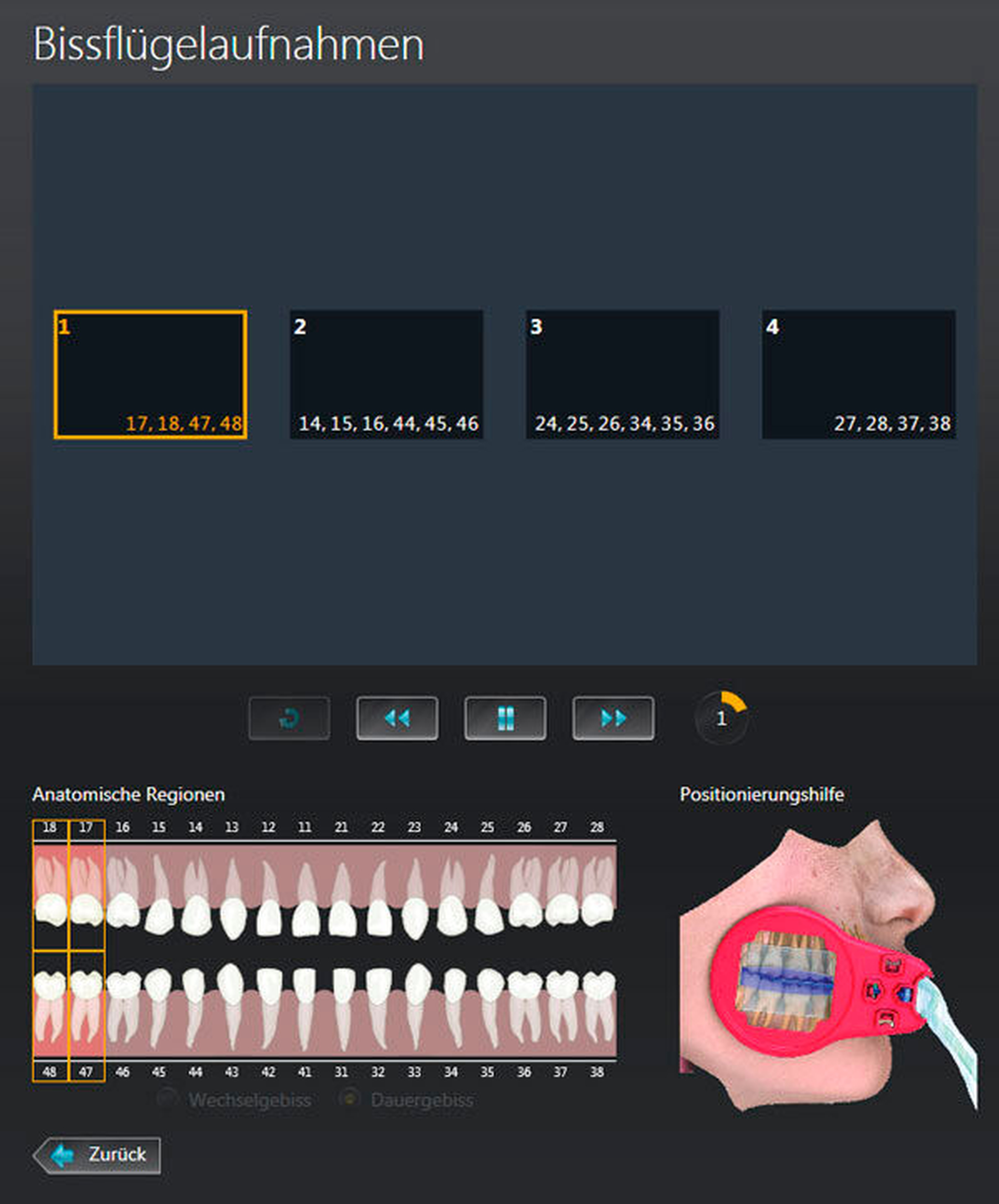 Nach dem Aufruf der Patientendaten muss der Software mitgeteilt werden, welche Röntgenaufnahme durchgeführt werden soll. Warum ist diese Information relevant und was passiert, wenn an dieser Stelle Fehler gemacht werden? Für Aufnahmeserien (zum Beispiel Bissflügelaufnahmen oder Röntgenstaten) kann die Software den Anwender dabei unterstützen, dass die Orientierung und spätere Anordnung der Bilder auf dem Monitor logisch erfolgt (Abbildung 1).
