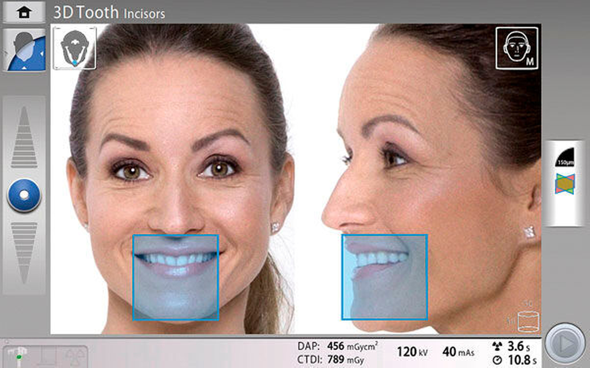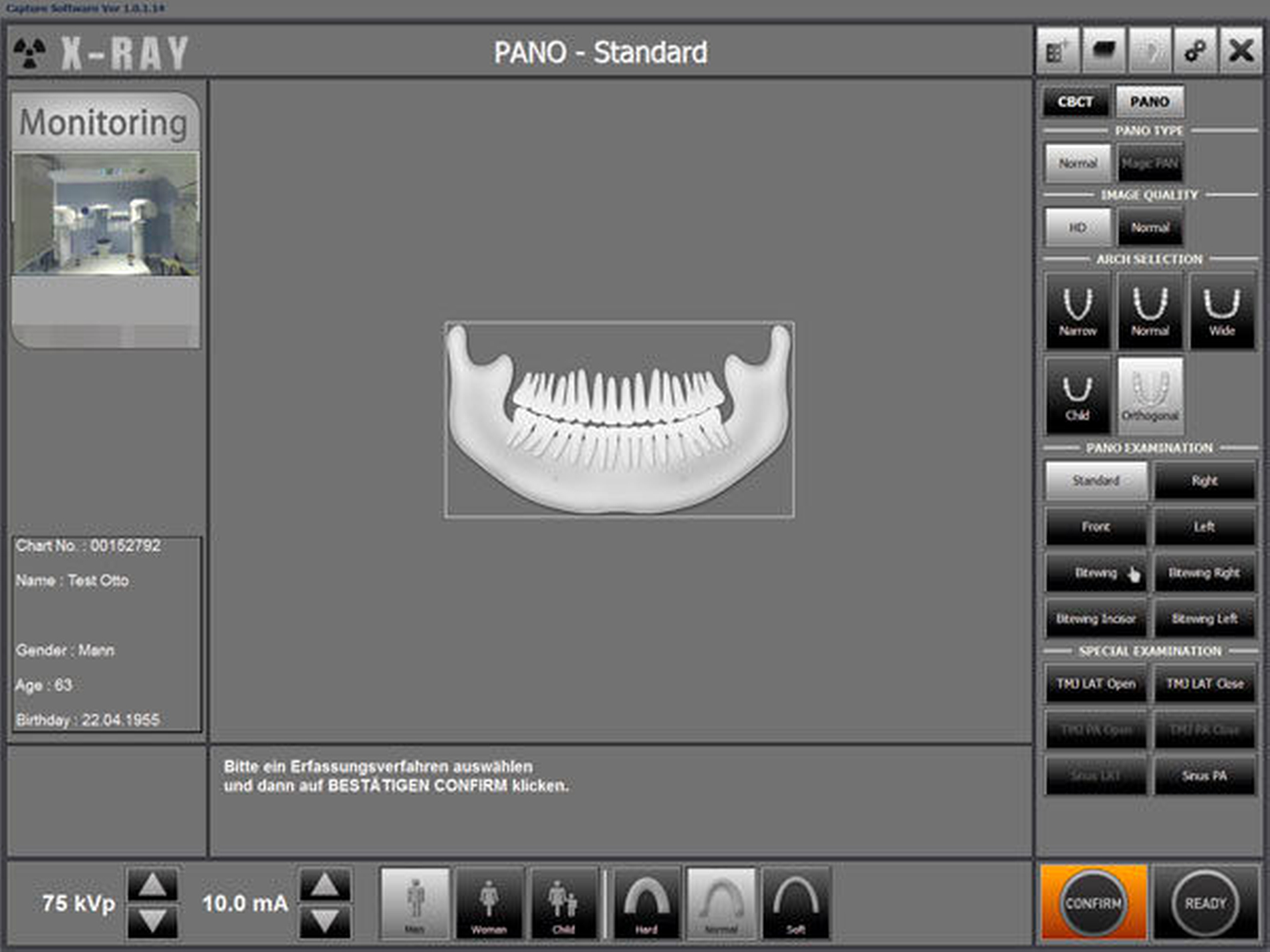 Bei Systemen, bei denen die Ansteuerung des Röntgengeräts (zum Beispiel OPG) am PC erfolgt, wird an dieser Stelle festgelegt, welches Programm durchgeführt wird, also zum Beispiel „Halbseiten-OPG“ oder „Kinderprogramm für OPG“. Auch Parameter wie die Kieferform und die Dosiseinstellungen werden an dieser Stelle ausgewählt. Der Vorteil dabei ist, dass man auf einem großen Monitor viele Auswahlmöglichkeiten parallel darstellen und somit auswählen kann (Abbildung 2).