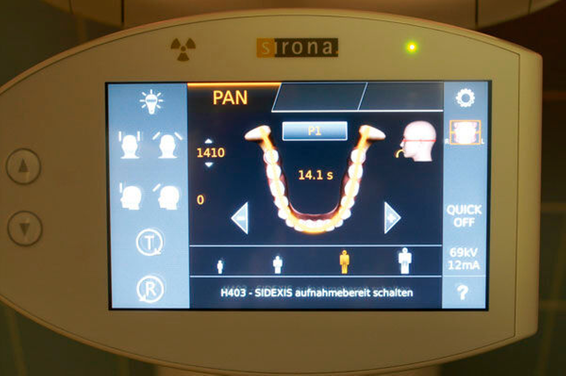Ein anderes Prinzip (bei der Durchführung extraoraler Aufnahmeverfahren) ist, das Röntgenprogramm und die Expositionsdaten am Röntgengerät selbst auszuwählen. Vorteil hierbei ist, dass man den Patienten unmittelbar vor sich hat (Dosisfestlegung, Kieferformauswahl), als Nachteil schlägt zu Buche, dass die üblicherweise kleinen Bedienfelder an den Röntgengeräten (Touchscreens oder Tastenfelder in Verbindung mit kleinen Monitoren) unterschiedliche Auswahloptionen nicht gleichzeitig darstellen können und man deswegen gegebenenfalls mehrere Menüebenen bearbeiten muss (Abbildung 3). Hierbei besteht die Gefahr, dass einfache Standardeinstellungen bevorzugt und komplizierter auszuwählende Optionen seltener genutzt werden, wodurch es zu einer unnötig hohen Strahlenbelastung kommen kann.