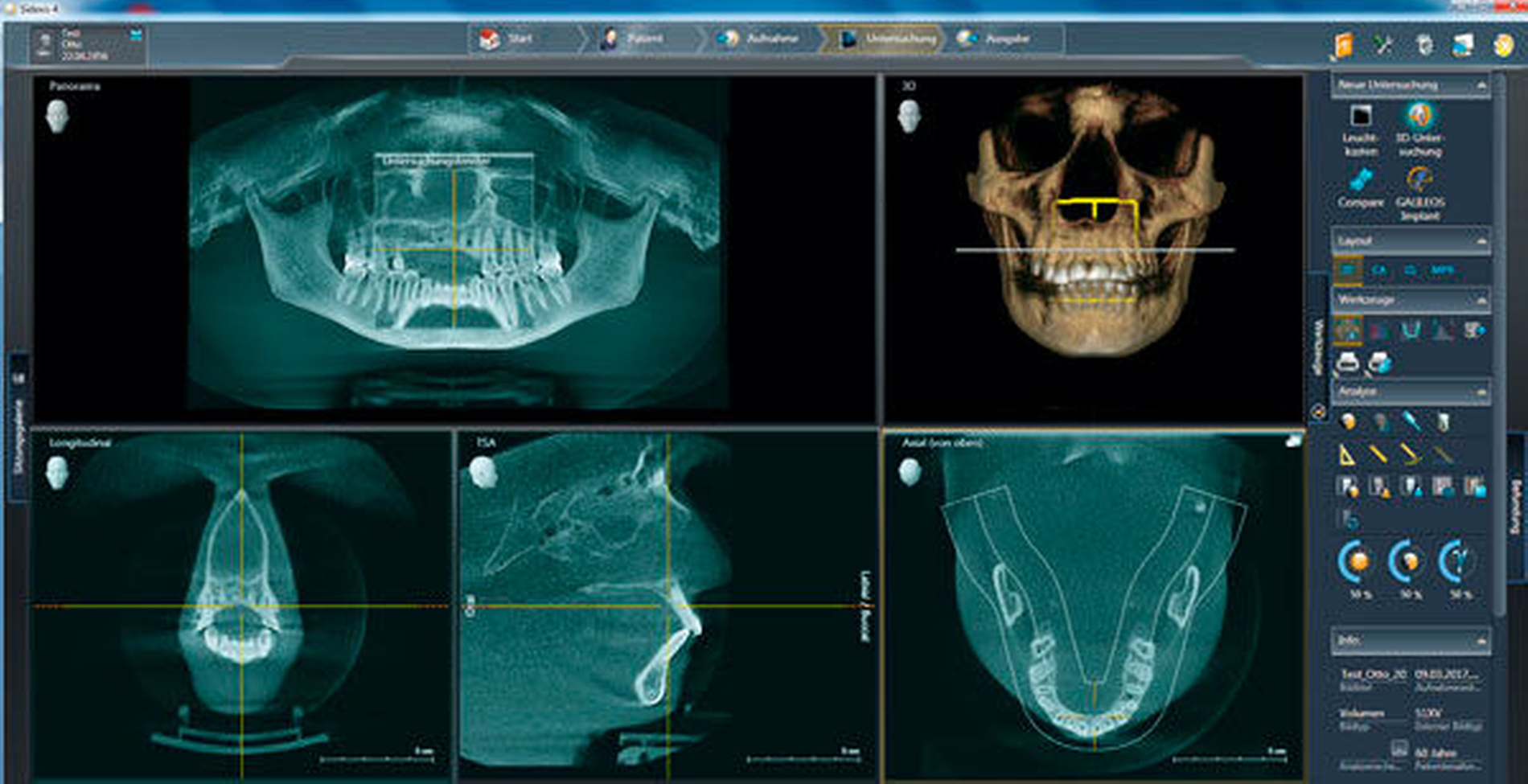Bei DVT-Aufnahmen ist die Darstellung des Field of Interest wesentlich komplizierter als bei zweidimensionalen Bildern, da die primäre Präsentation des Volumens nicht automatisch die diagnostisch relevante Region wiedergibt. Ein Prinzip, das – in den Augen der Industrie – Zahnärzten die Betrachtung erleichtern soll, ist, dass die Software automatisch ein OPG aus dem Datensatz errechnet.