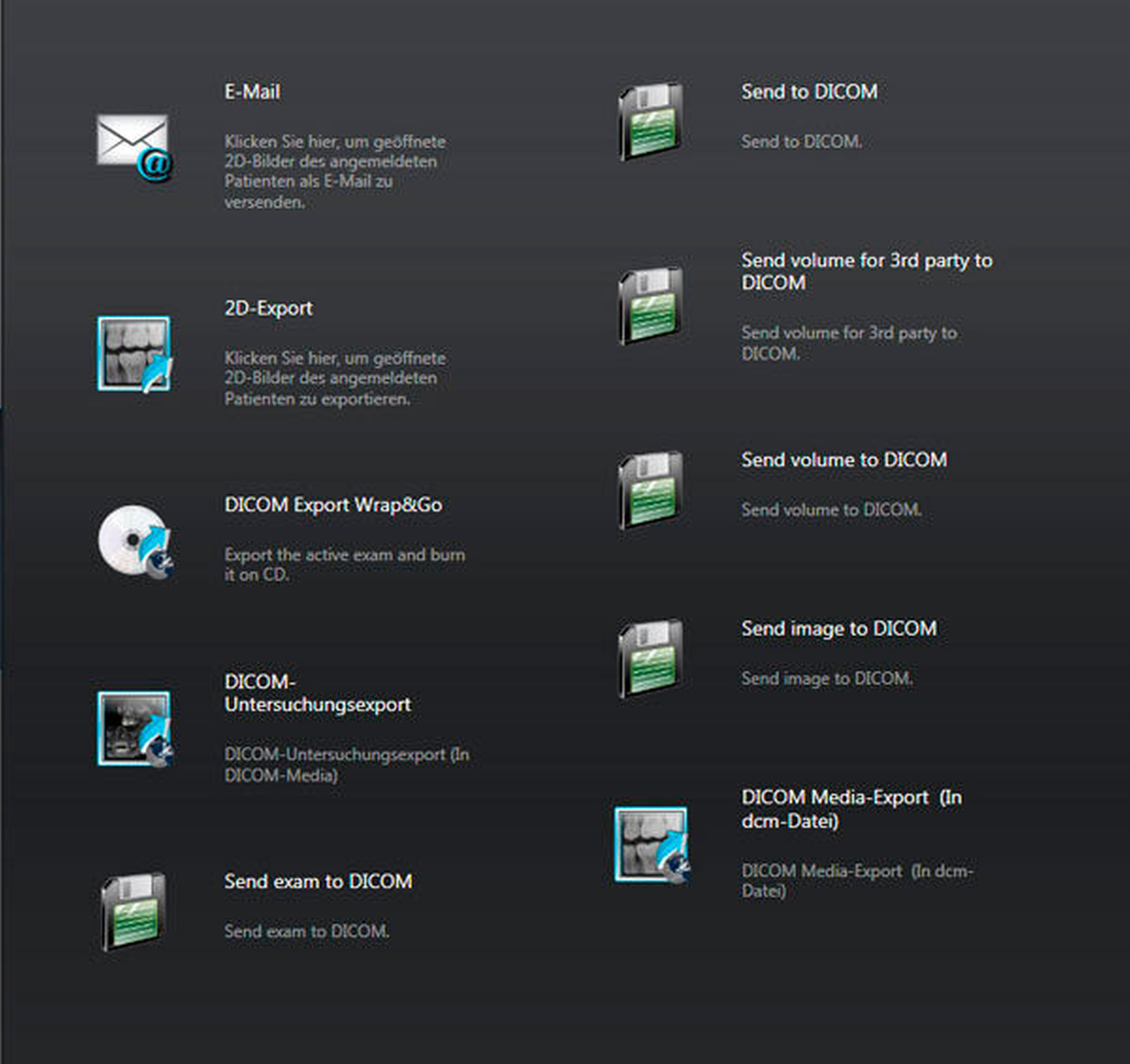 Für den gerne als praktische Lösung empfundenen Versand von digitalen Röntgenbildern per E-Mail halten die Röntgenprogramme in der Regel eine Funktion bereit, die Röntgenbilder mehr oder weniger komprimiert und mit mehr oder weniger Bild- und Patienteninformationen sendefertig macht. Diese oft als Default-eingestellte Lösung hat aber den Nachteil, dass der Datenschutz nicht eingehalten wird und die Datei streng genommen nicht befundungsfähig, weil komprimiert ist. Man könnte die Bilder als anonymisierte DICOM®-Dateien versenden, das ist aber in vielen Praxen noch nicht bekannt und führt beim Import eines solchen Fremdbildes vom Kollegen oft zu der Beschwerde, man könne das Bild nicht öffnen. Die Vielfalt der Möglichkeiten, Bilder zu exportieren, kann man in Abbildung 12 erkennen. Was hinter den jeweiligen Buttons steckt, welches Dateiformat also generiert wird, erschließt sich aber nicht ohne Weiteres.